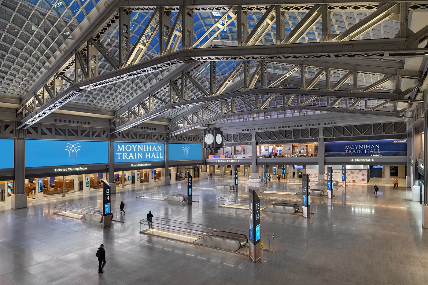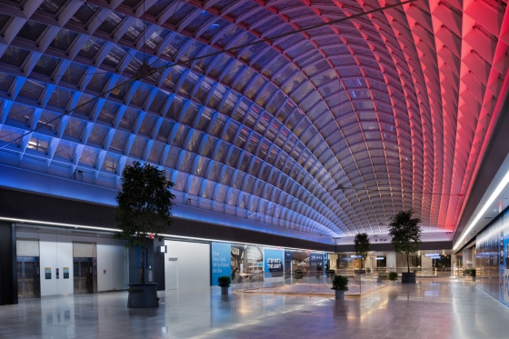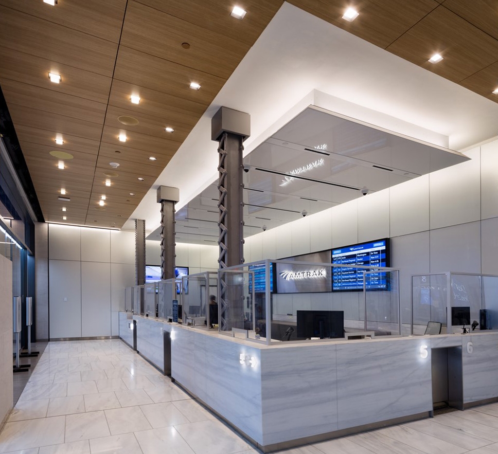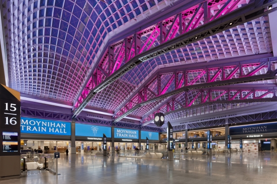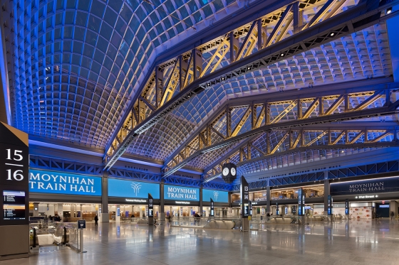 Entry DescriptionFrom darkness into light: this former postal facility, shrouded since WWII, beckons travelers into spacious daylit volumes and where, at night, color comes out to play. Seven years’ effort on the designers’ part and extensive coordination with stakeholders result in a design that adapts seamlessly to the significant presence of natural light and transforms the great hall to nighttime vibrancy. Daylighting studies identified the potential for extreme contrast between the skylit halls and adjacent low-ceilinged spaces. Consequently a lighting control system was specified to automatically minimize luminance ratios. Linear lighting frames the skylights and continuously adapts to the intensity and color temperature of natural light, supporting circadian rhythms. During the day the station’s airy elegance is evident; at night the lighting artistry reveals itself. Systems of truss-mounted RGBW uplights work in concert with façade washing to articulate structure while maintaining visual transparency to the sky beyond. Subtle as daylight fades, bold colors celebrate the trusses and purlins. Scenes are orchestrated to mark holidays or local events: art and function in perfect balance.