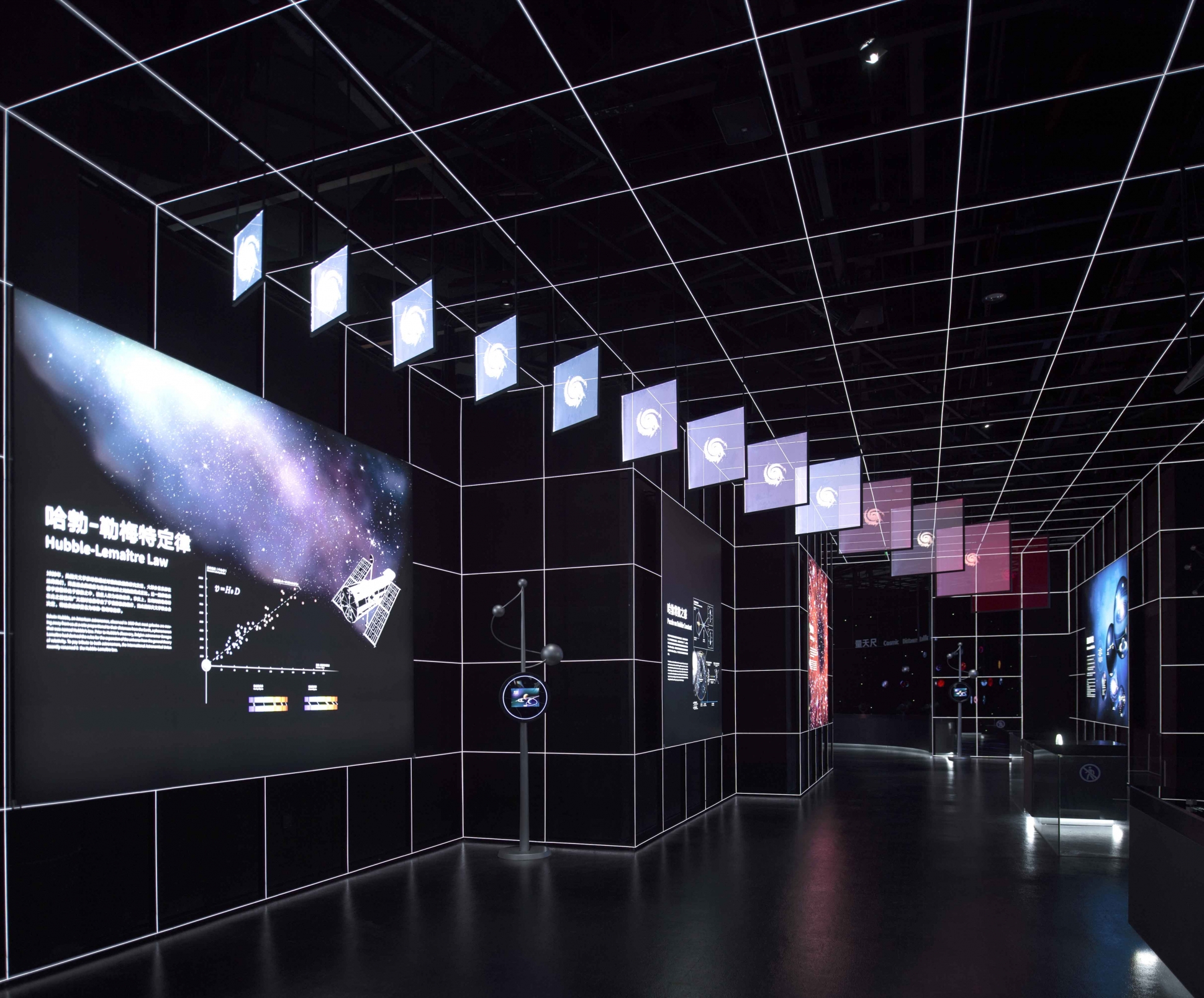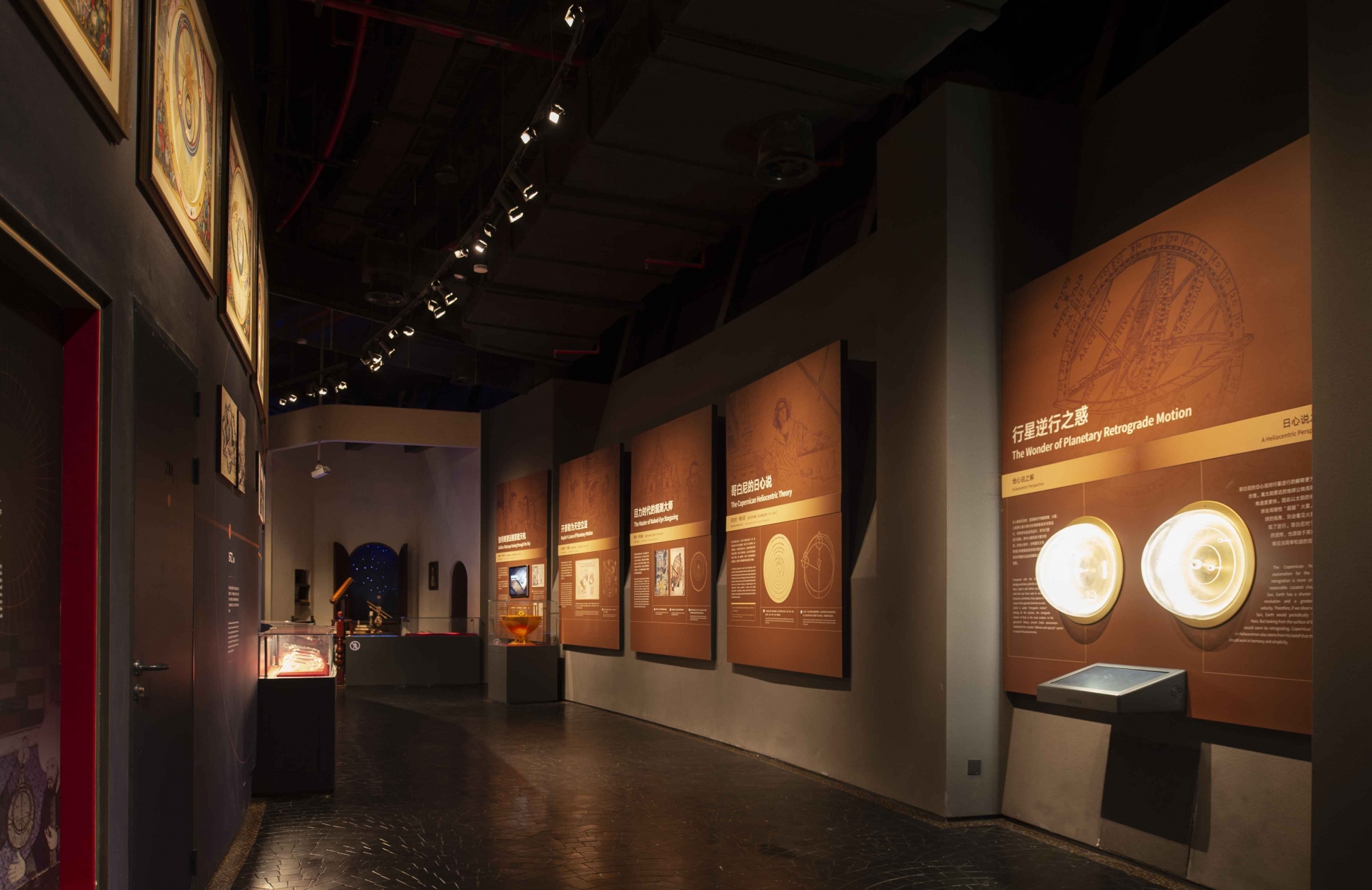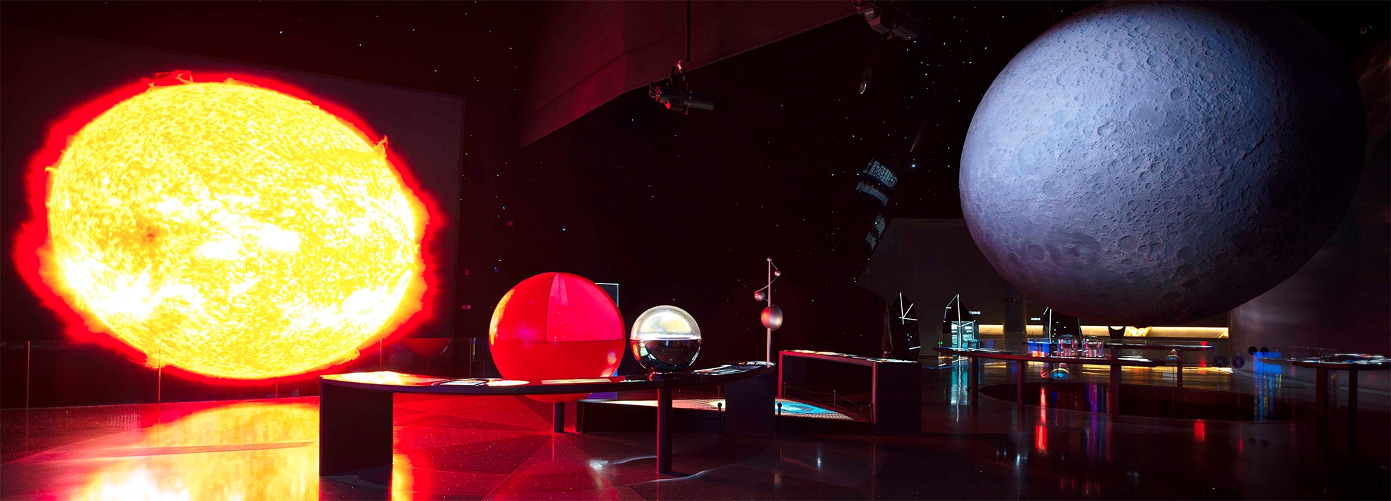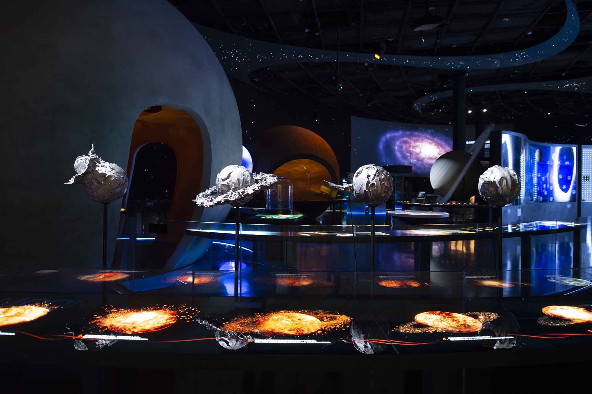 Entry DescriptionThe exhibition in Shanghai Astronomy Museum is divided into three areas:“Homeland”,“Universe”and“Journey”.The lighting uses the separation effect of"black space"to blur the boundary of the space;it uses the contrast of color temperature and brightness to guide the circulation and express the spatial sequence;it uses the accent light to create the visual focus,and the background light to create the environmental atmosphere.The graphic content is expected to create a comfortable reading experience, but the exhibits are not. Especially for the exhibits suspended in the starry sky, such as aircraft, it is hoped to break through the limitation of environmental brightness with higher contrast and stand out, and create a dramatic conflict. The lighting of the aircraft is a difficult point in implementation. It is necessary to focus on lighting and not produce shadows to destroy the starry sky. In the end, the lighting filters are adjusted in slices. The light is only irradiated on the aircraft without overflow, and the shadow-free lighting effect is further enhanced the concept of "emptiness" in the vastness of the universe.