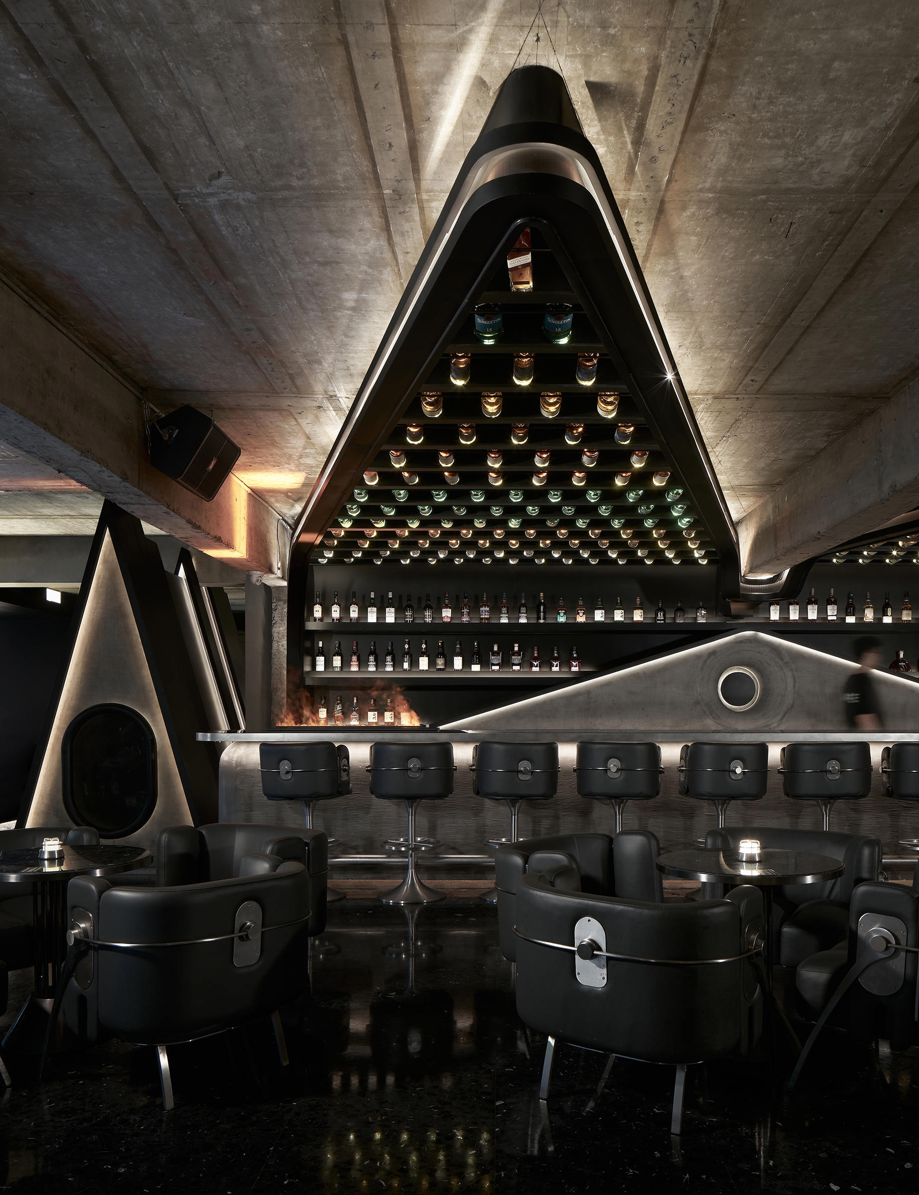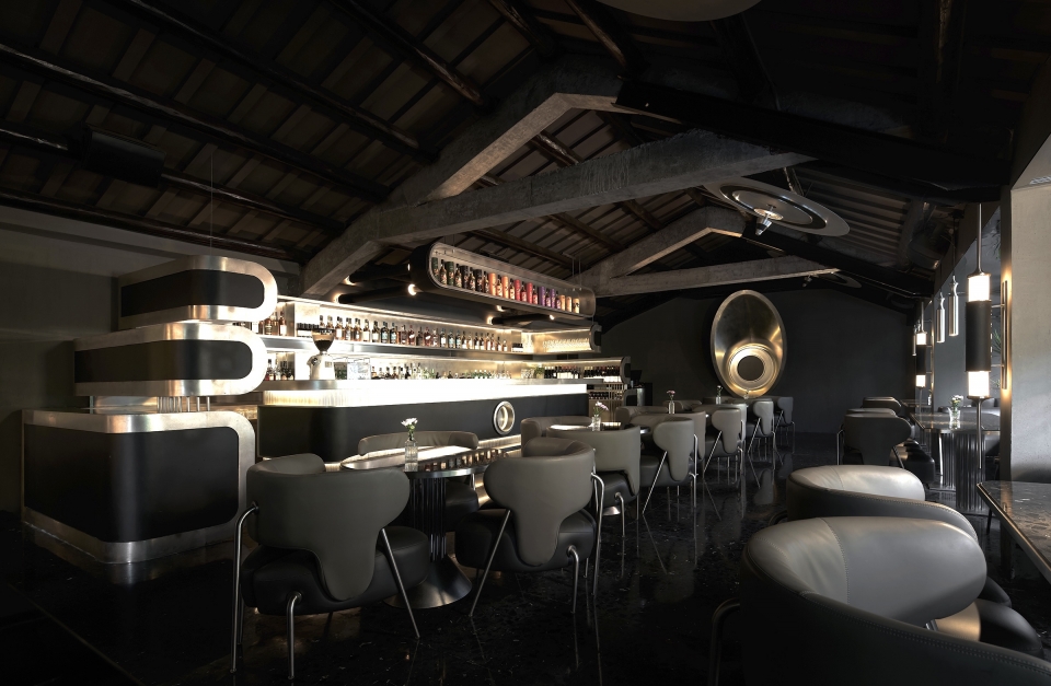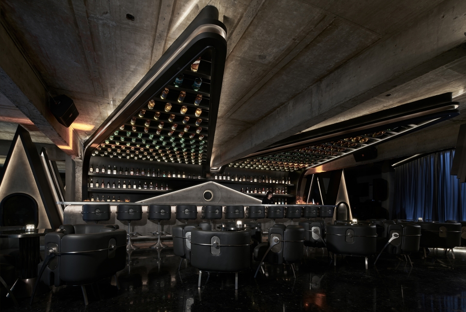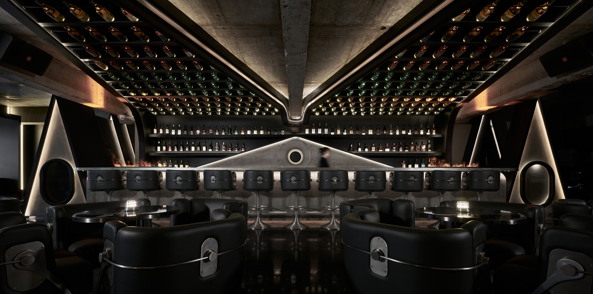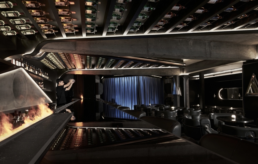 The lighting is meticulously integrated into the architectural and installation modelling structure. The main activity area of the first floor is surrounded the core bar area, the metal iron wine cabinet display rack and the ceiling shape are cleverly connected together. By carrying decorative lighting makes the regional space full of playfulness. A backlight strip is used to depict the shape of the entire wine cabinet from ceiling, allowing the entire shape to separate from the wall, adding a sense of floating and lightness to the entire shape; meanwhile, on the bottom of each wine use a single LED dot to light up the bottle of wine which shows the transparency and colour of the glass bottle.