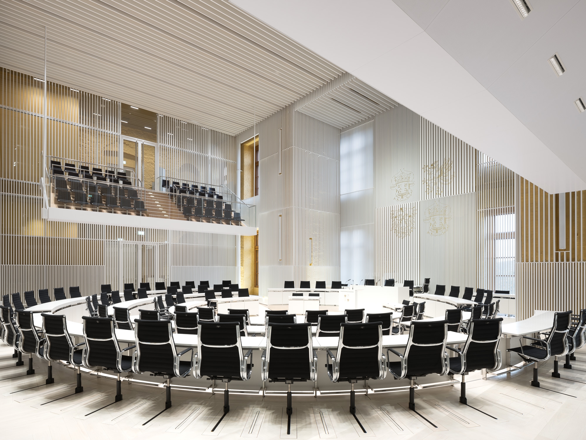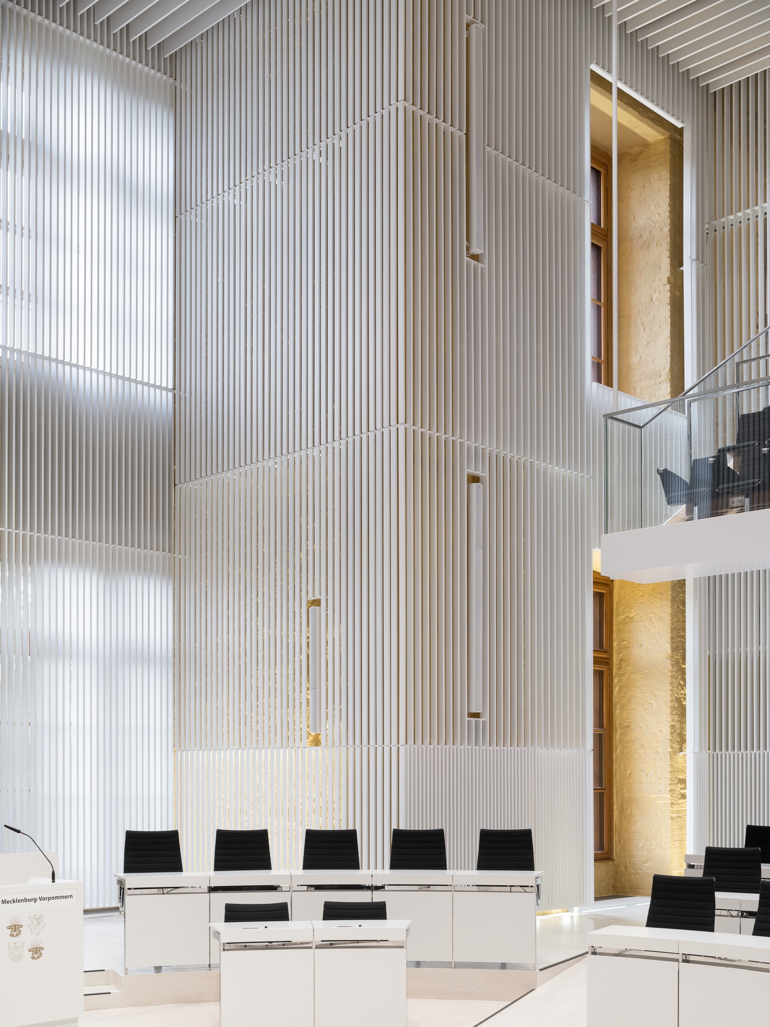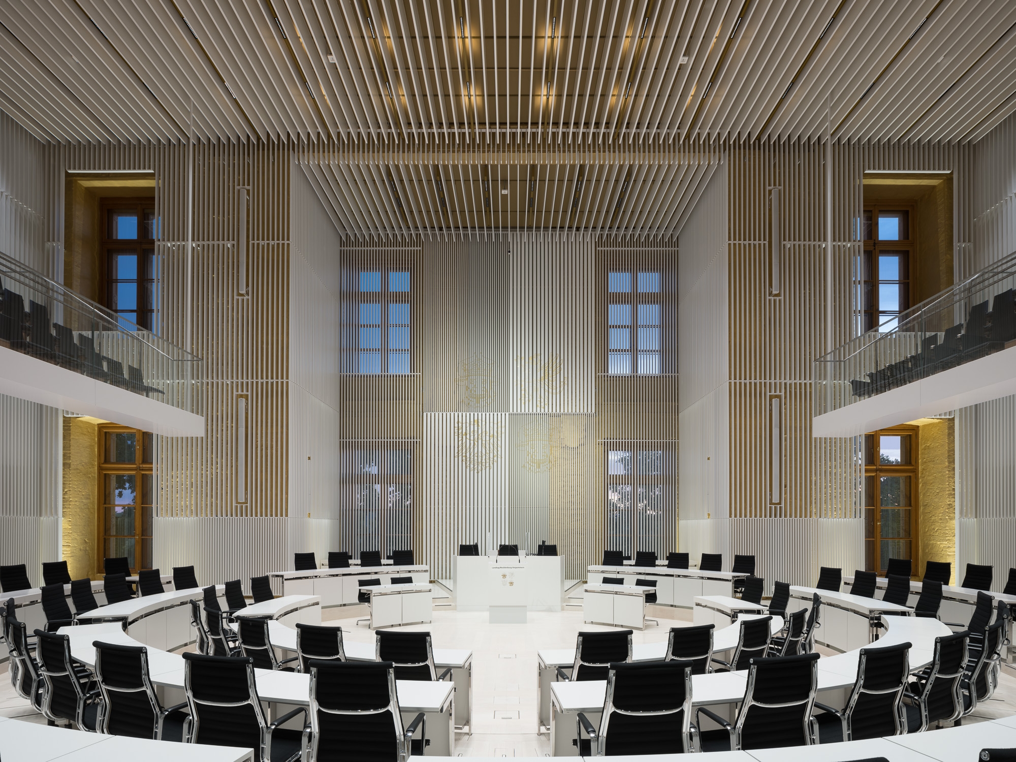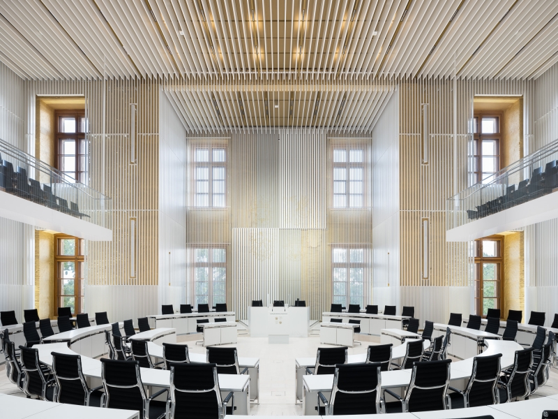 Entry DescriptionIn the course of the general renovation of the Schwerin Castle, the former ballroom has been redesigned and transformed into a functional plenary hall for the state parliament. The former ballroom with the adjoining conference, lobby, visitor and press areas have been reinterpreted in a contemporary way and restores the original room proportions of the “Golden Hall”, which was destroyed by fire in 1913. The design concept underlines the historical spatial references as well as the original routes and visual axes. The architecture-integrated, three component lighting concept provides a flexible lighting system that can be individually adapted to the respective room usage, creating a functional and emblematic dynamic at the same time. Between the slats, both direct and indirect LED lights are arranged in a uniform grid and integrated into the ceiling to enable homogeneous lighting of the room. Lights positioned on the side walls support the spatial effect by giving the lamellas a distinct three-dimensional effect through backlighting. The visitor and press seating areas are integrated into the plenary hall as balconies and are illuminated by LED lights in the suspended ceiling.