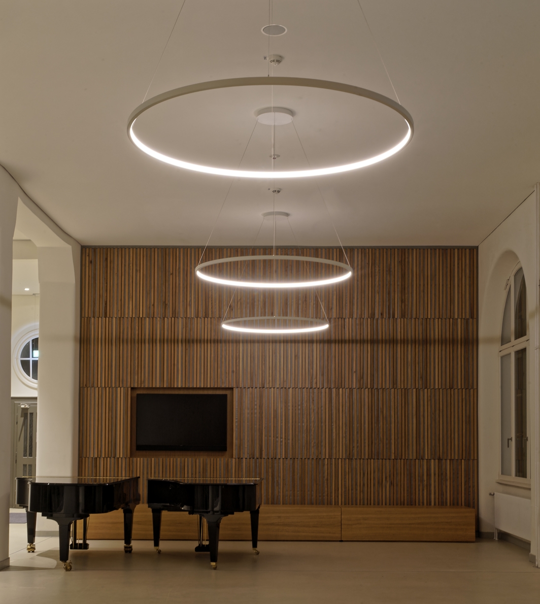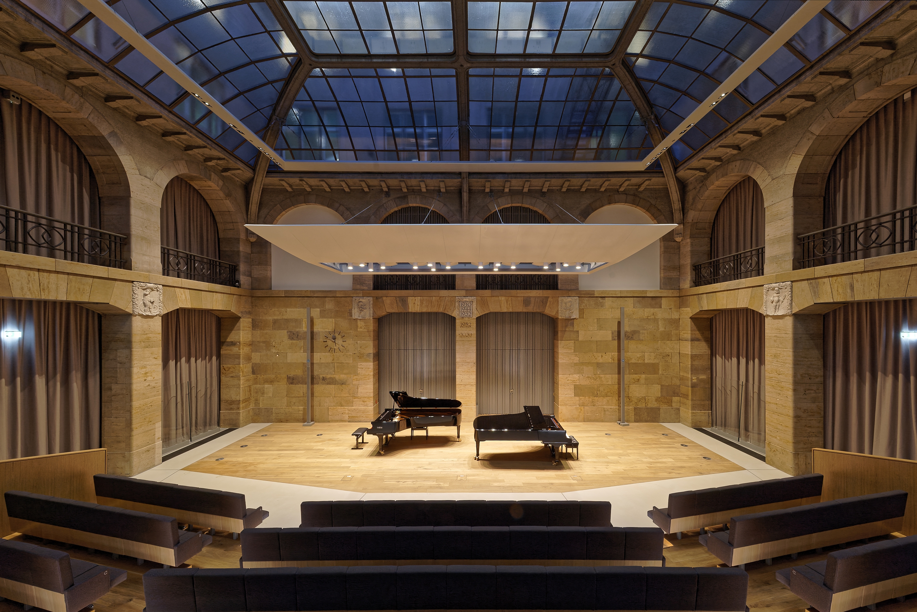 Light stages the room, light creates acceptance. This is how the new lighting concept for the concert hall should be described. The room fascinates by its structure and openness. It provides insights and views. Its materiality is readable and allows for self-interpretation. In order not to disturb the atmosphere of the room, the lights are placed outside. Just as daylight enters the room through the room-spanning glass roof, artificial light takes over this part at night. The room remains free of luminaires. The vertical room structure fascinates with the texture of natural stone. The light -integrated in the acoustic reflector- draws soft wall gradients, with an optimal color saturation. The light color as an indicator of room acceptance.
