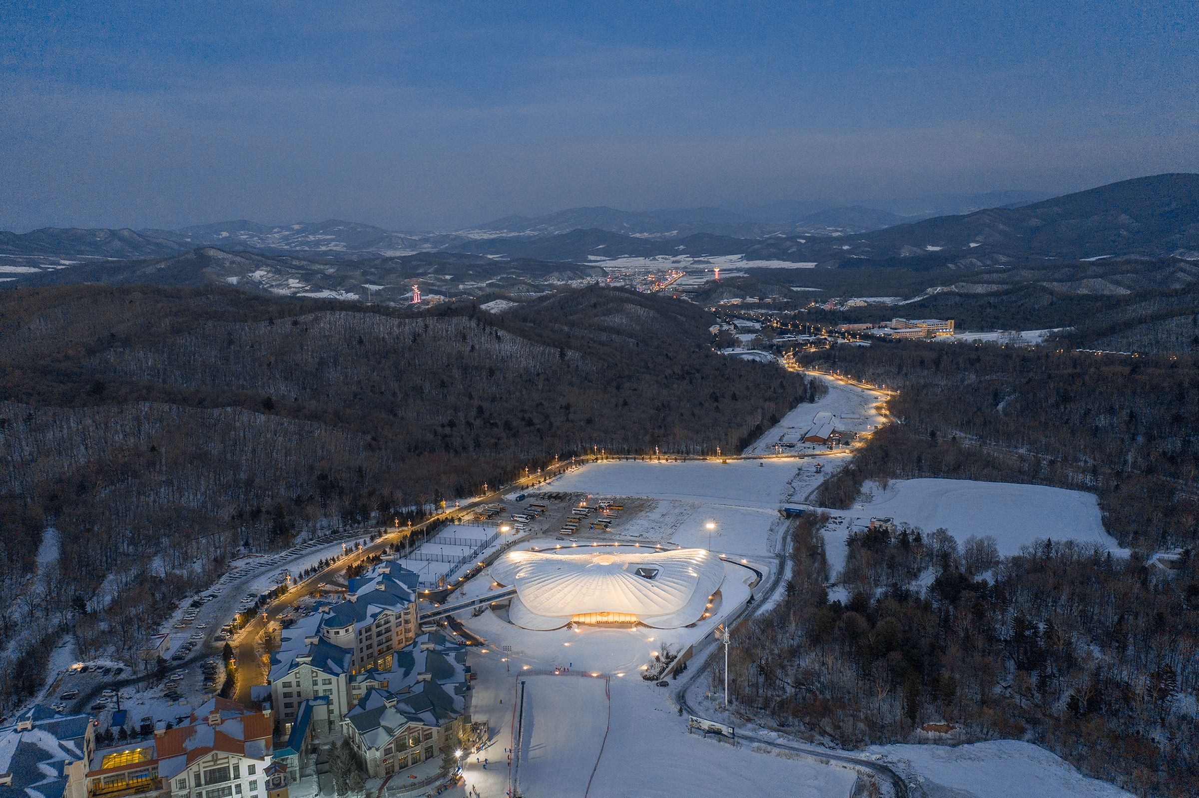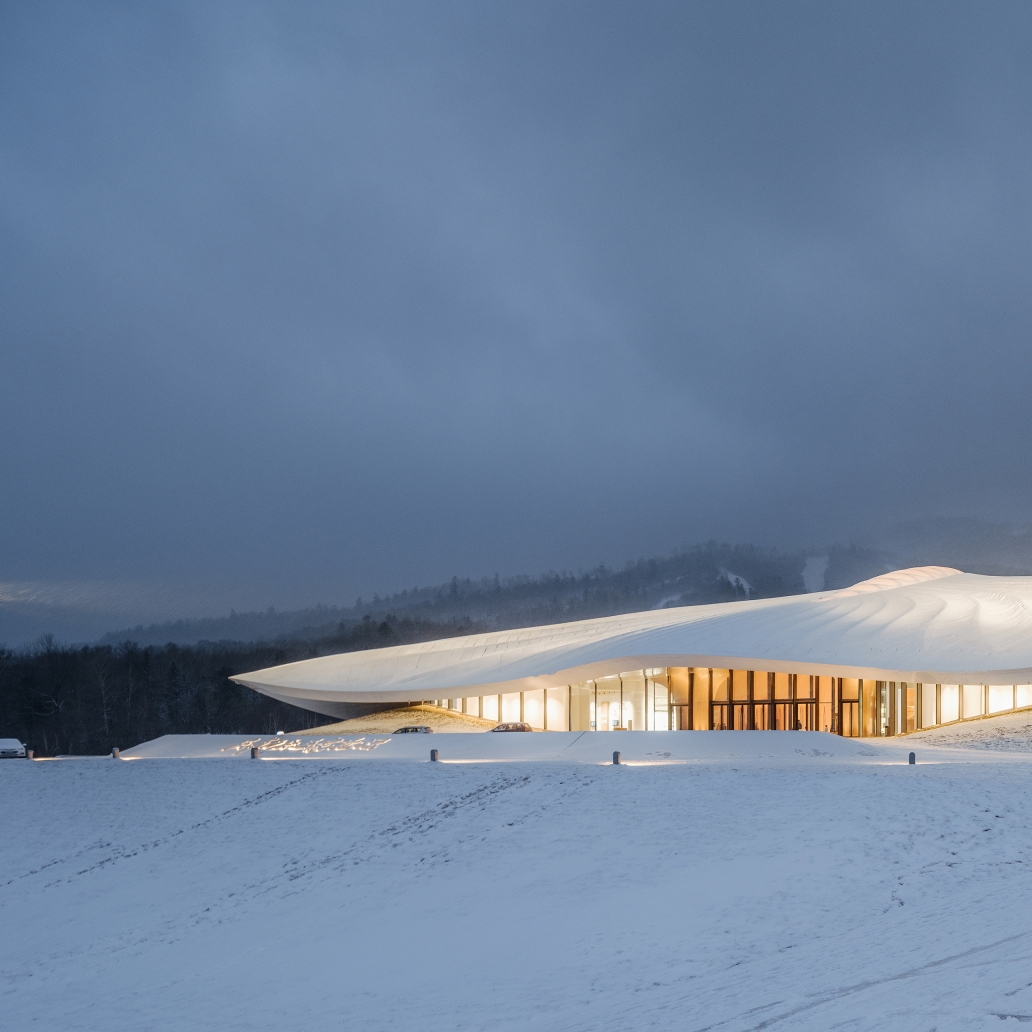 The natural pure white building stands at the foot of the snow mountain, surrounded by virgin forest and snow field. The enormous roof disappears in the original snow land, far away from the bustling and noisy city, but flashing the atmosphere of the north ice and snow world.