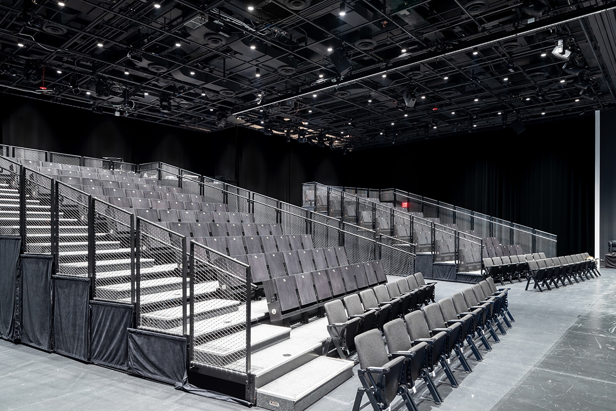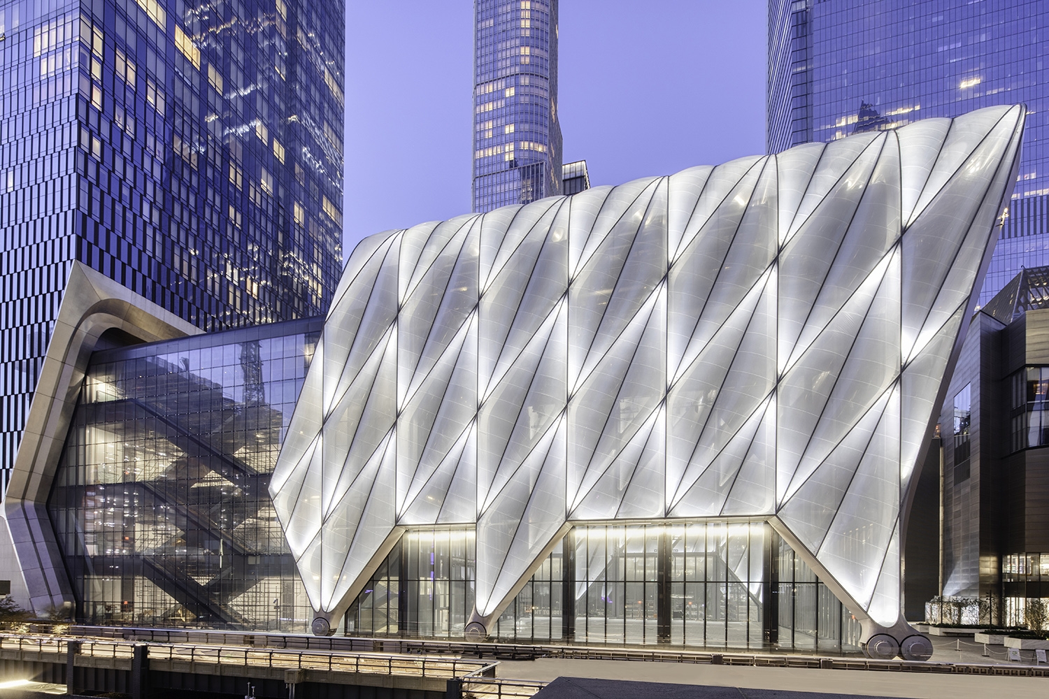An iconic ETFE structure nests around the building with the ability to deploy out over an open plaza to form an additional, large-scale performance venue. Due to the high reflectivity and transparency of the ETFE material, the Shed is softly illuminated by a series of individual LED accentlights recessed at the apex of each structural member that graze up the steel from the interior to provide an indirect glow at each ETFE pillow. This lighting effect is visible even when black-out shades are deployed for performances and when the shed is nested around the building.