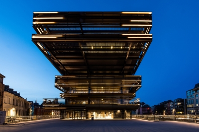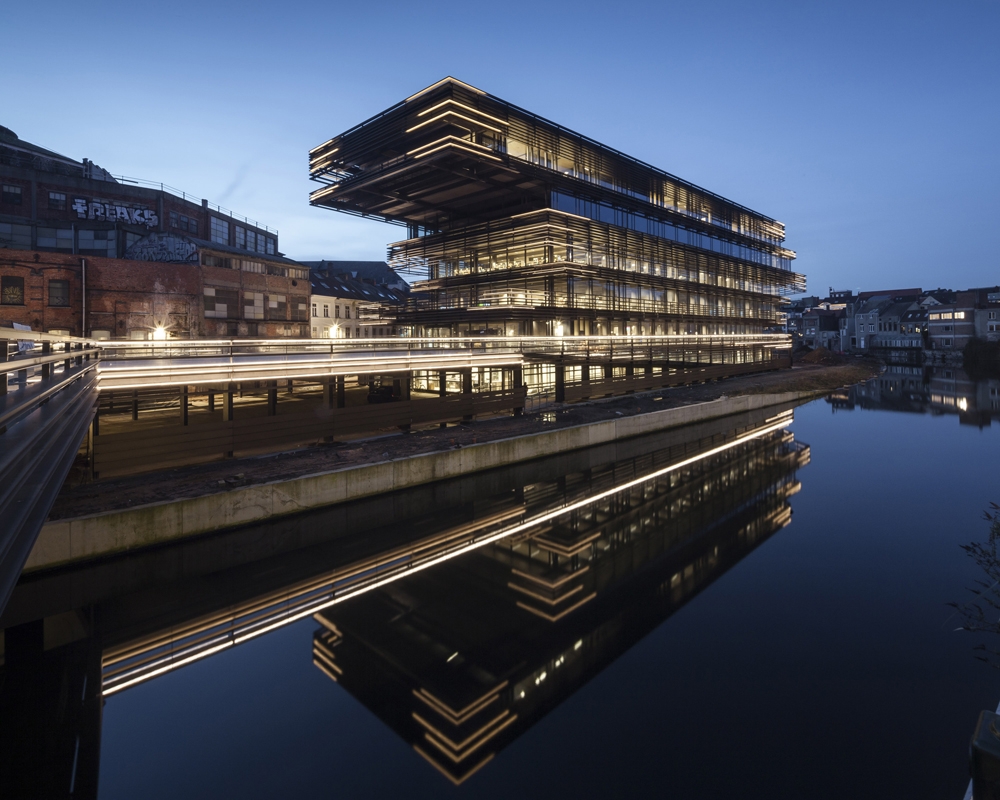 The lighting design takes into account the unique location and its reflection in the River Scheldt to produce a sensorial image emblematic of the city.