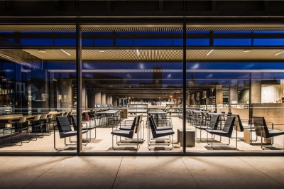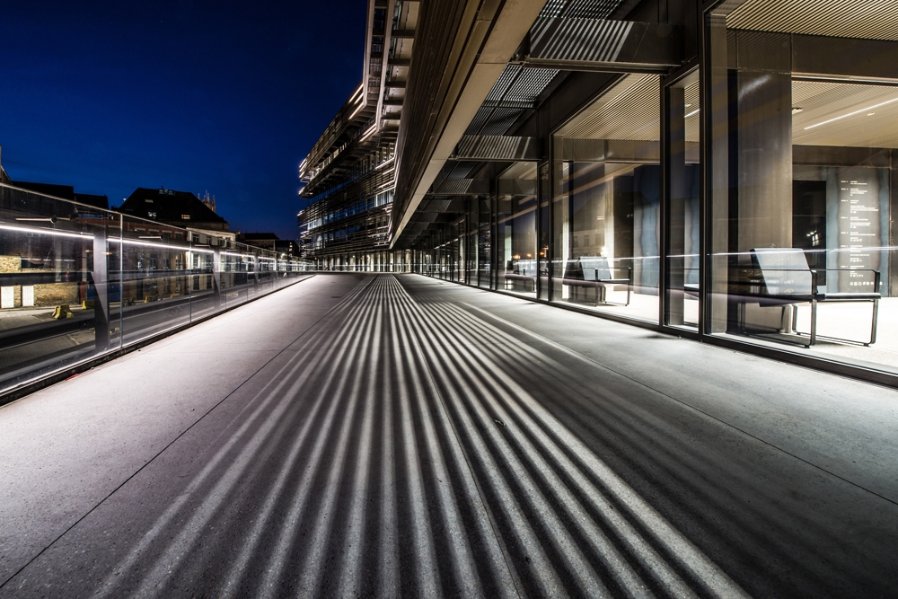 Inspired by the lines of lights from cars in long-exposure night shots, the external lighting was designed to highlight the linear dynamics of the building which rises parallel to the ground up to the top.