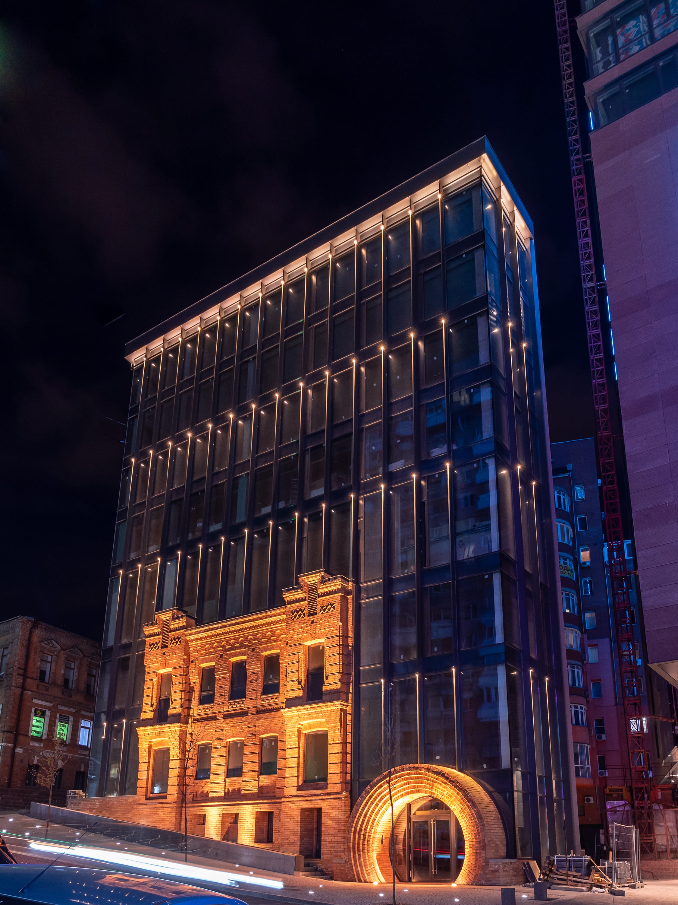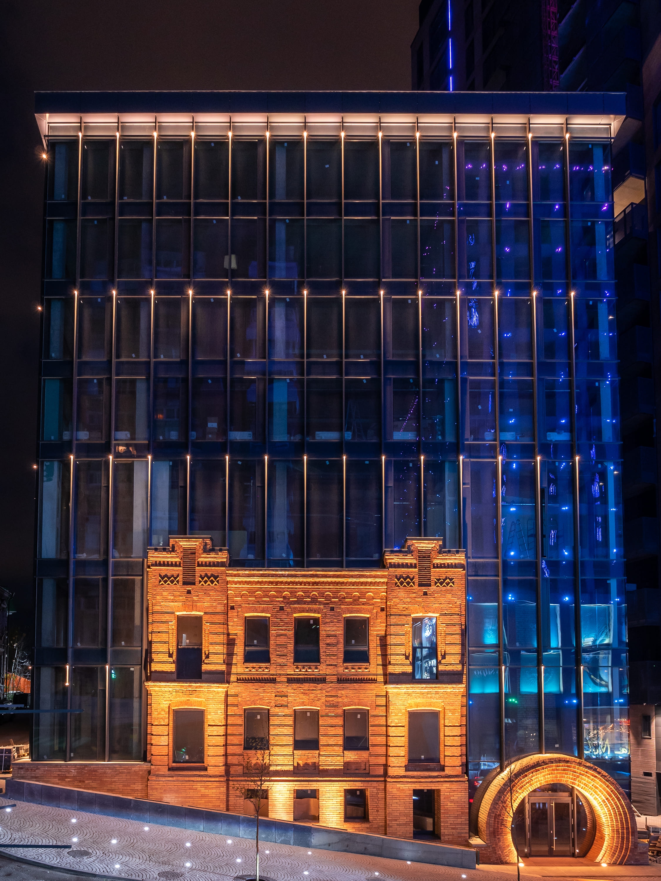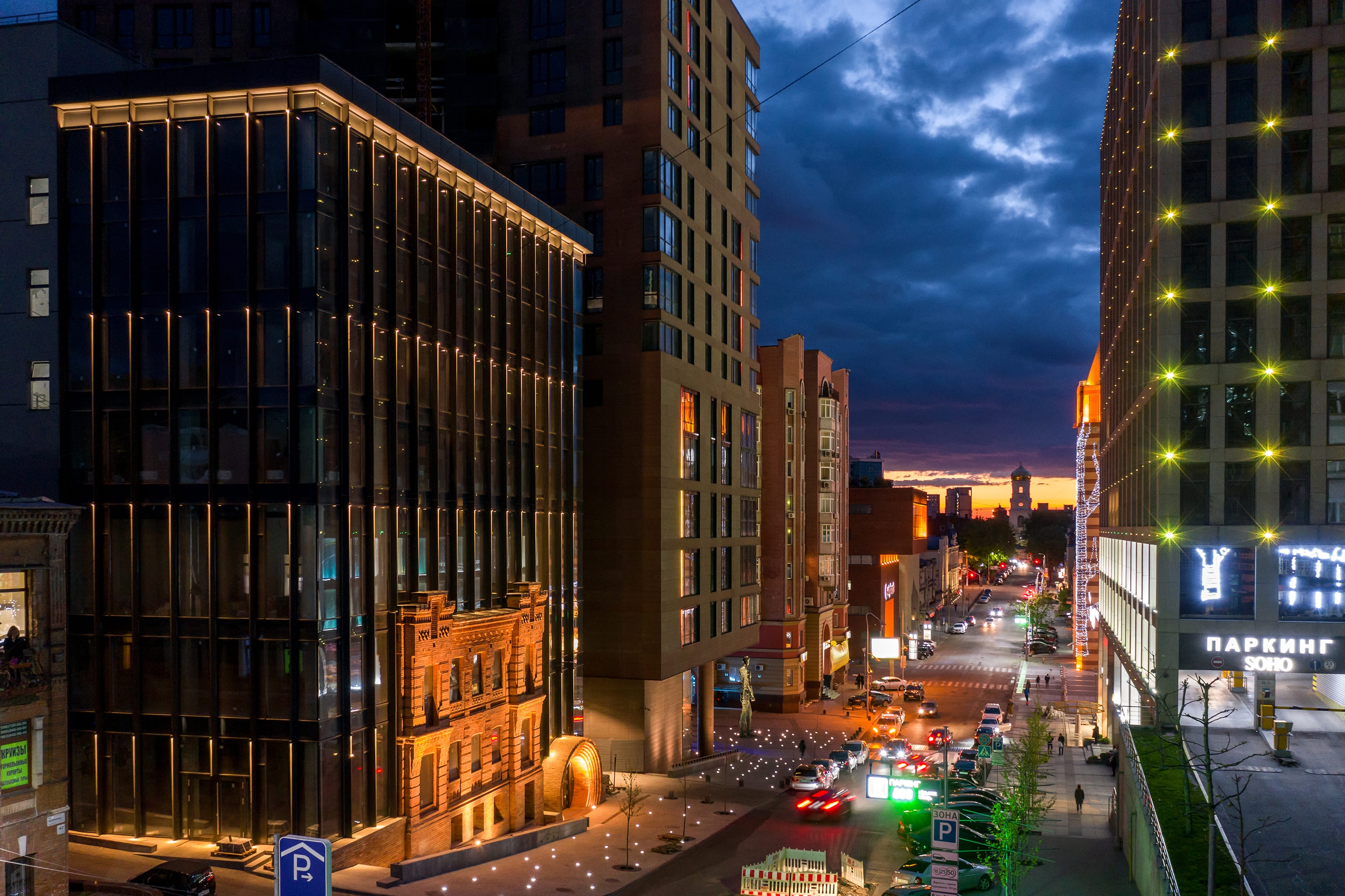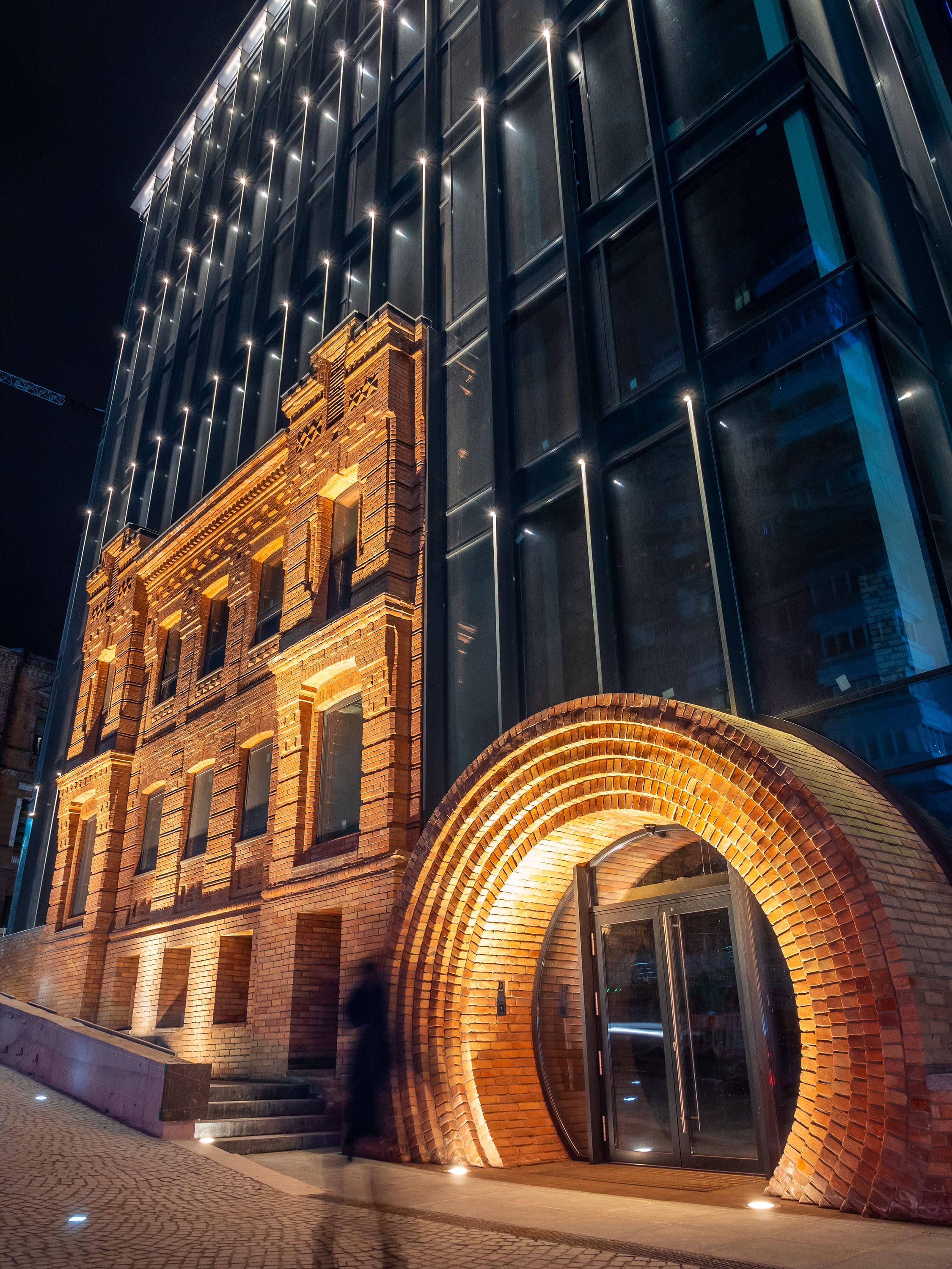 All backlighting is made in a single warm color temperature. At the same time, we chose different lighting for different types of facades: a solid glass facade is drawn with thin light beams that emphasize the verticals, and a brick fragment is illuminated with lamps with wider optics, flooding entire wall elements with light.