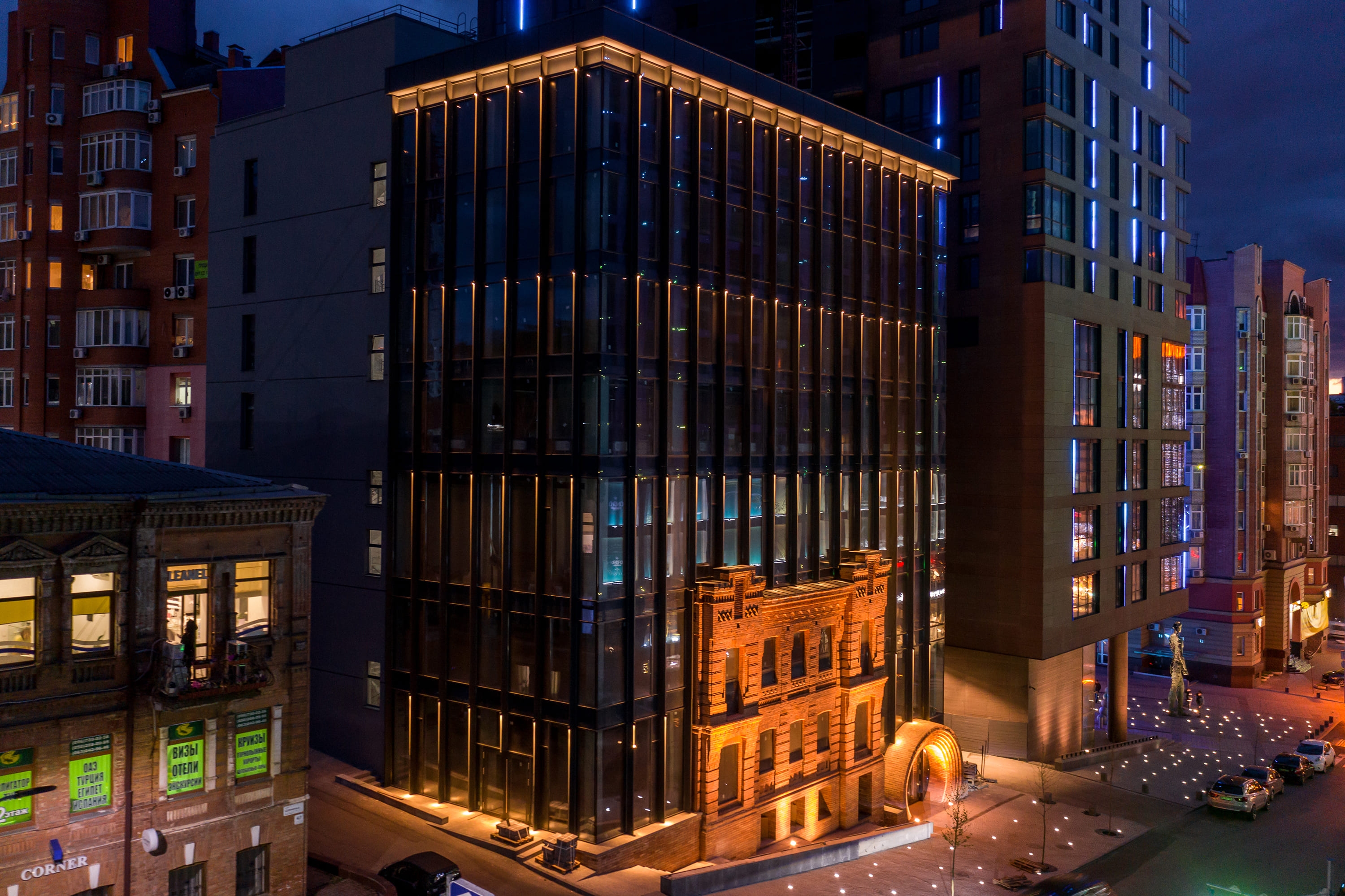 Contrastingly and gracefully, with the help of compact lamps with one-degree optics, the window imposts of the facade were emphasized with light, thereby revealing the glass.