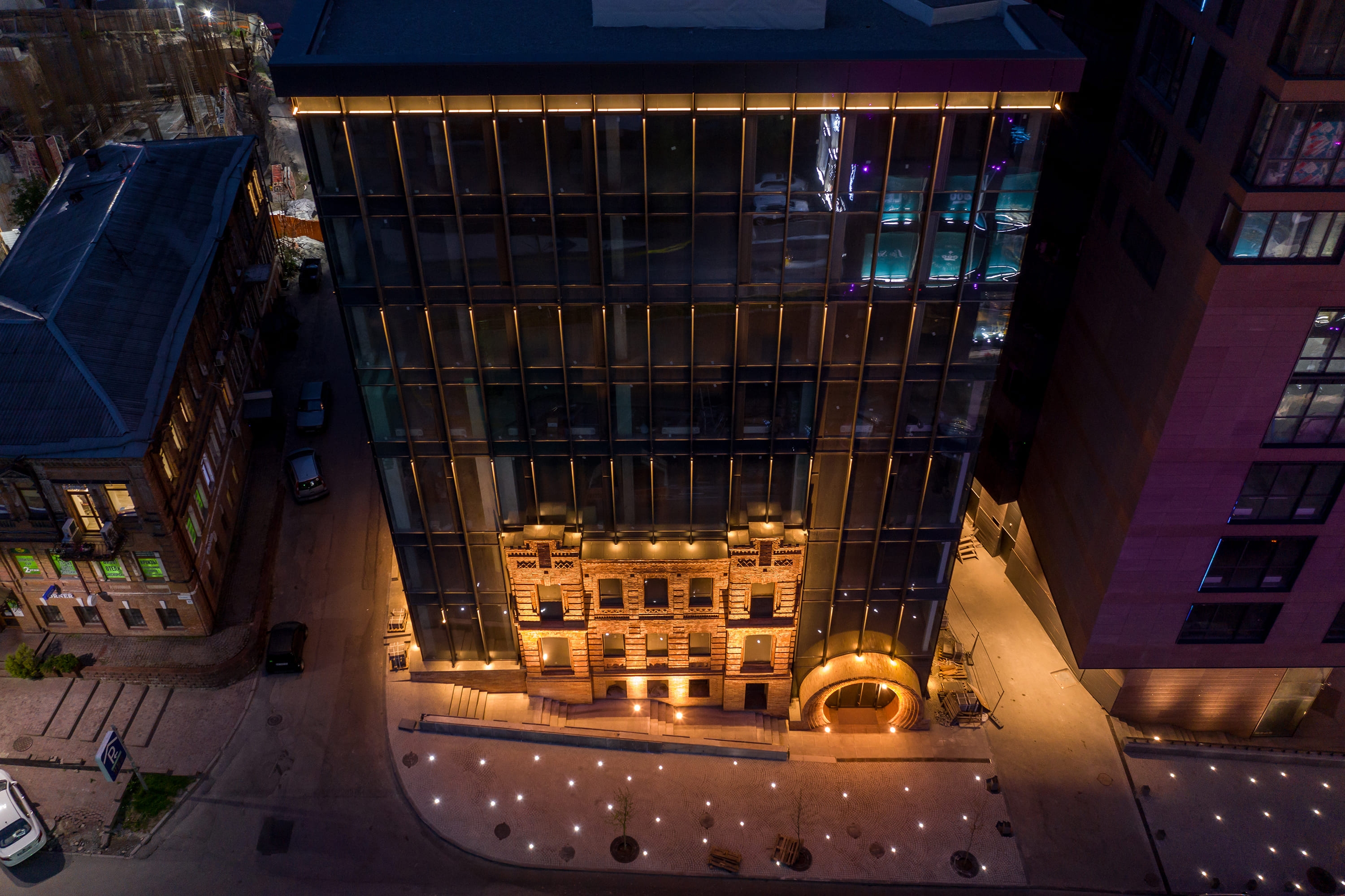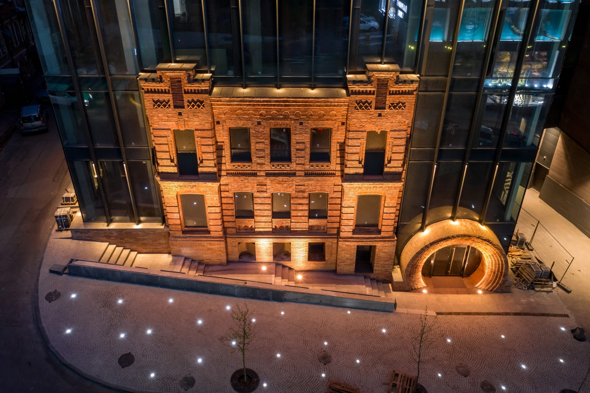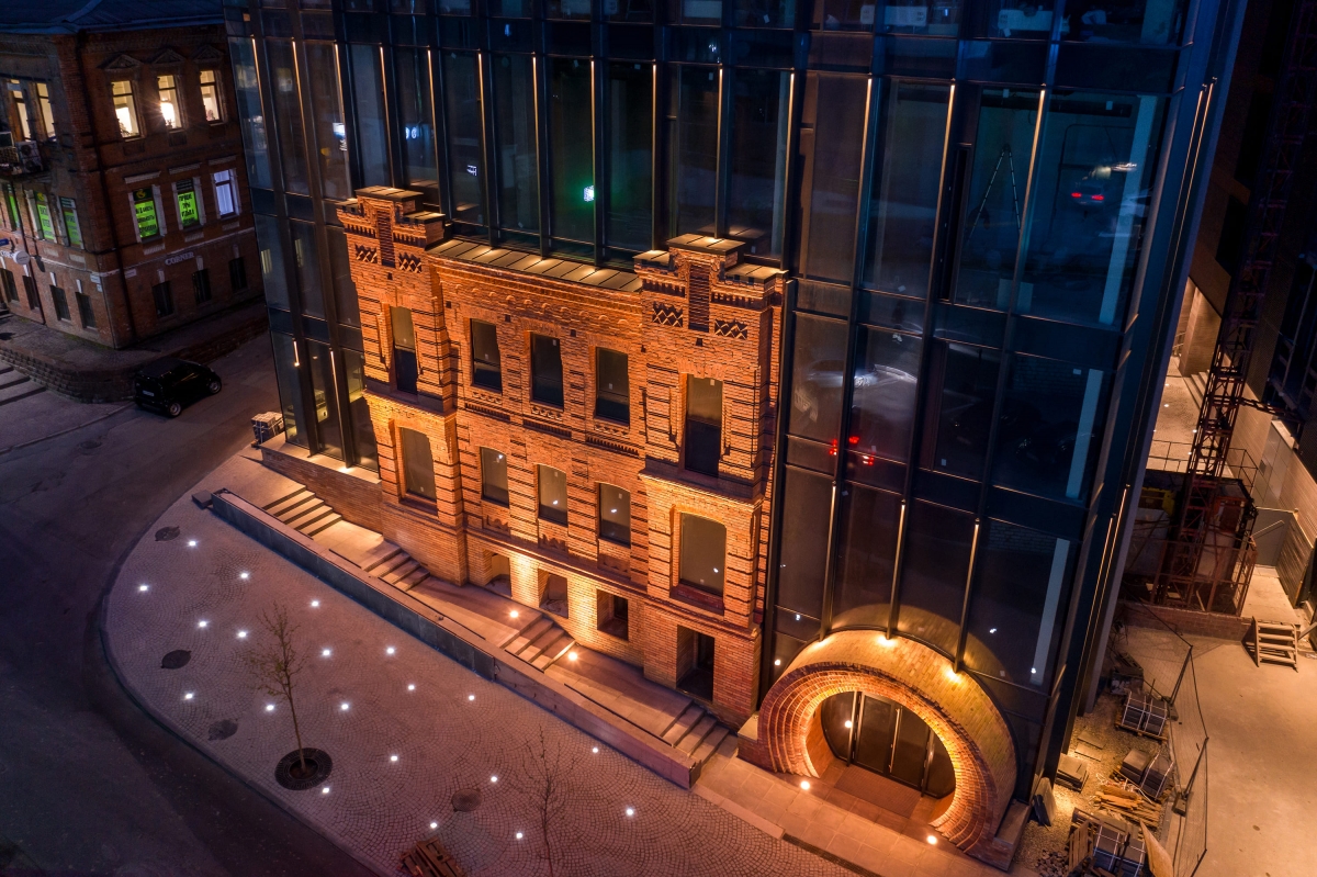 The architectural concept is based on the combination of a historical facade part and a modern glass one. Having preserved the old brick facade, the building was enlarged with a laconic glass extension.