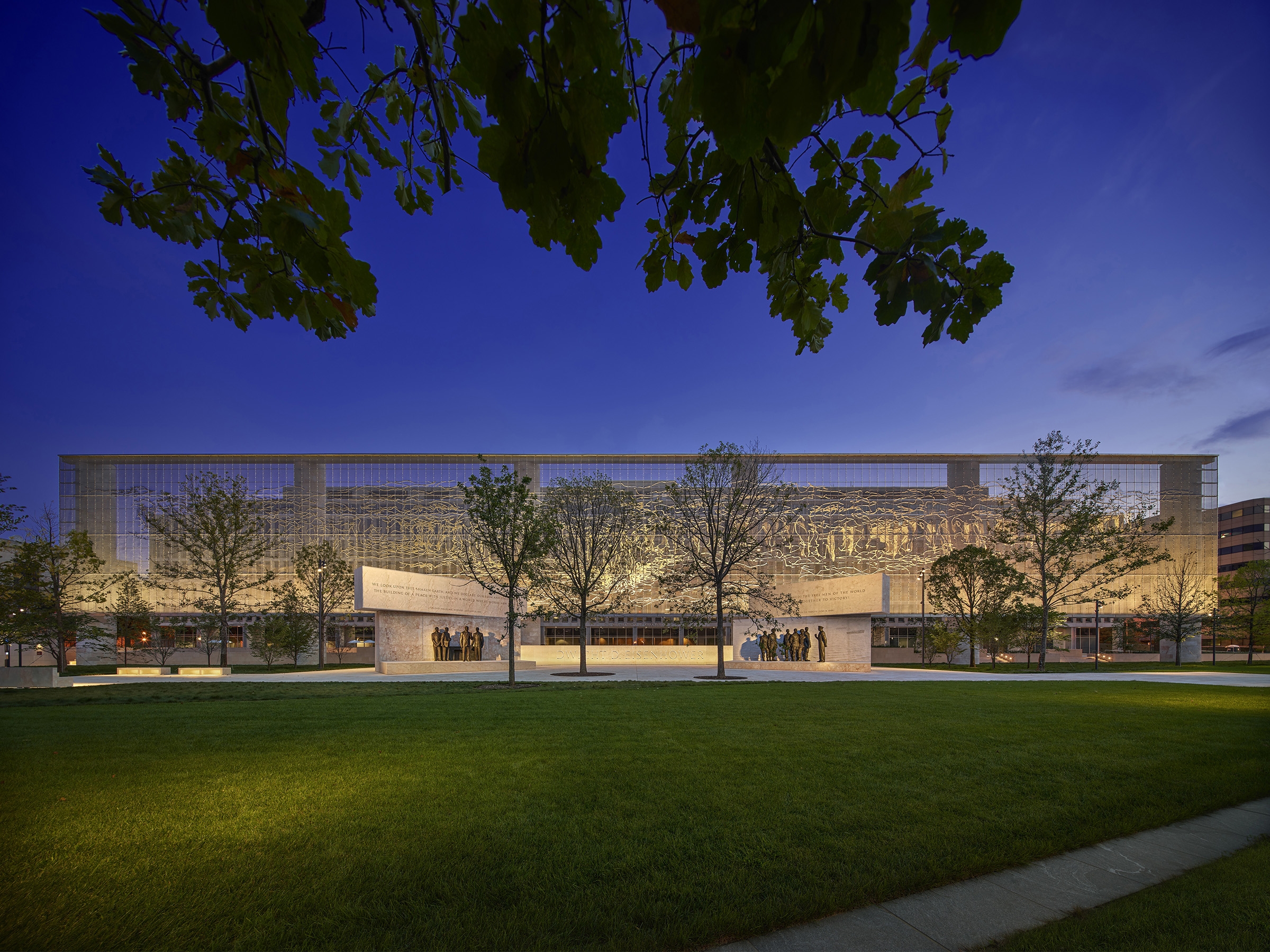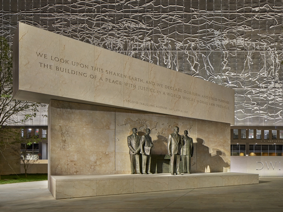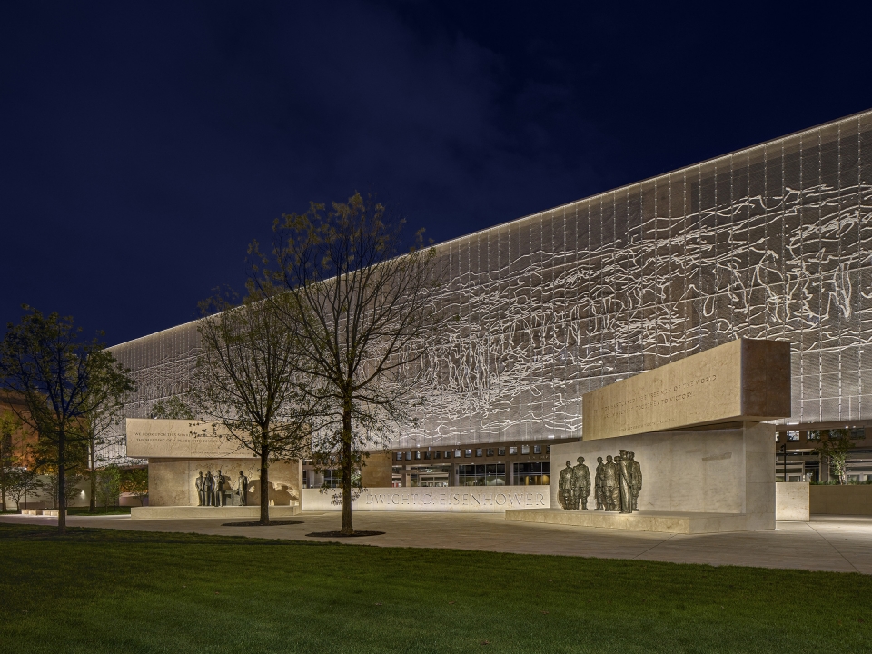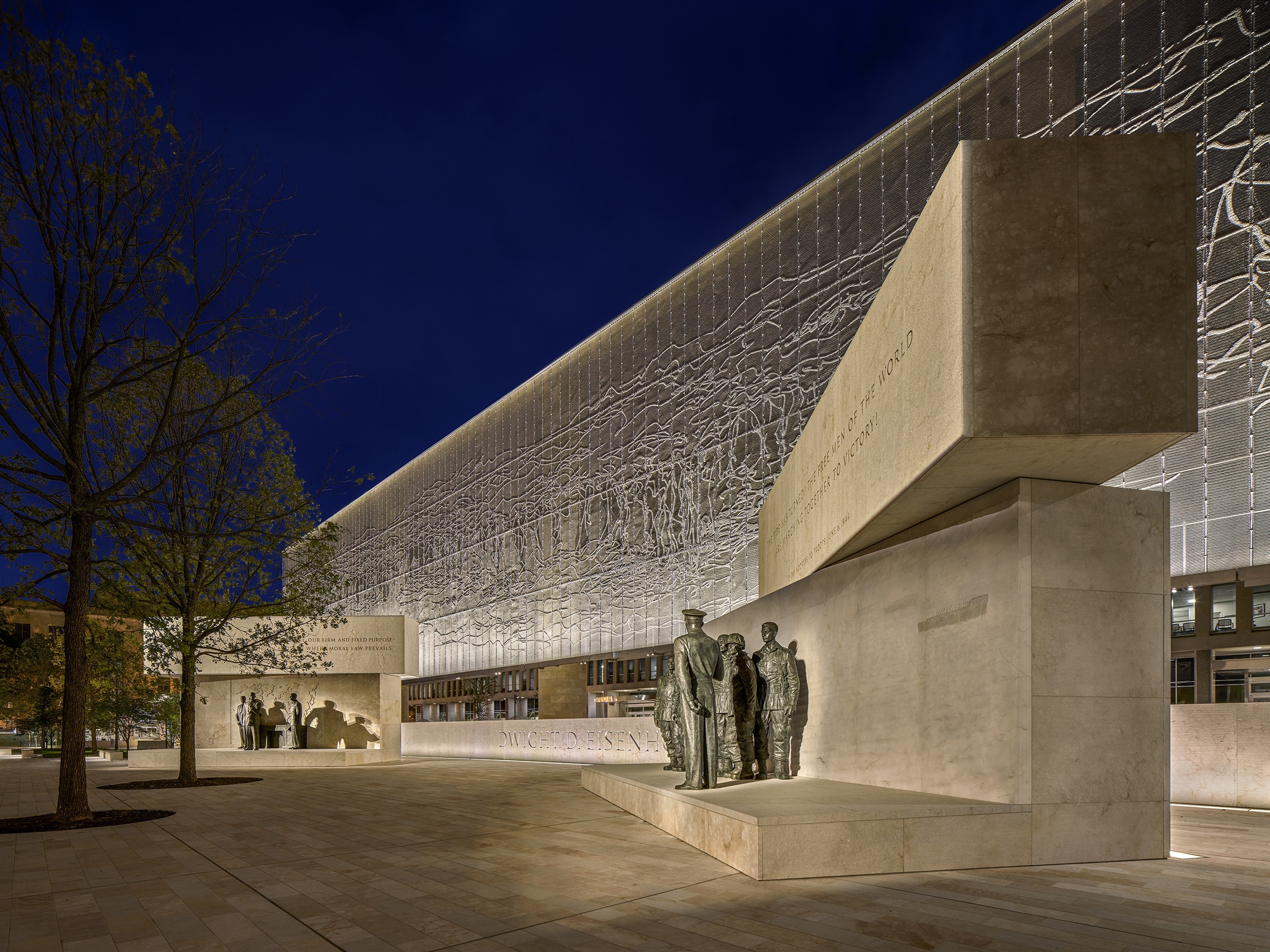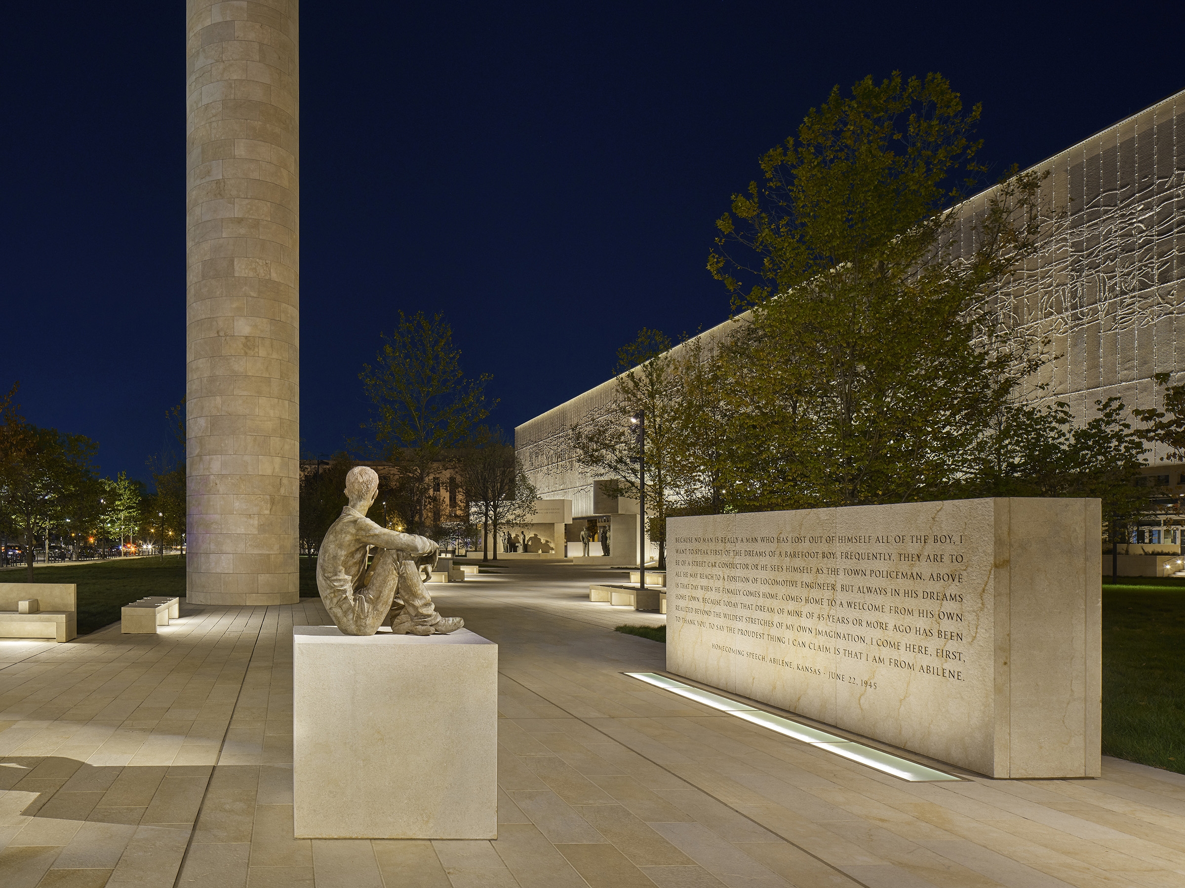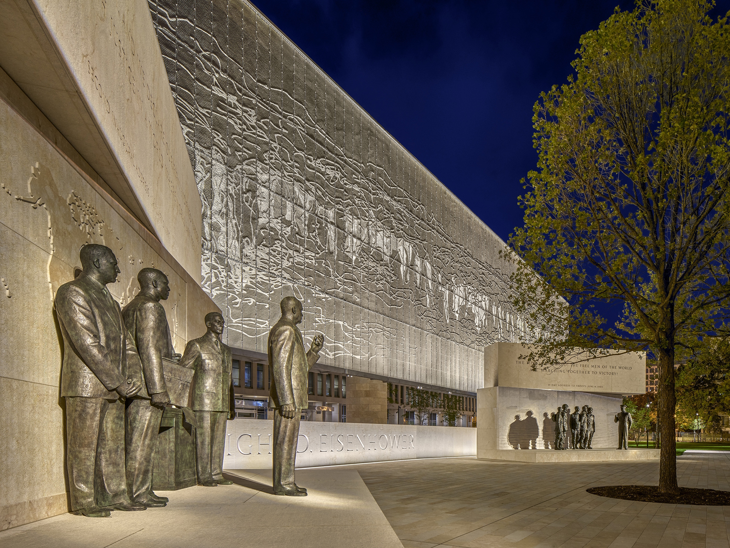 Entry DescriptionThe Dwight D. Eisenhower Memorial celebrates the life and accomplishments of the 34th President of the United States. Located at the center of a 4-acre landscaped plaza, the Memorial features a commemorative large-scale stainless-steel tapestry, bronze sculptures, and inscription wall. Lighting is closely interwoven with the design by Gehry Partners. L’Observatoire International was commissioned for a full scope of lighting design: illuminating the plaza and its pathways, the memorial core, and surrounding streetlighting.