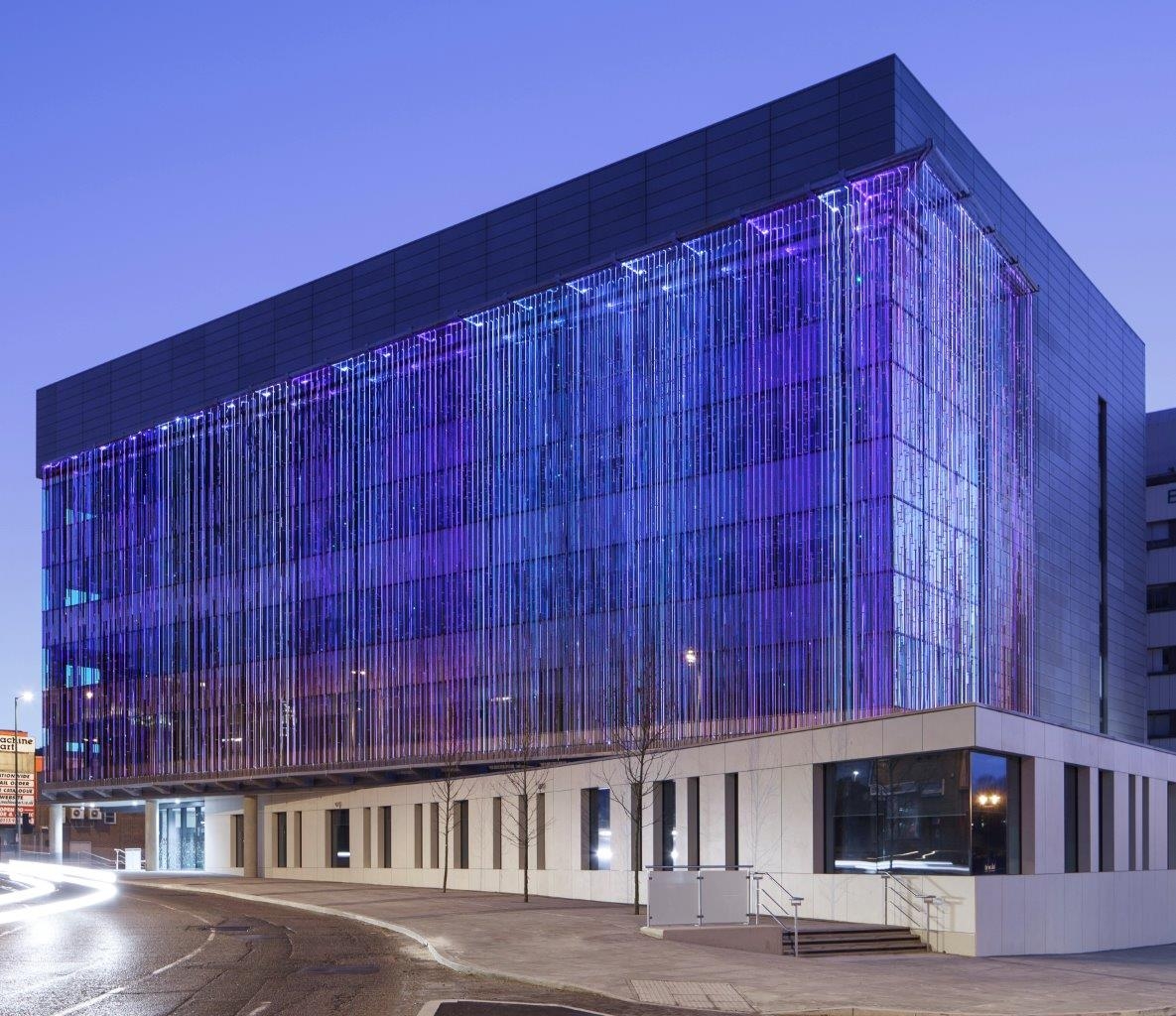 “The facade lighting is linked to two NASA satellites monitoring the surface of the sun for solar flare activity; the Corona sculpture expresses this energy through an ever-changing fibre optic lighting system, reflecting the sun’s activity in real time on the facade of the building. Colours evolve and transform over a 26½ day period – the time it takes the sun to rotate on its axis. The profile of the aluminium extrusions are informed by the negative spaces from lace samples contained within the Nottingham Trent University lace archive.”