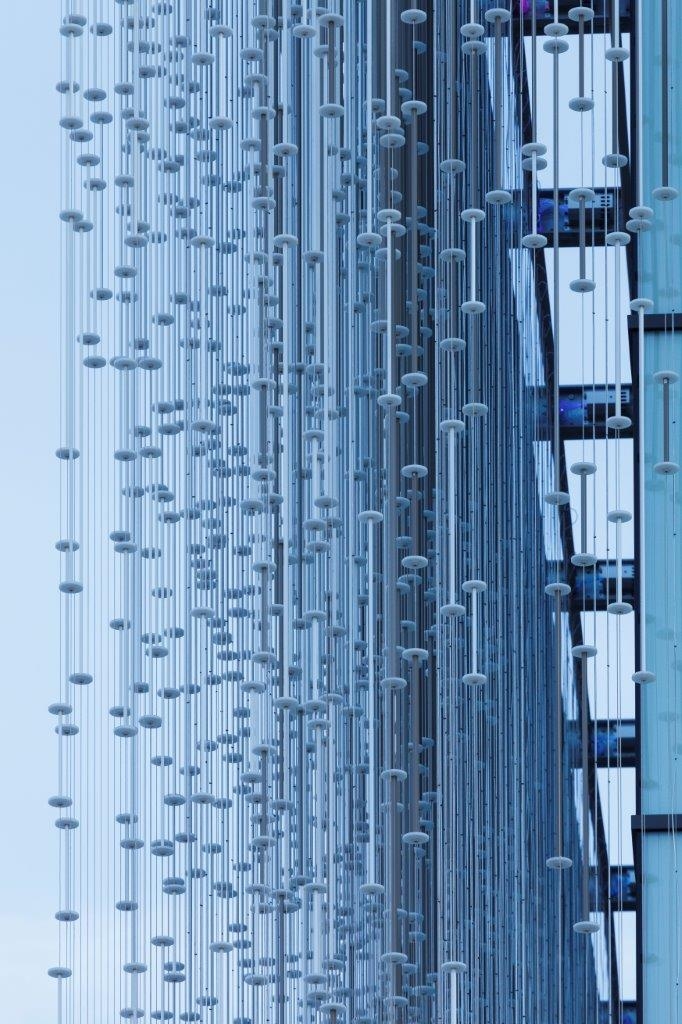 The installation covers a 50m x 17m area of the façade with 1160 aluminium extrusions. In amongst the extrusions are woven fibre optic tails which change colour according to the NASA data. The artwork also acts as a brise soleil to provide solar shading to increase the building performance and enhance comfort for the users.