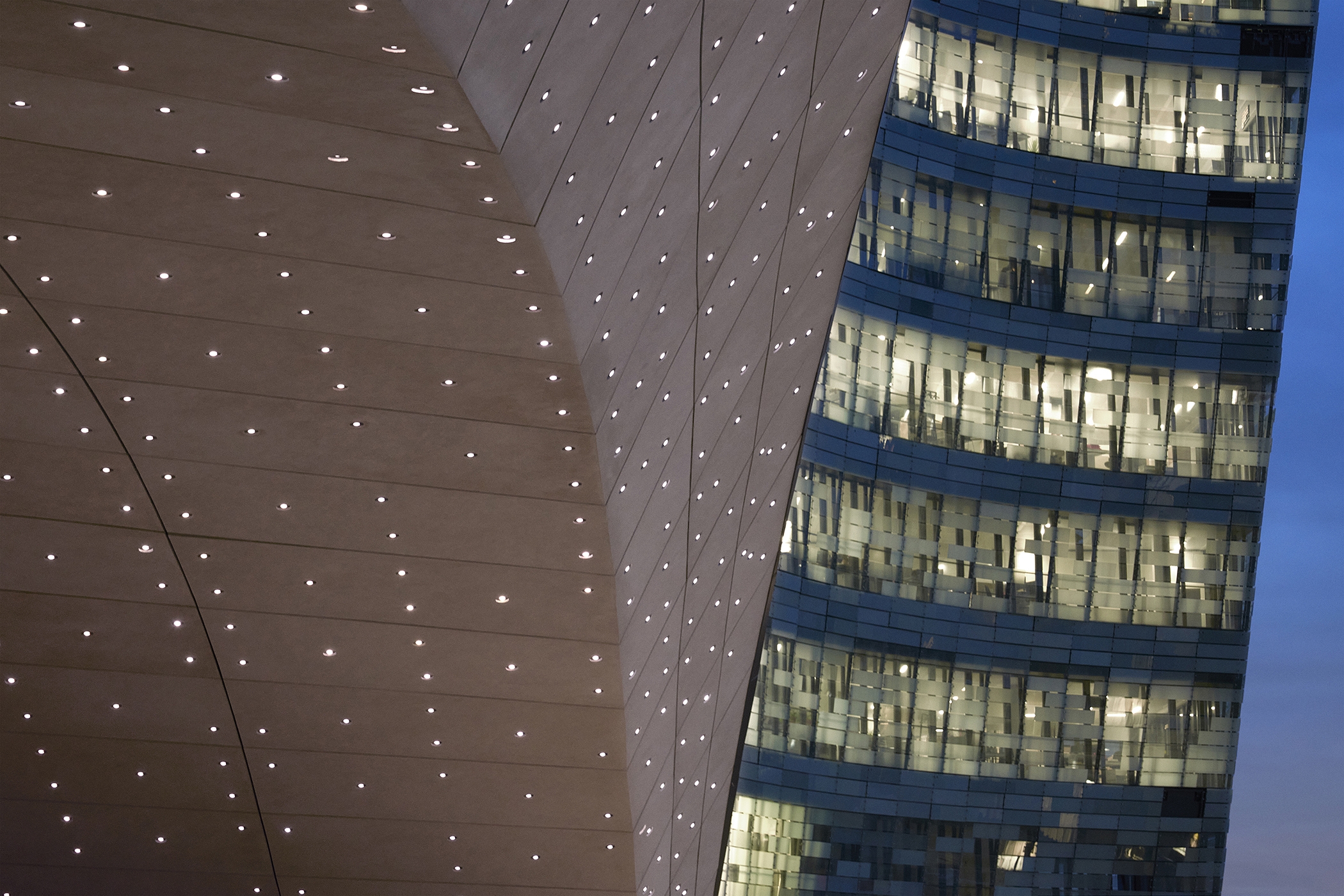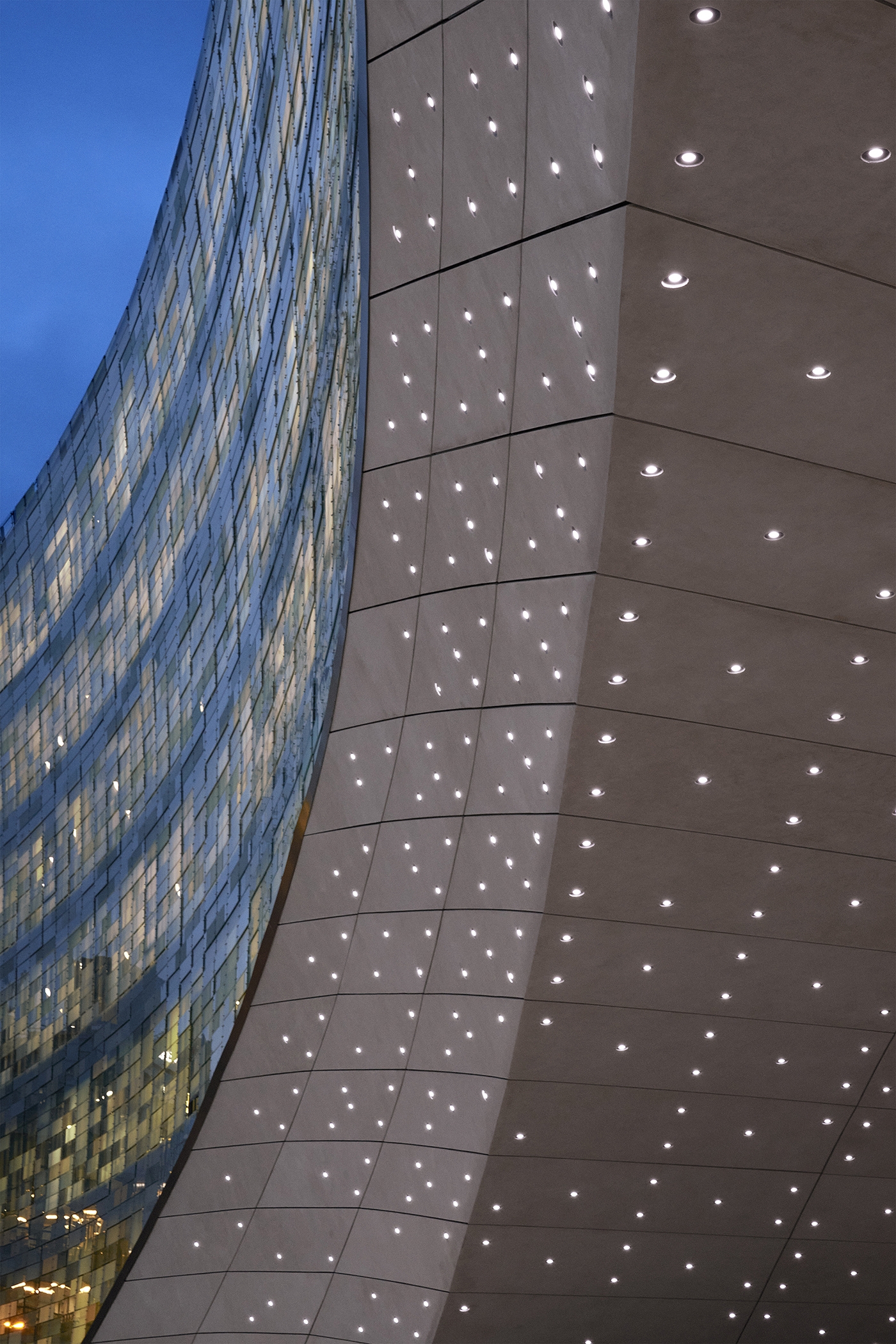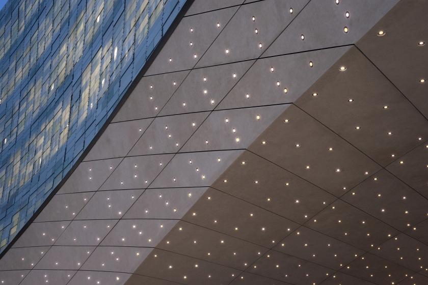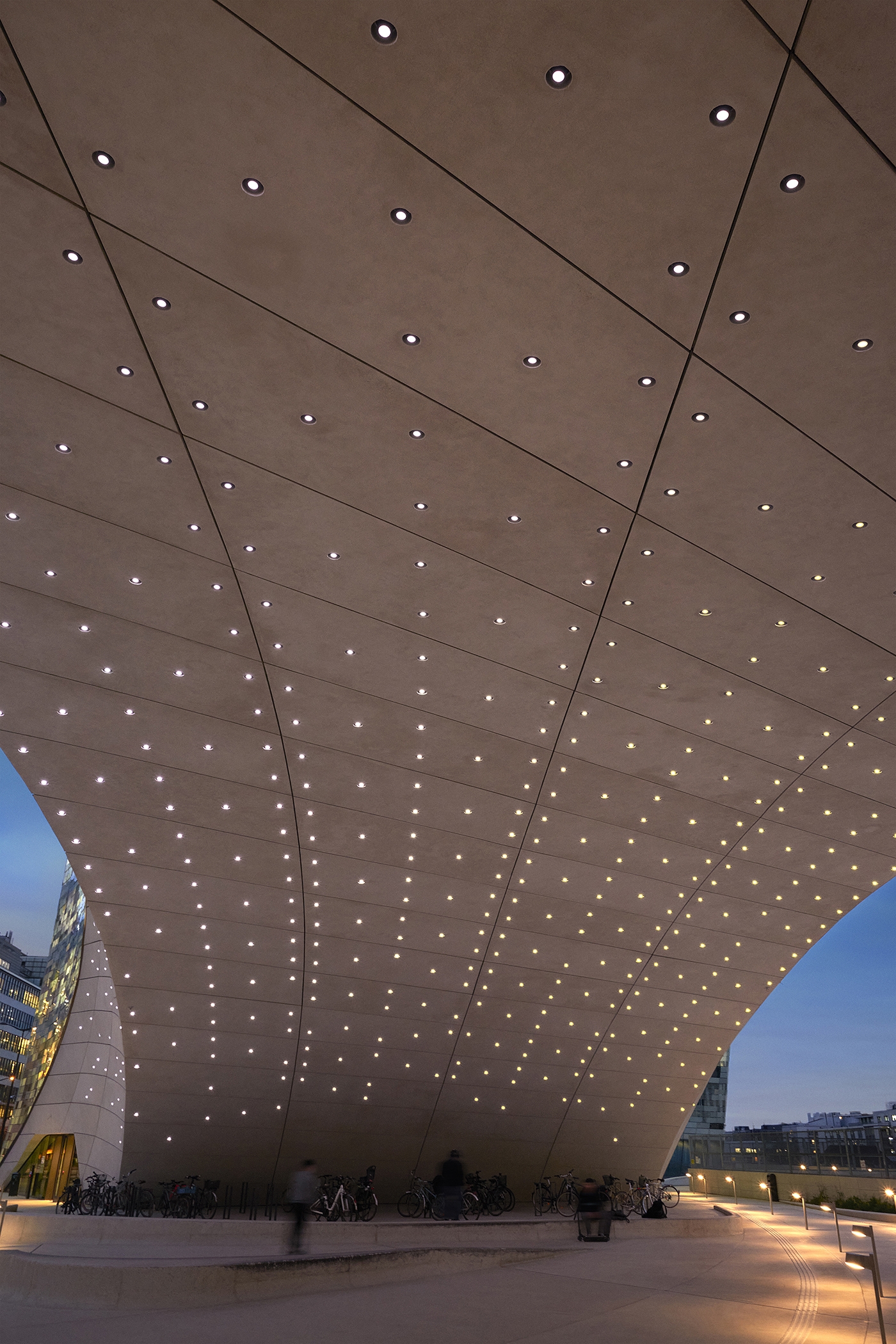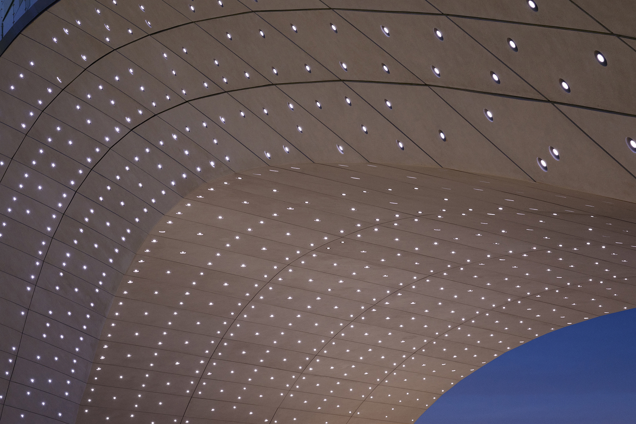 The Archway covering the plaza sparks alive once night sets in. A cloud of dynamic luminous points that undulates to the rhythm of inner activities.