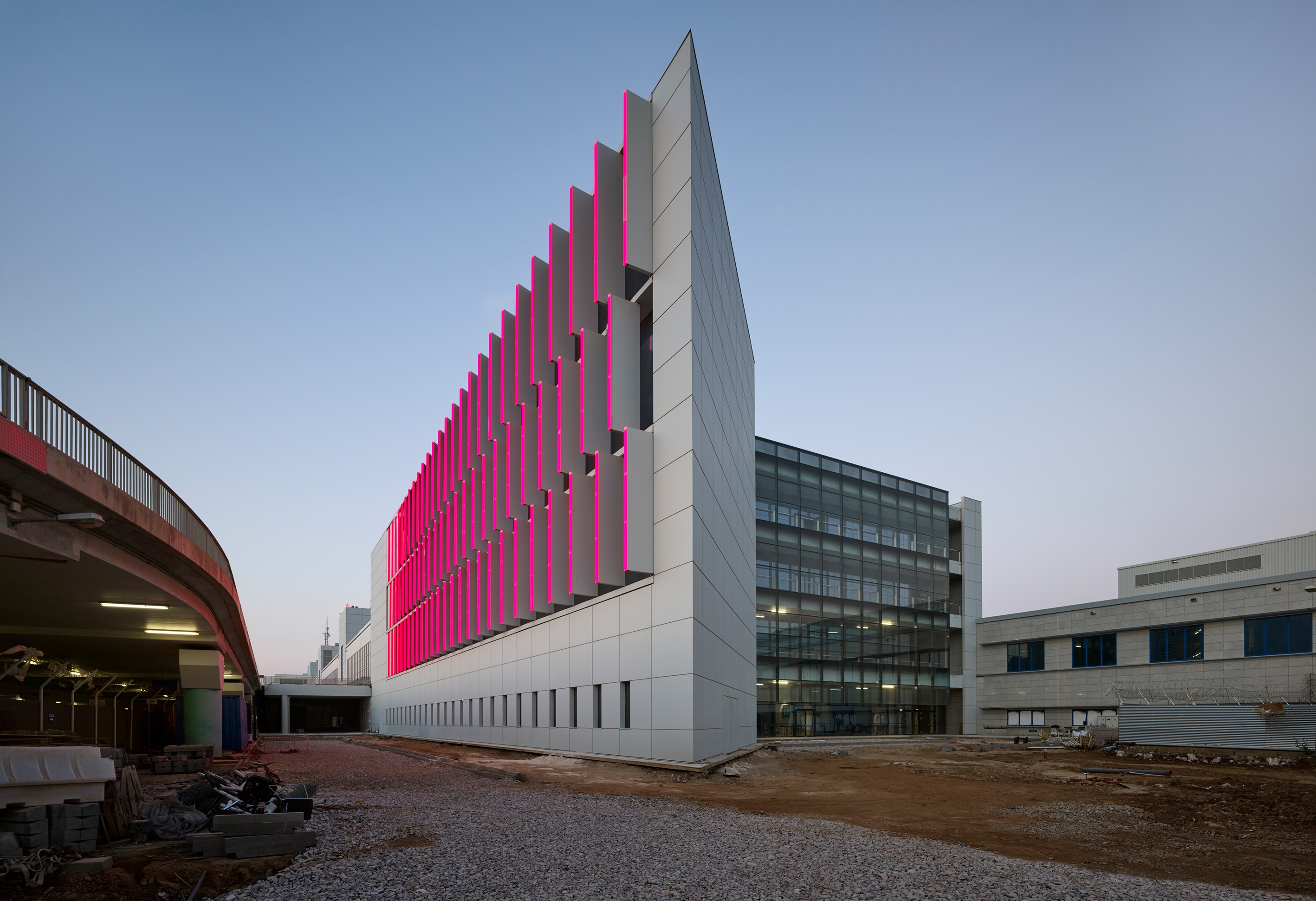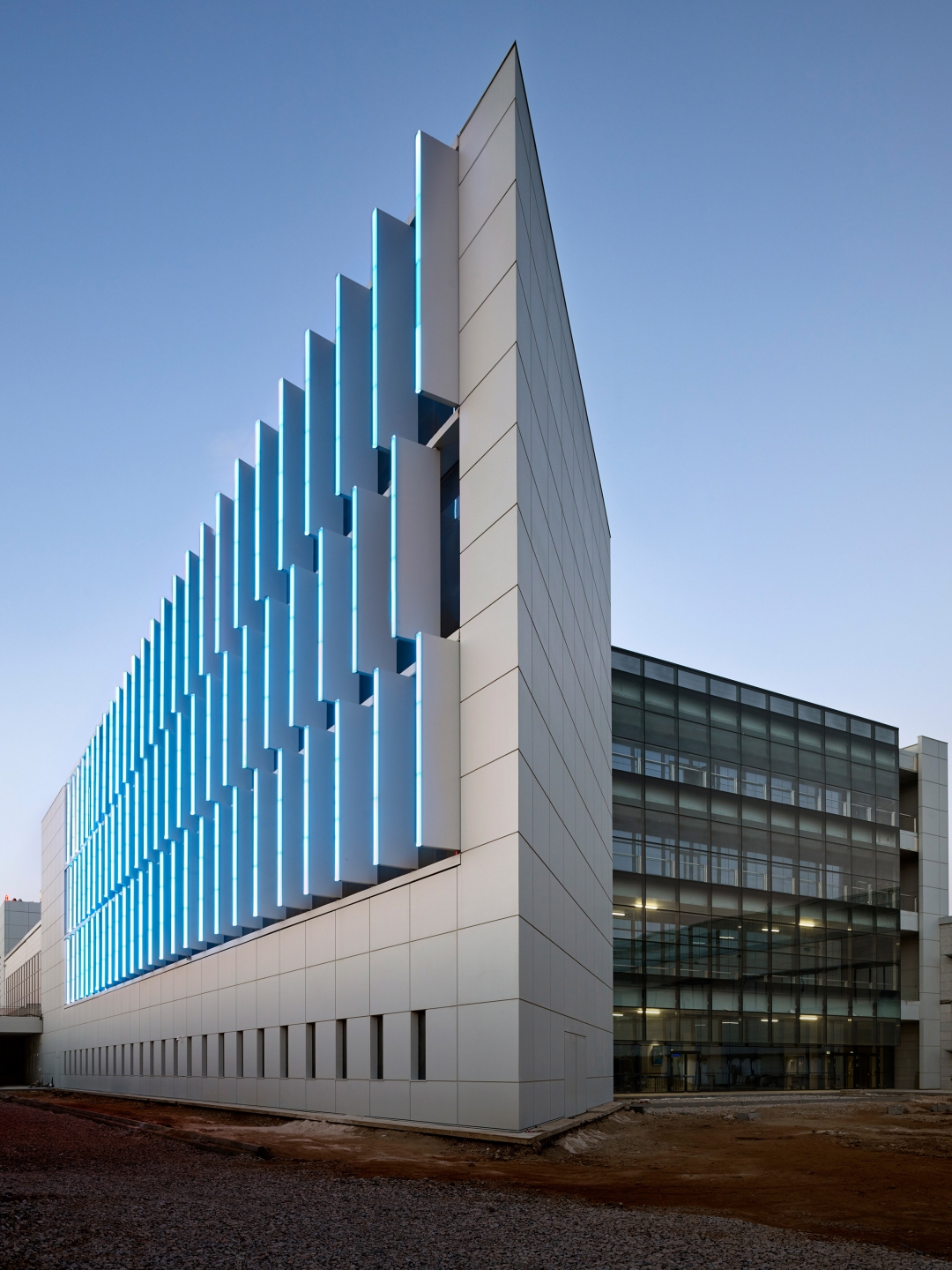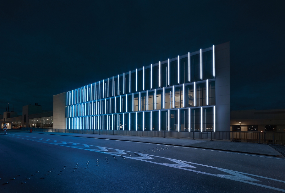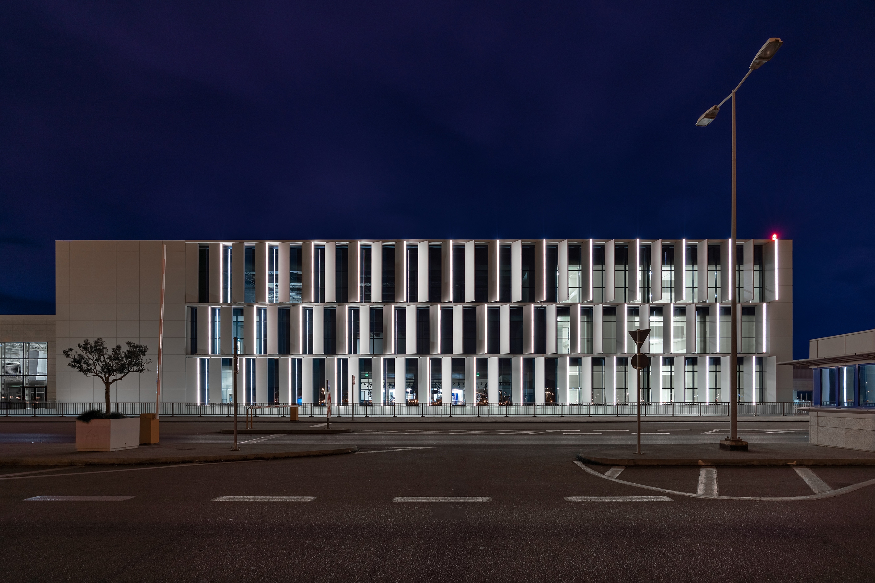 Our concept’s key element was to illuminate the structure elegantly without revealing the position of the light source and without the lighting fixtures obstructing transparency. As such, the luminaires are integrated in a discreet way that makes them part of the louvres and disappear during daytime.