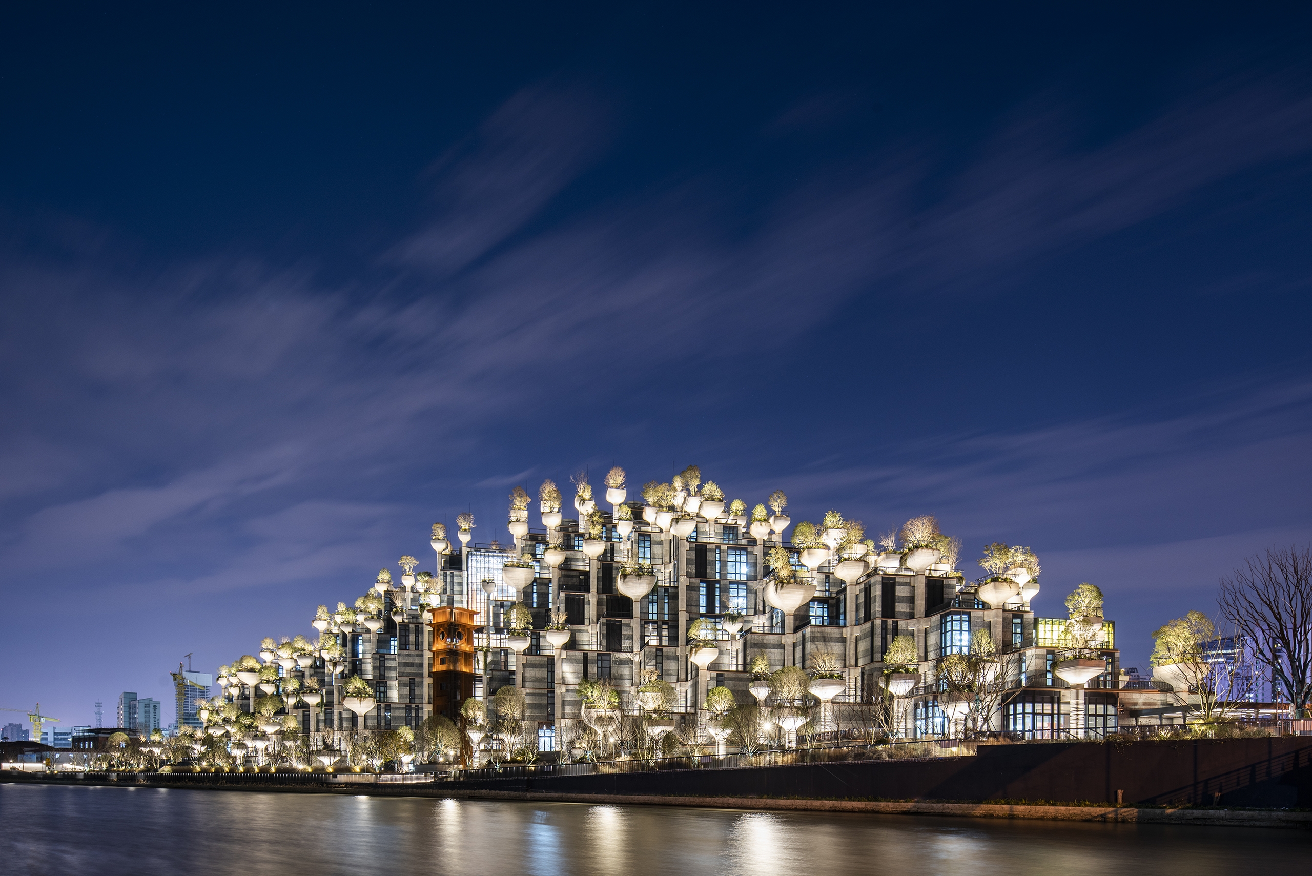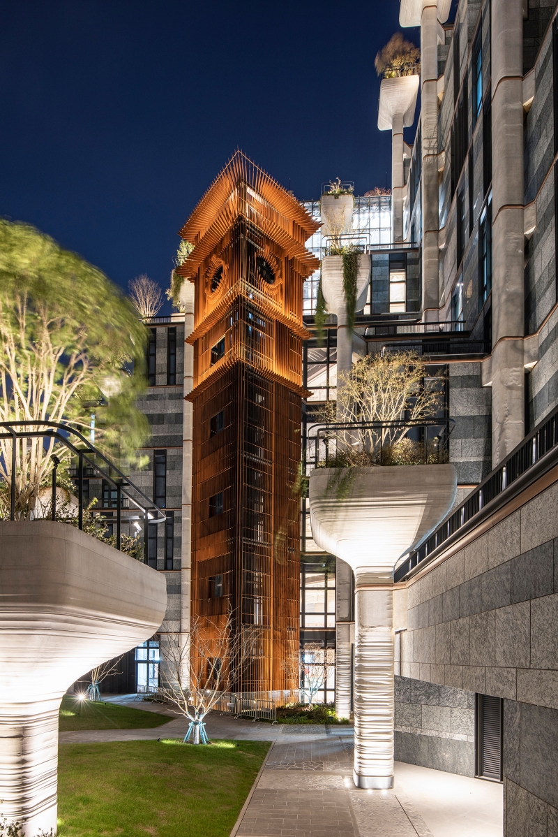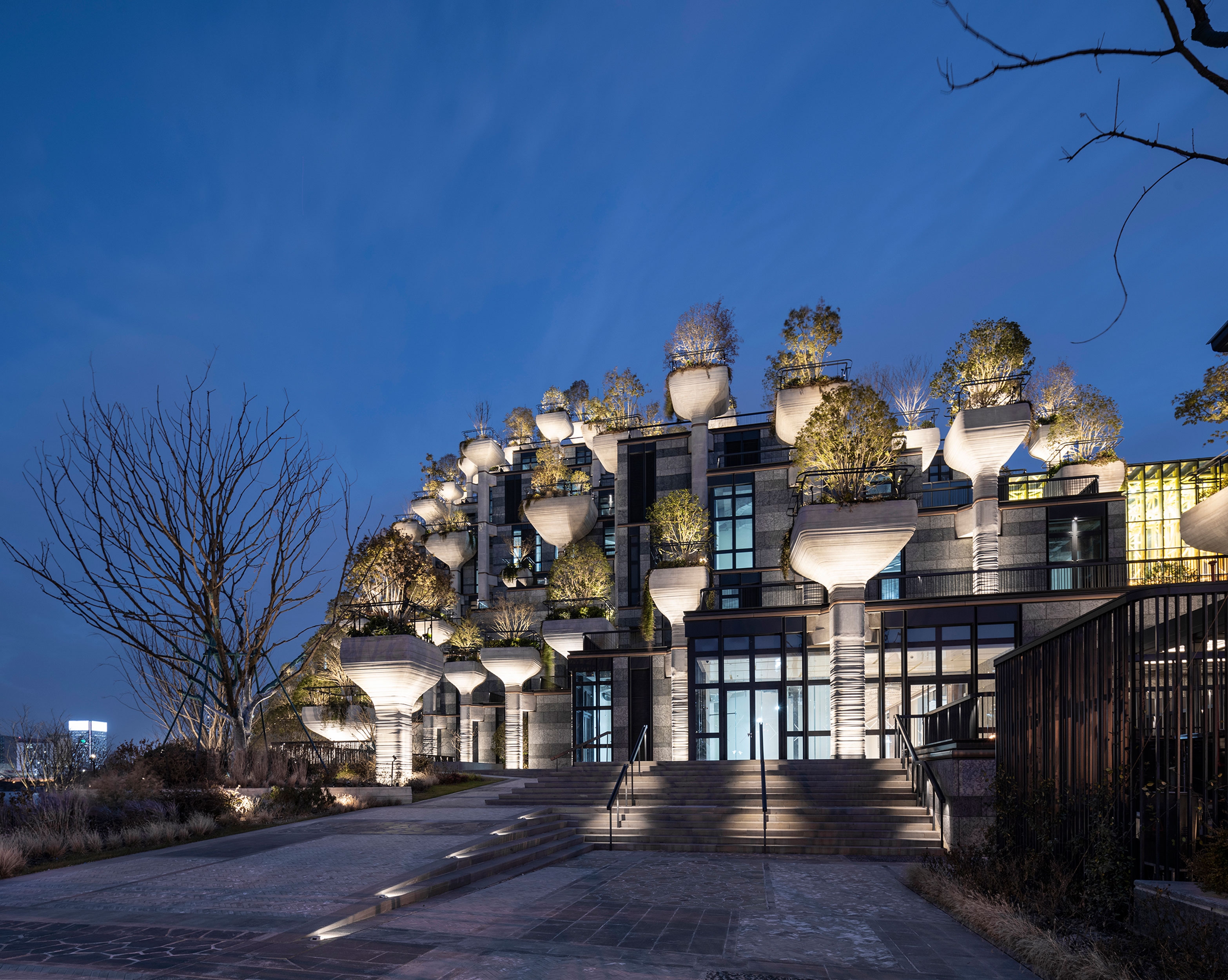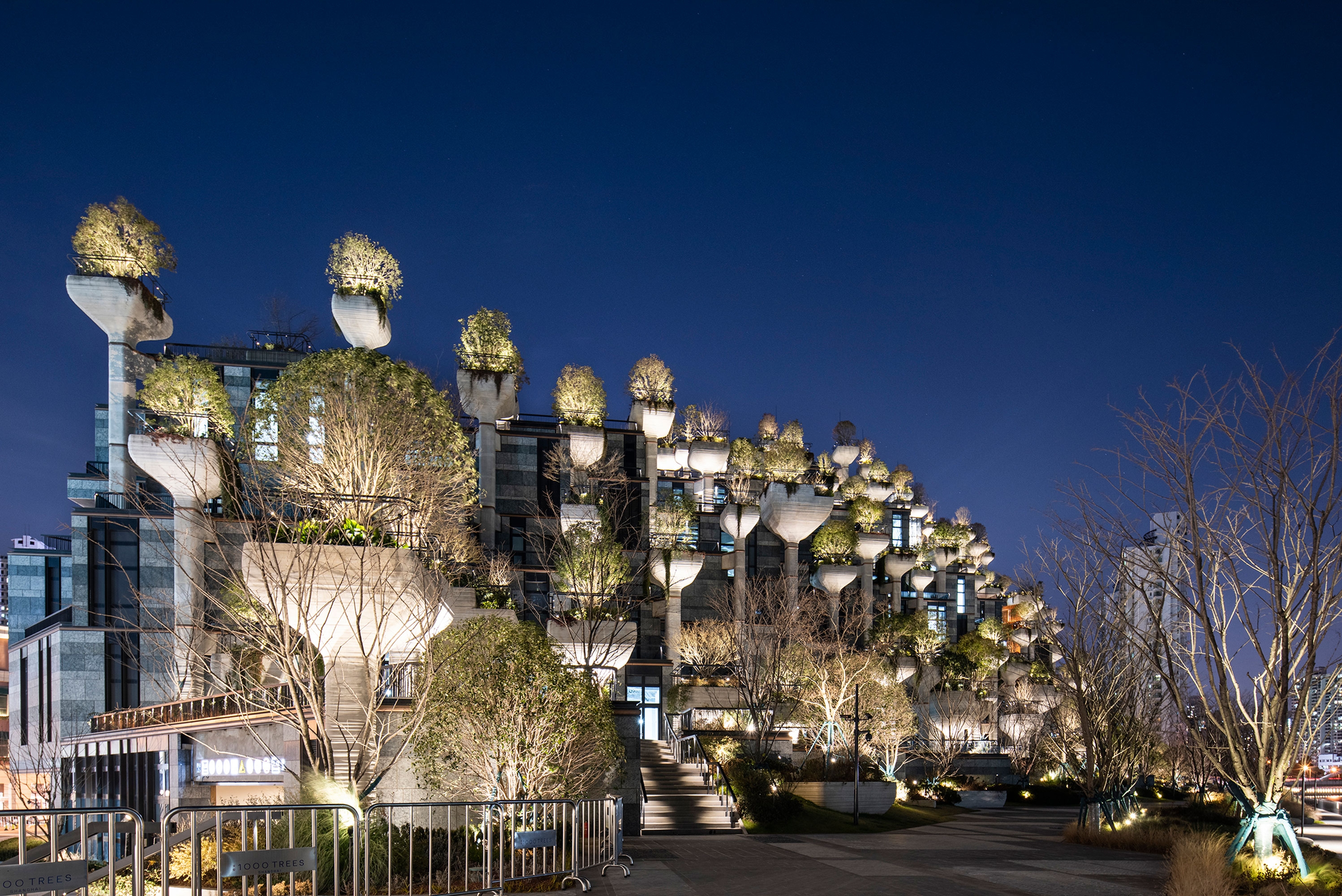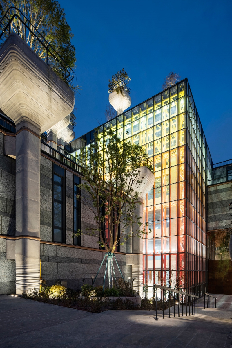 The astonishing flower columns scattered, the dramatic trees displayed, together they form a visually poetic landscape, giving the building a dreamy atmosphere day and night.