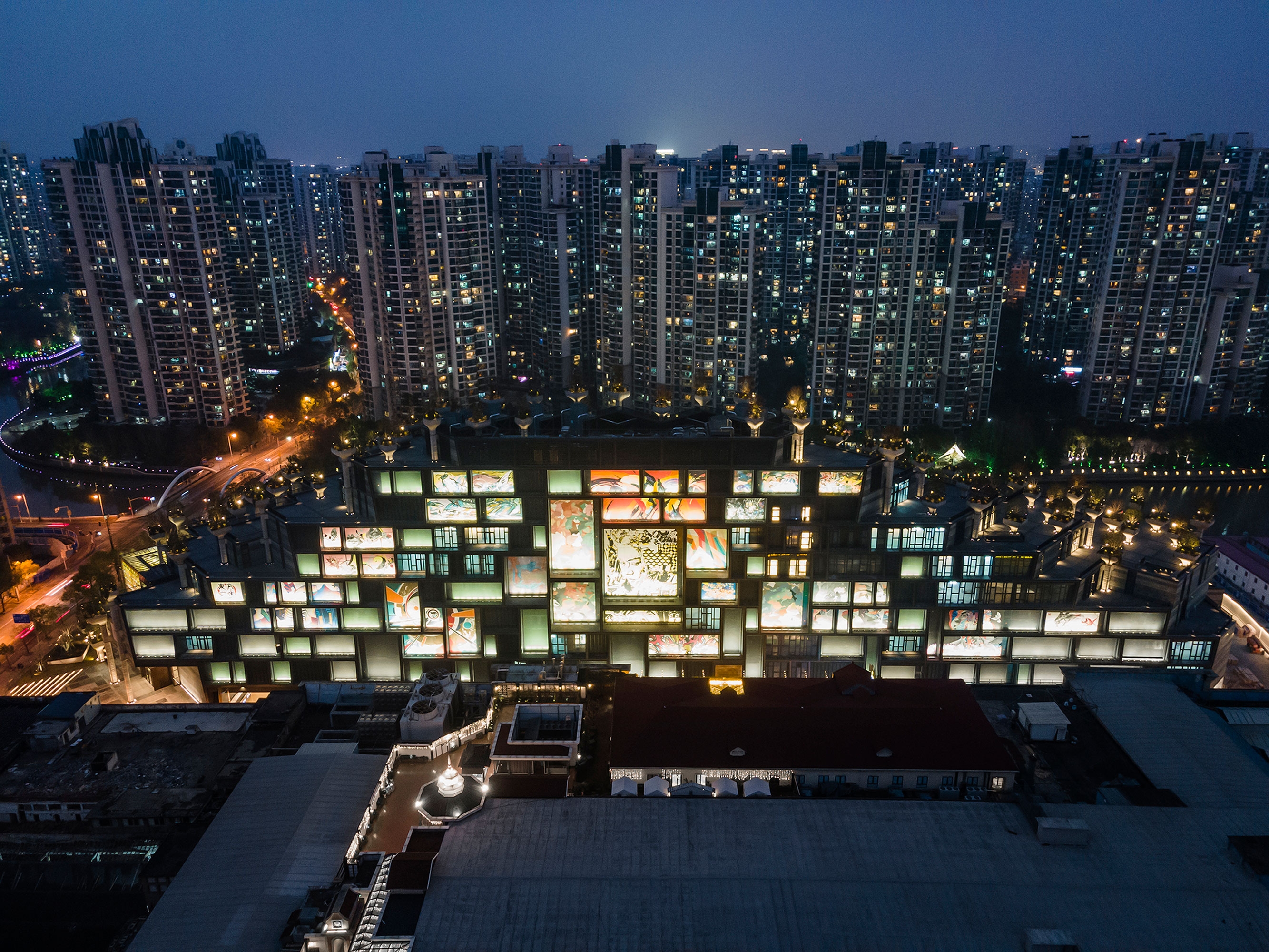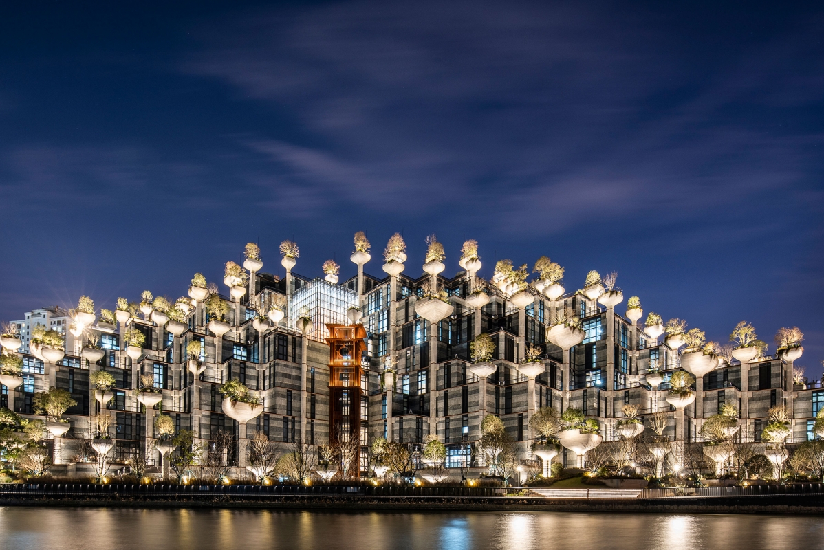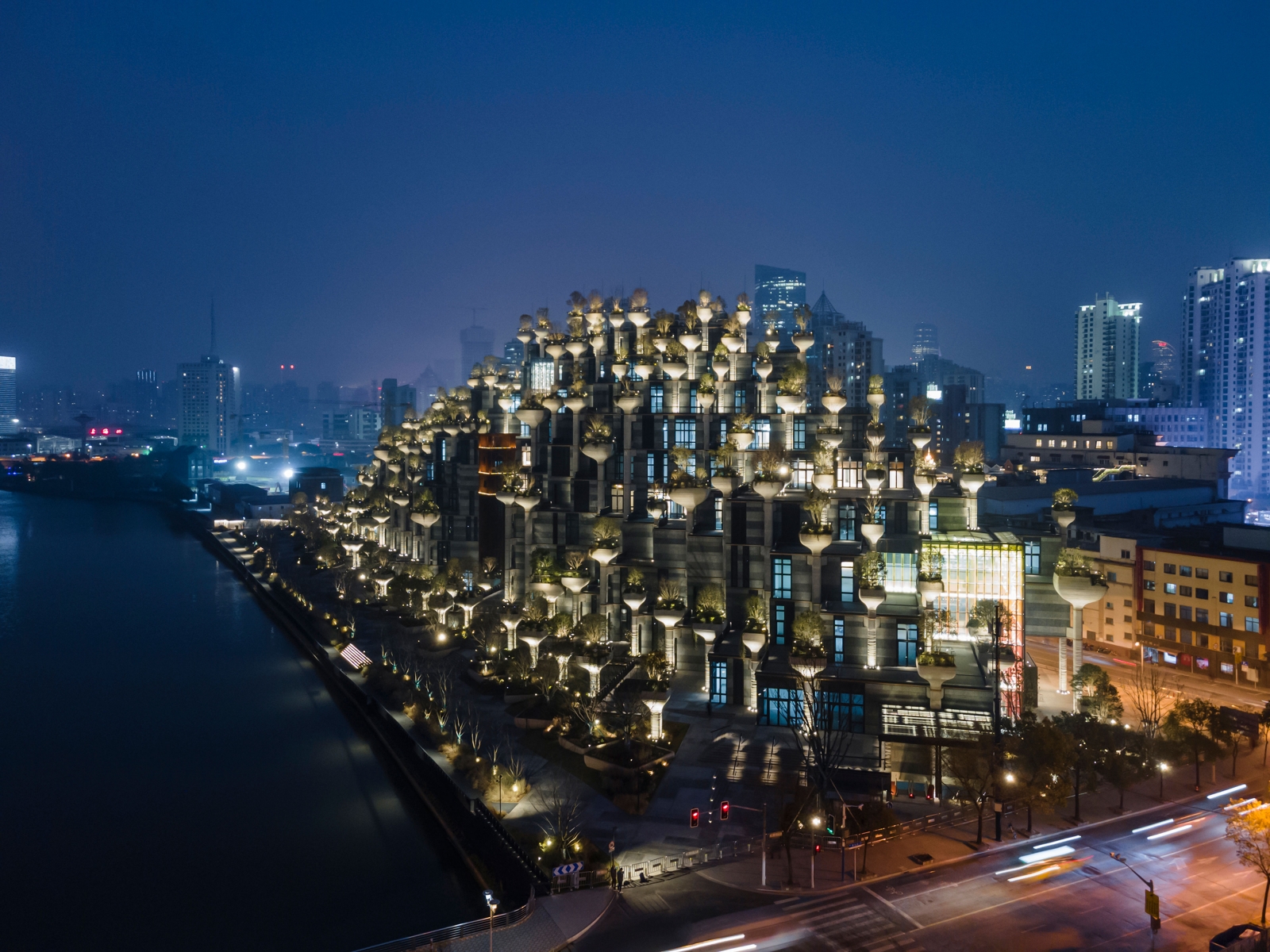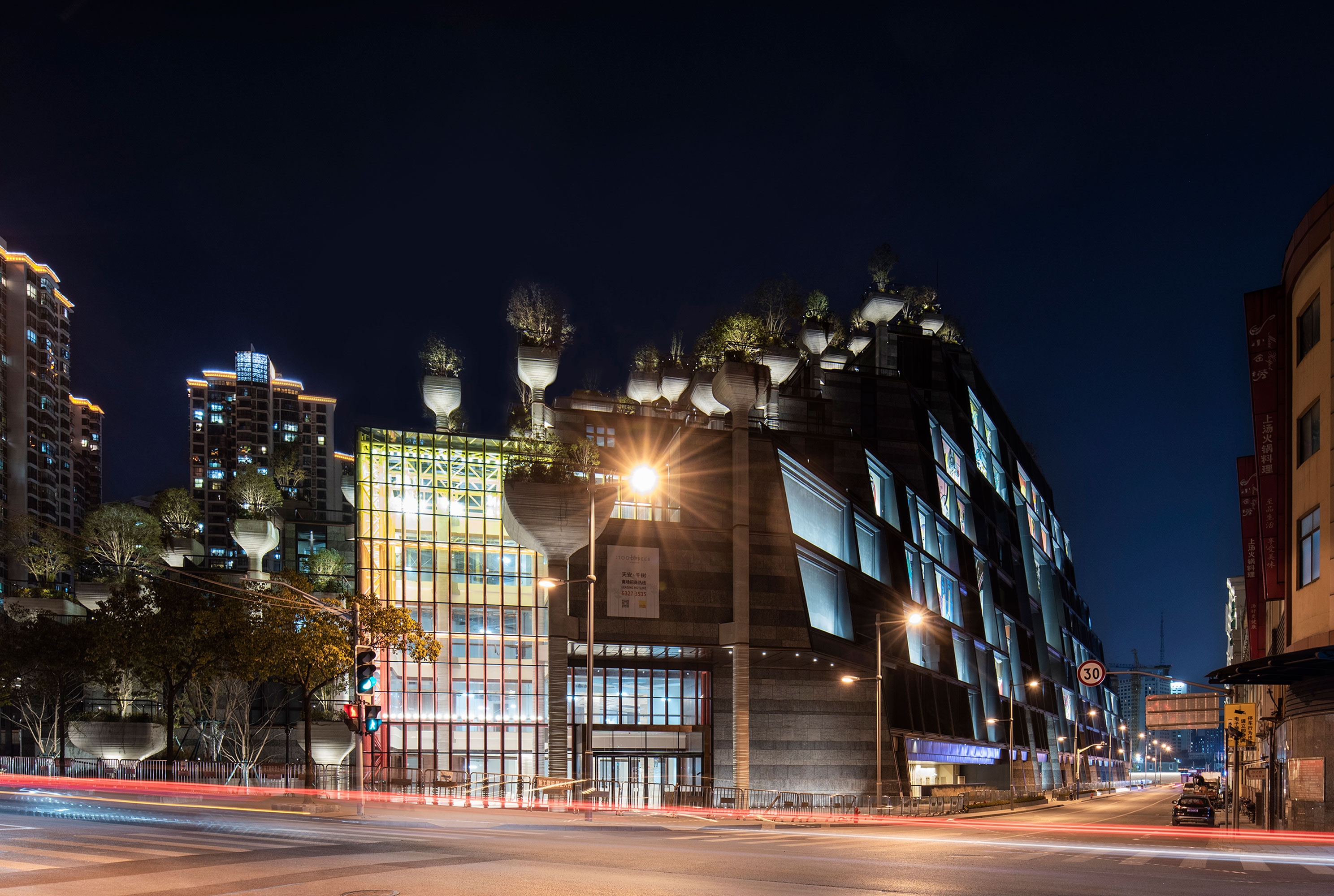 The astonishing flower columns scattered, the dramatic trees displayed, together they form a visually poetic landscape, giving the building a dreamy atmosphere day and night.