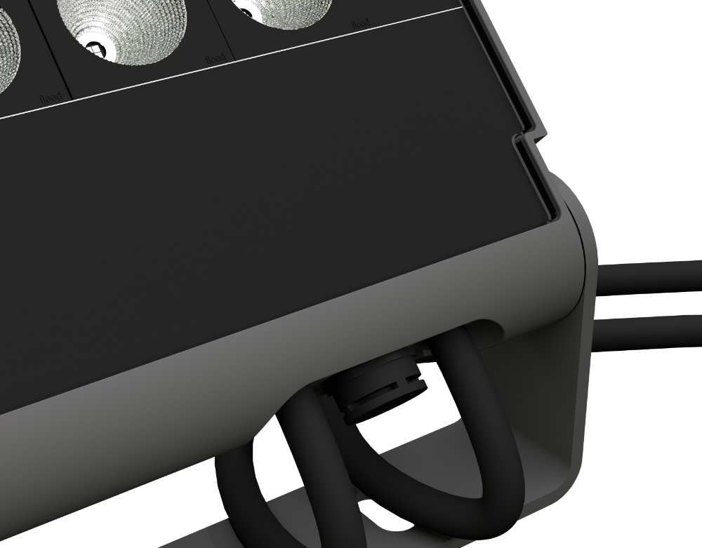 In order to achieve protection class IP 67, we developed a new design for the cable entries. This allows cables to be inserted into the housing without visible screw connections. A pressure equalization membrane vent is also located at this point. This detail can be found in all lights of this series.