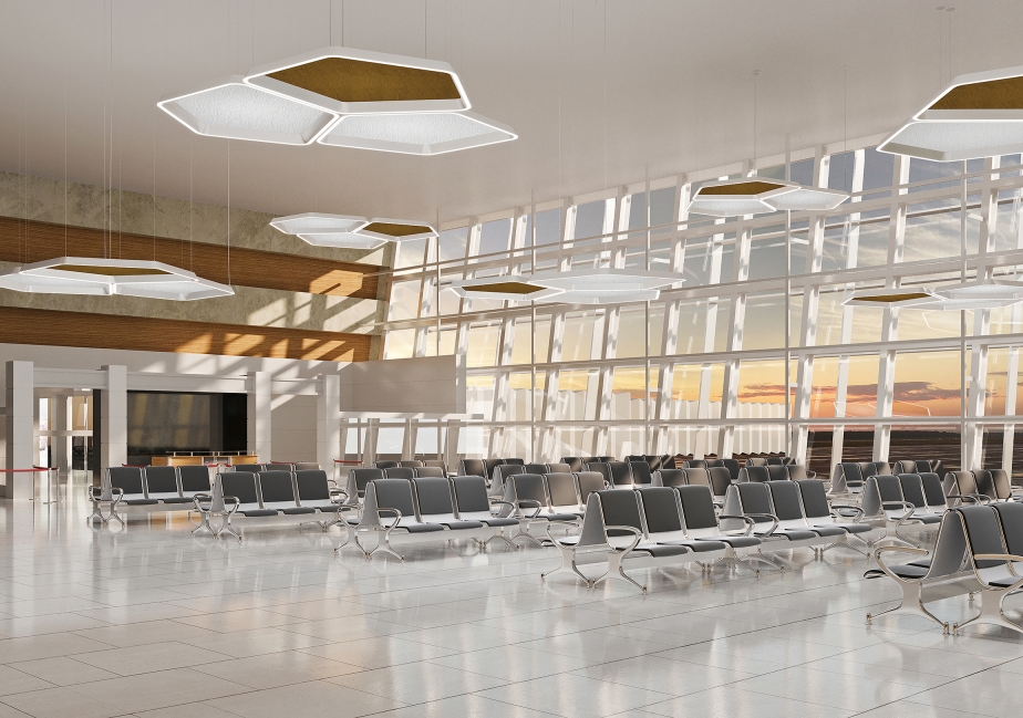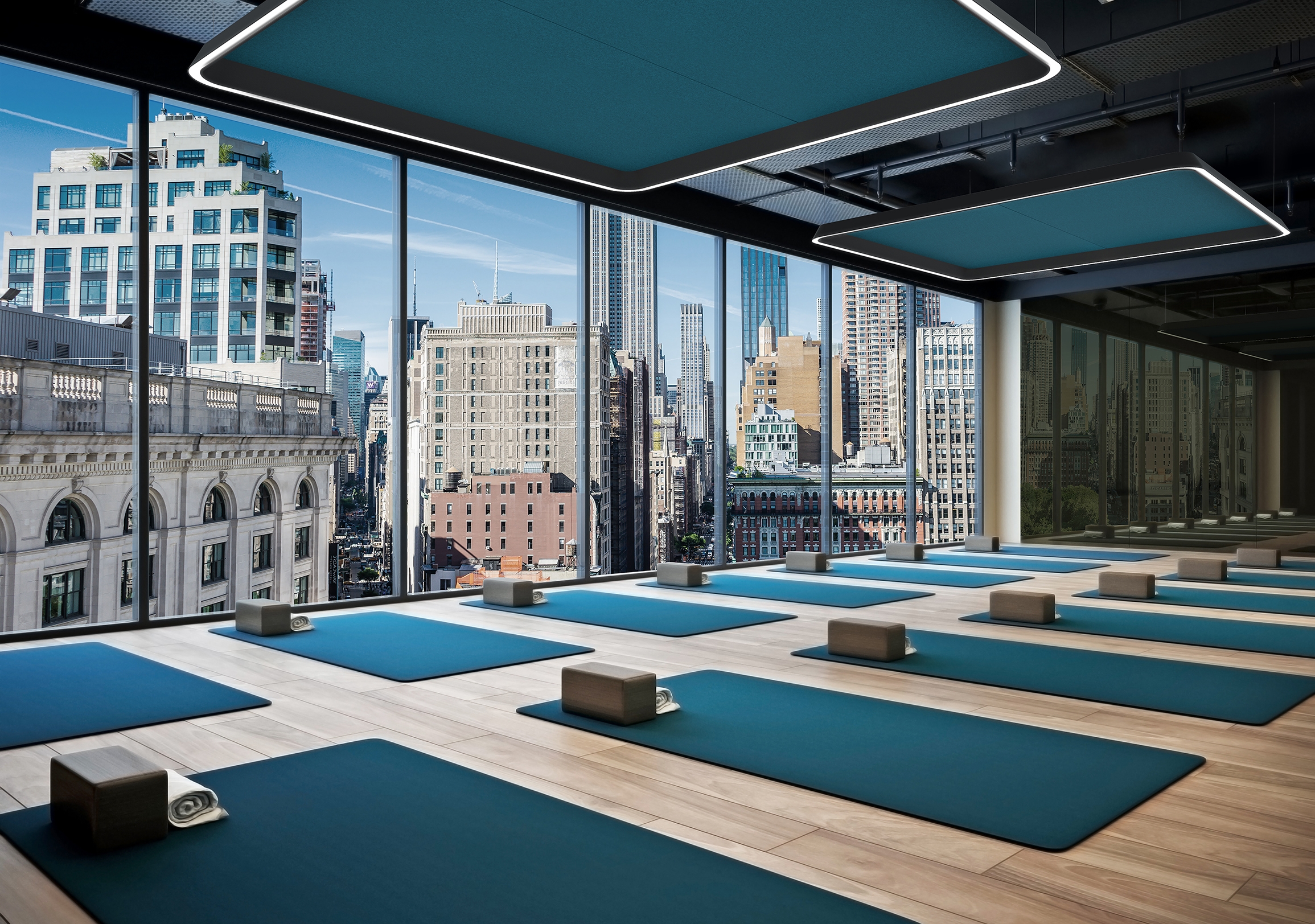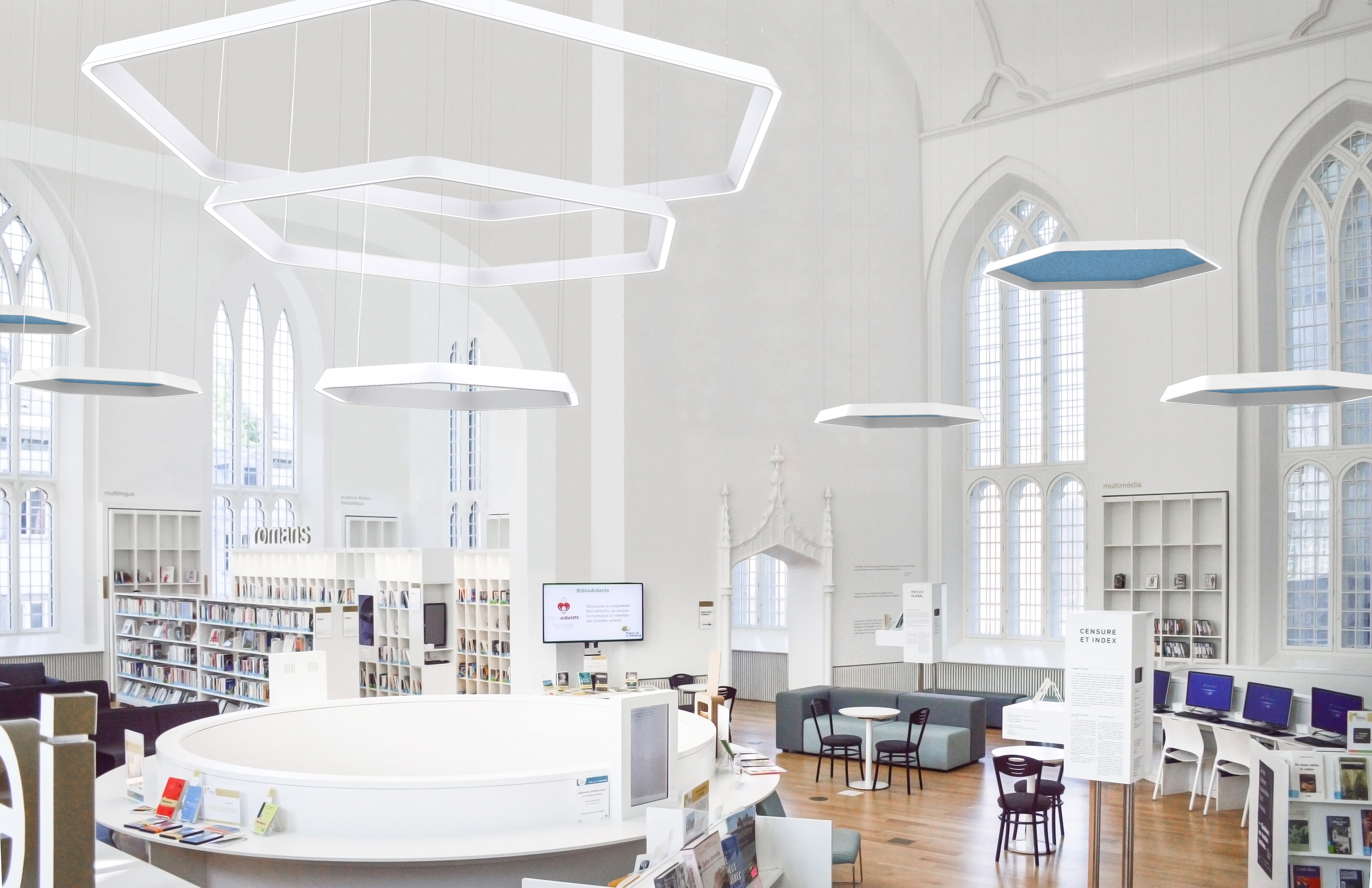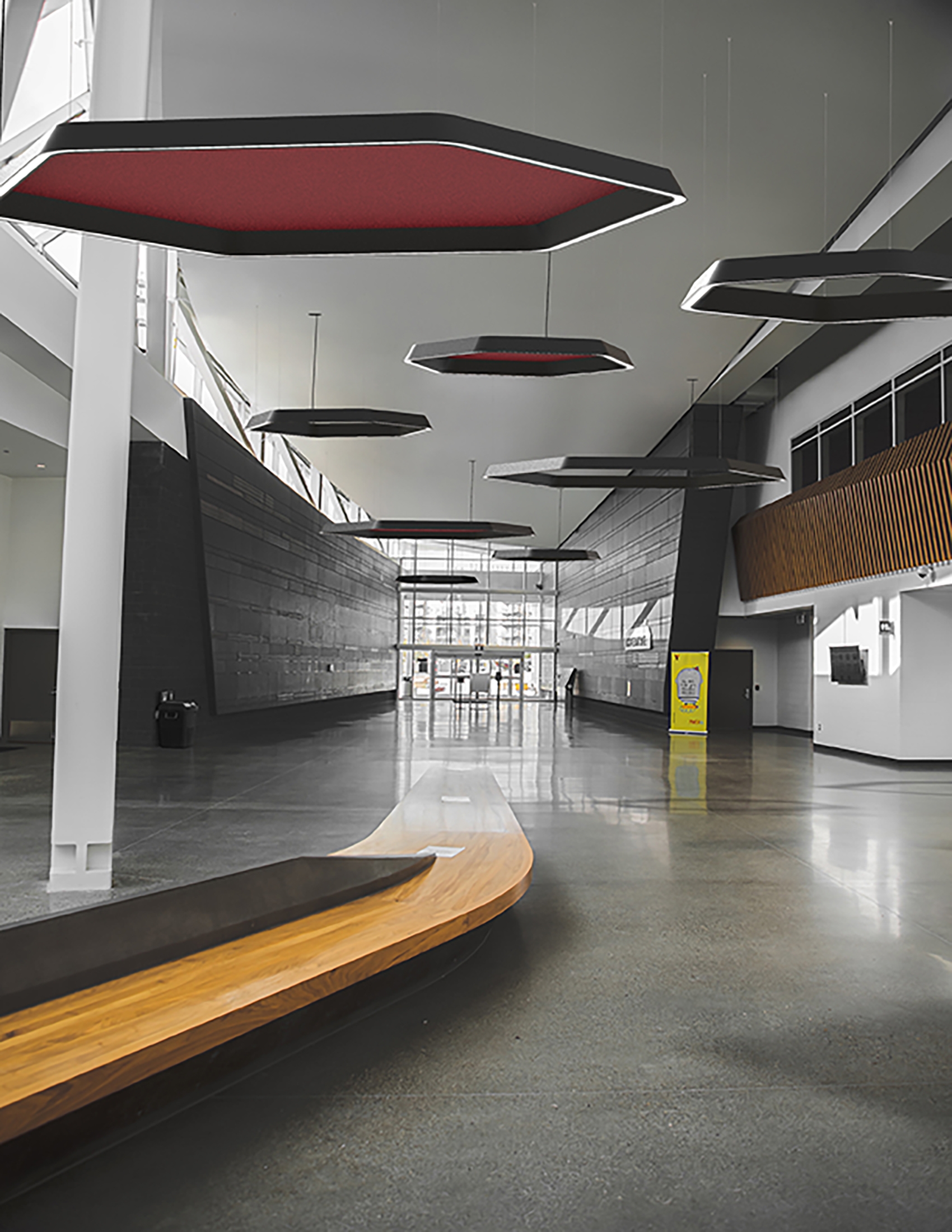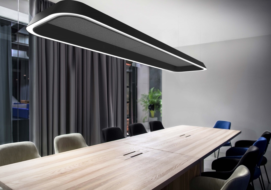 Acoustic panels may be added to the fixture in 30 colors to complement or accentuate an aesthetic, while absorbing ambient sound in a space.