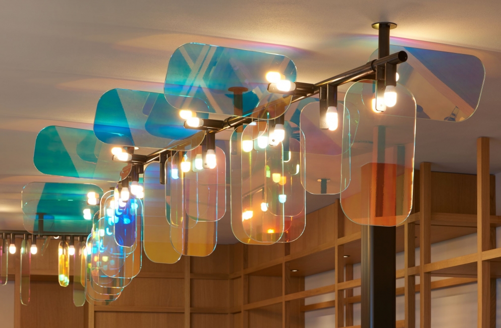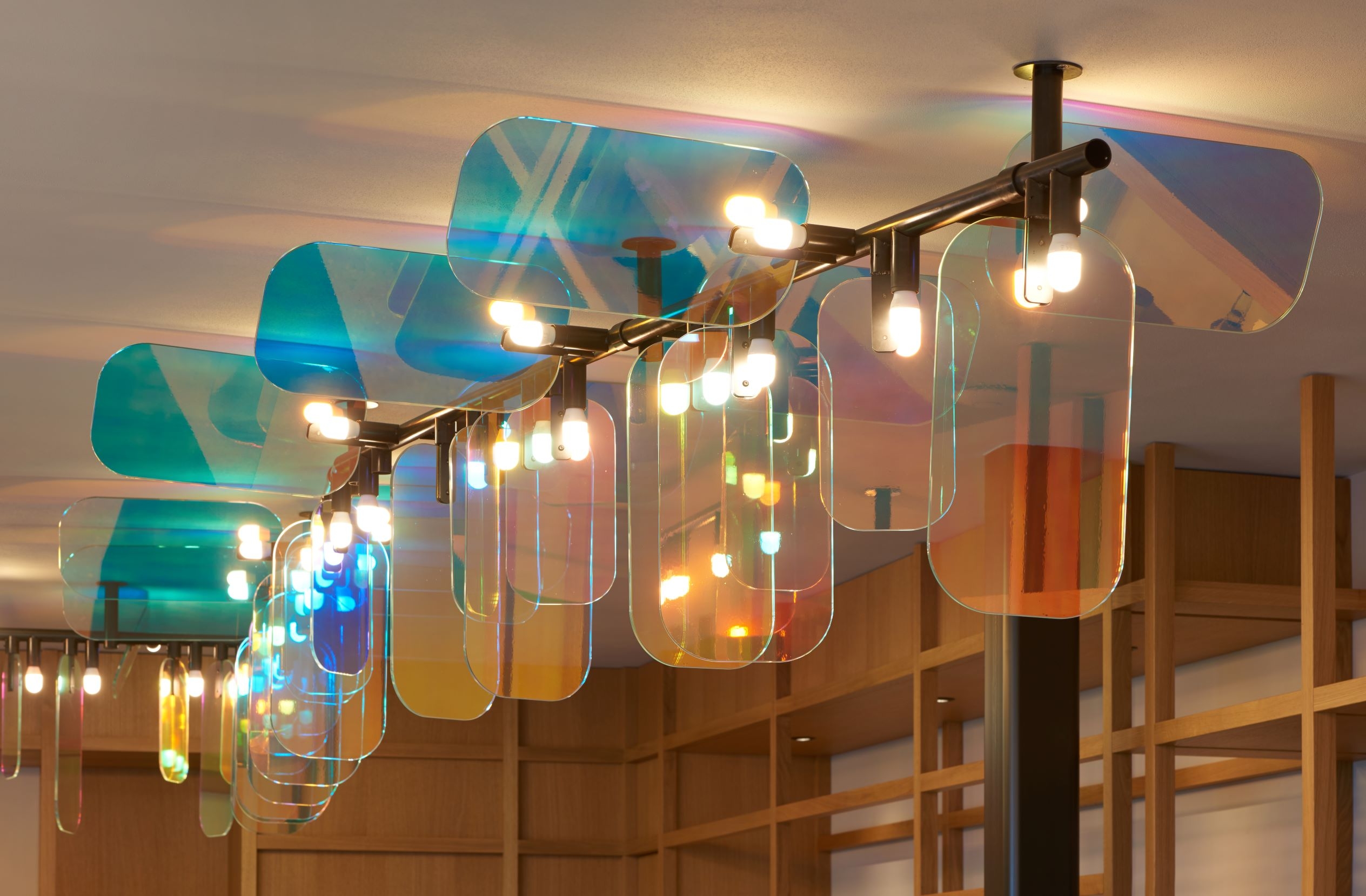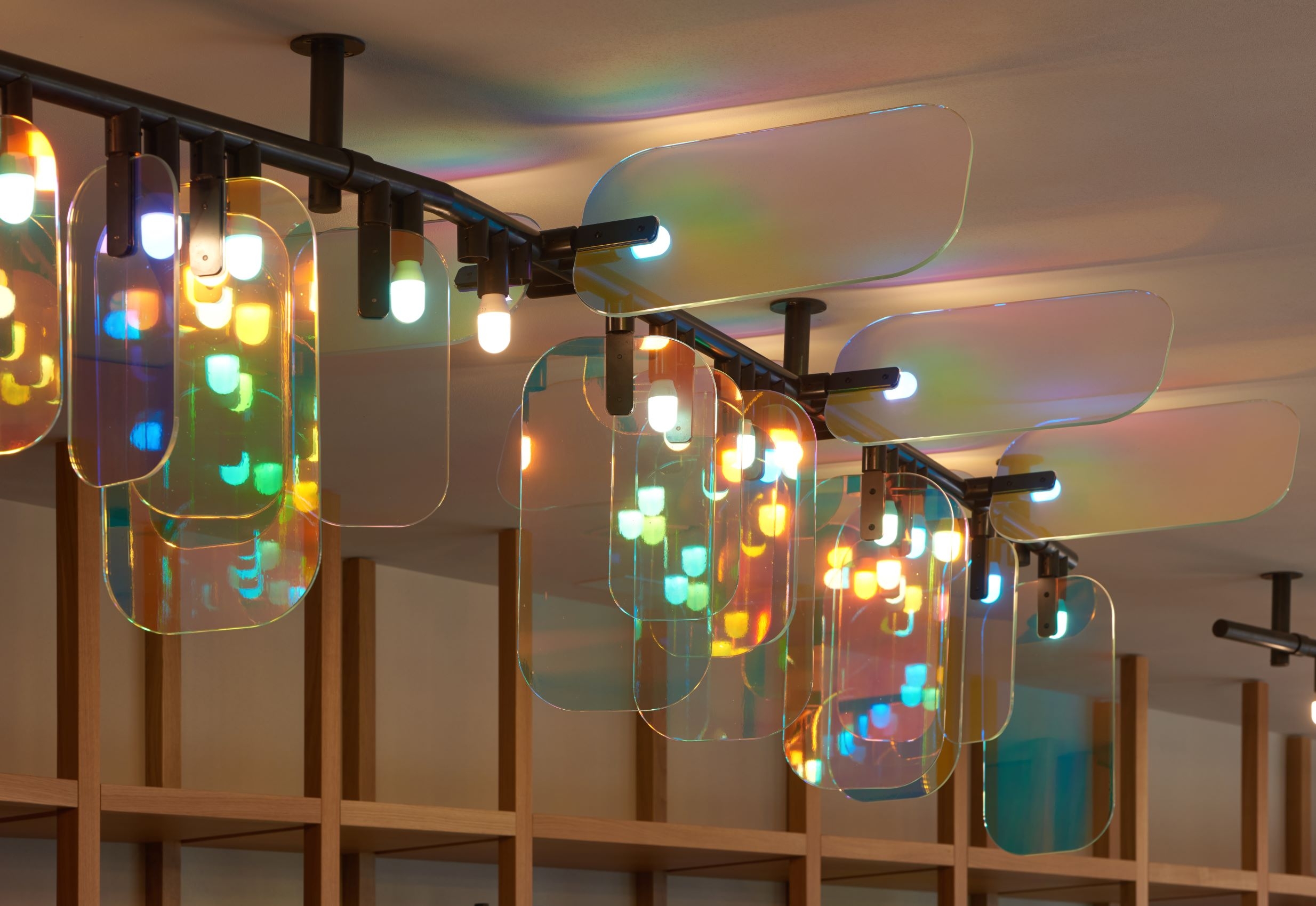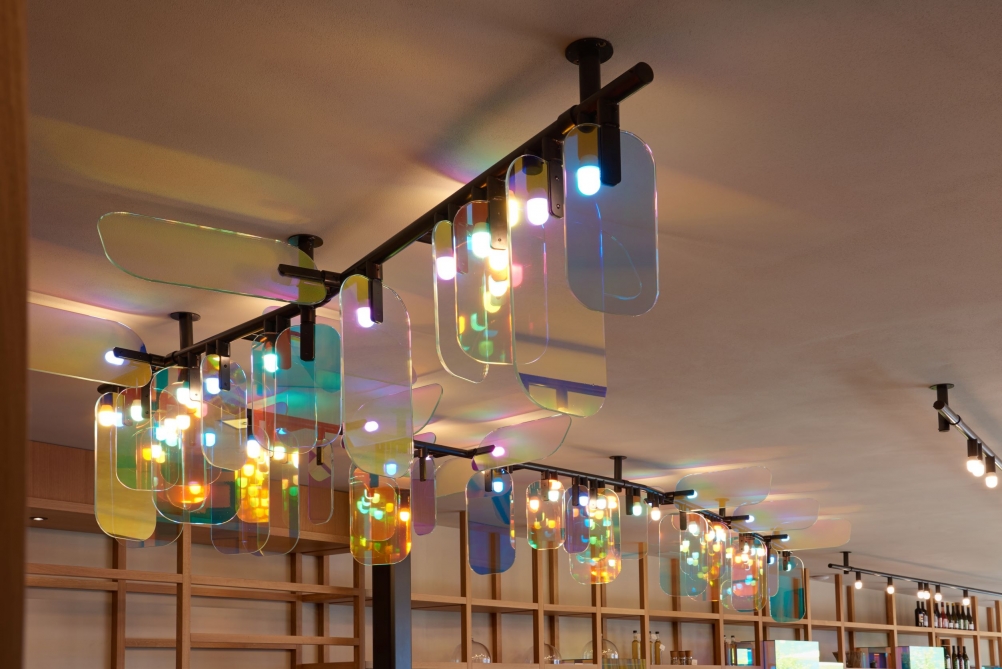 The light sources are located next to the glass elements, intensifying the play of colors in this unique ceiling light.