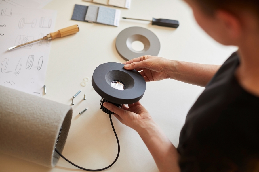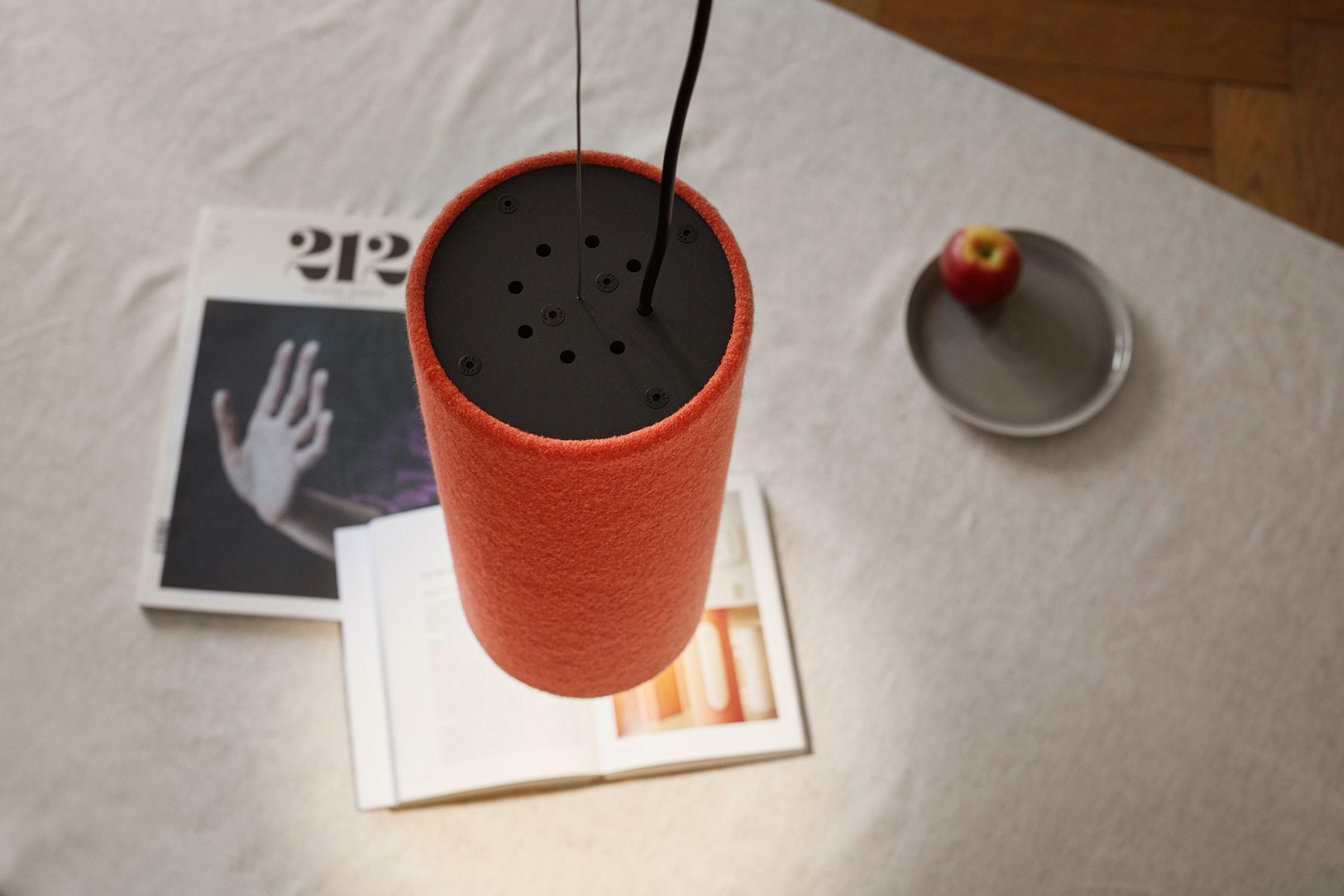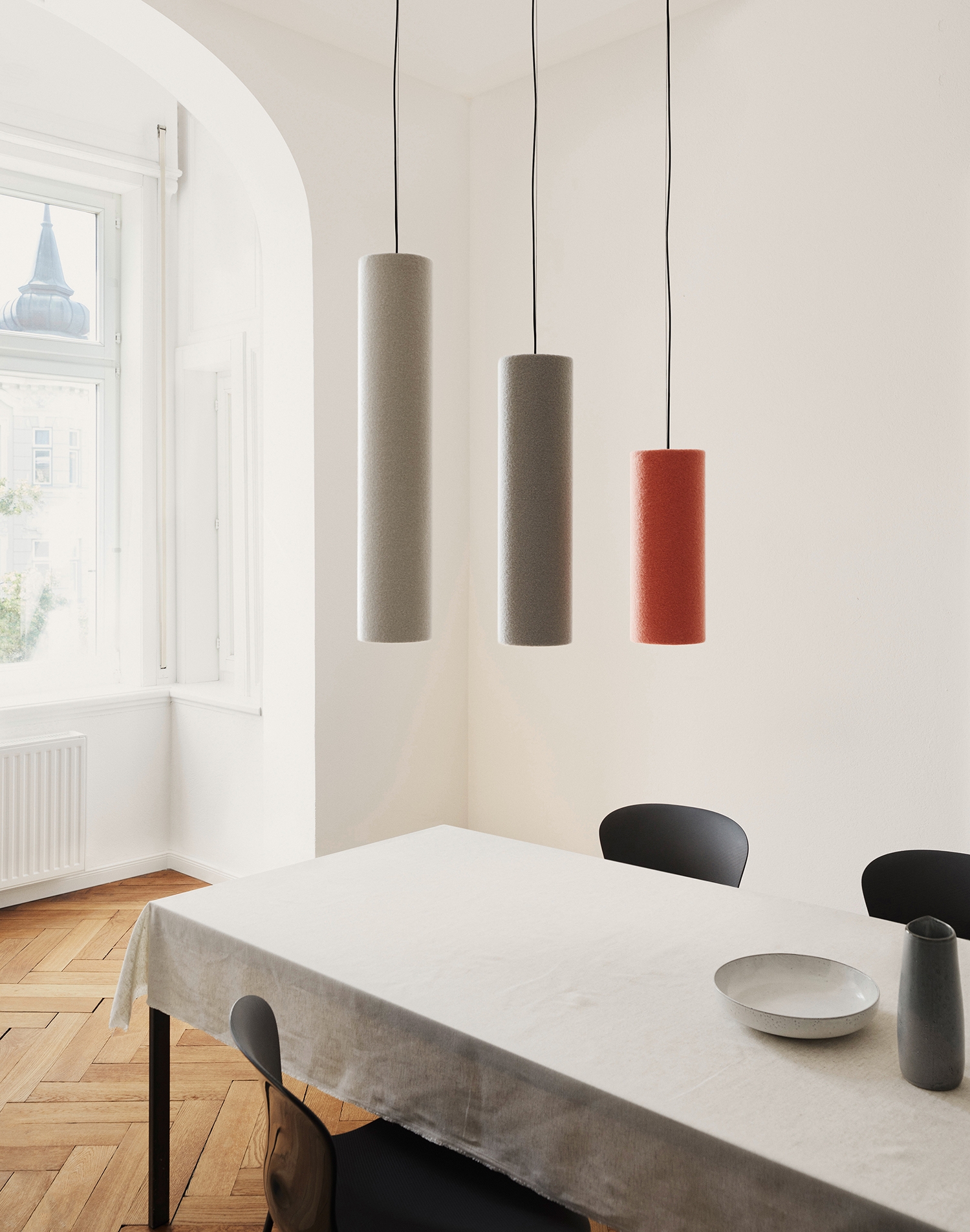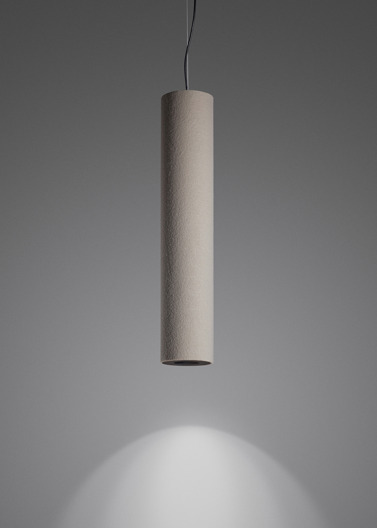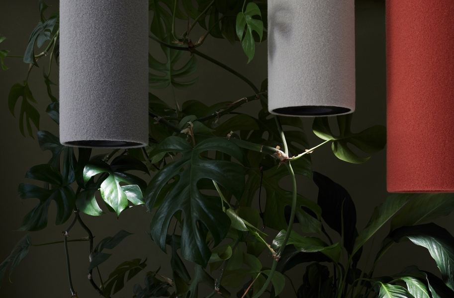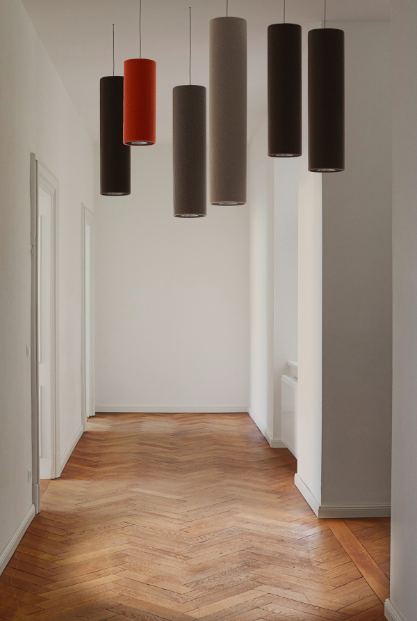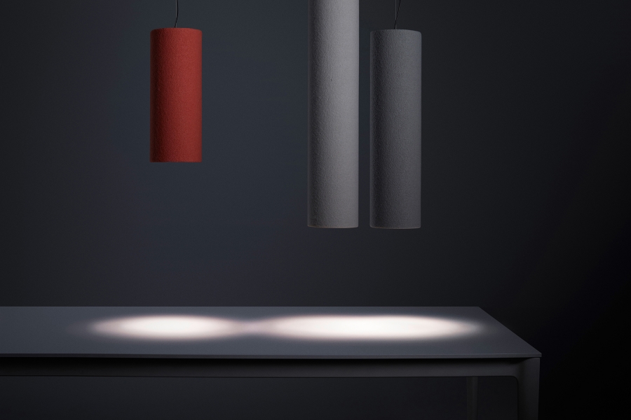 Tube Light is a highly-efficient sound absorber, that ensures great room acoustics, as well as a continuously dimmable LED light with integrated light colour control system. The cylindrically shaped light can be suspended from the ceiling at any chose height, as an individual piece or as grouped together in an ensemble. The discreet geometrical body consists of solely two materials – 100% Merino wool as an efficient and renewable material and recycled aluminium. No glues are used in the production process, so that all single-origin materials can be separated and sorted after the completion of their service life. The fine wool covering fabric of the sound absorber also has an additional role: wool is naturally flame retardant and can store air moisture, that will then be given off when the ambient air dries. The light can be continuously and variably dimmed, while also offering full control over the colour temperature, by means of a mobile app. The available colour temperature mixture ranges from warm light measuring 2200K to cold 5000K light. The lighting solutions provided by this product focuses greatly on the human experience as well as visual, emotional and health requirements.