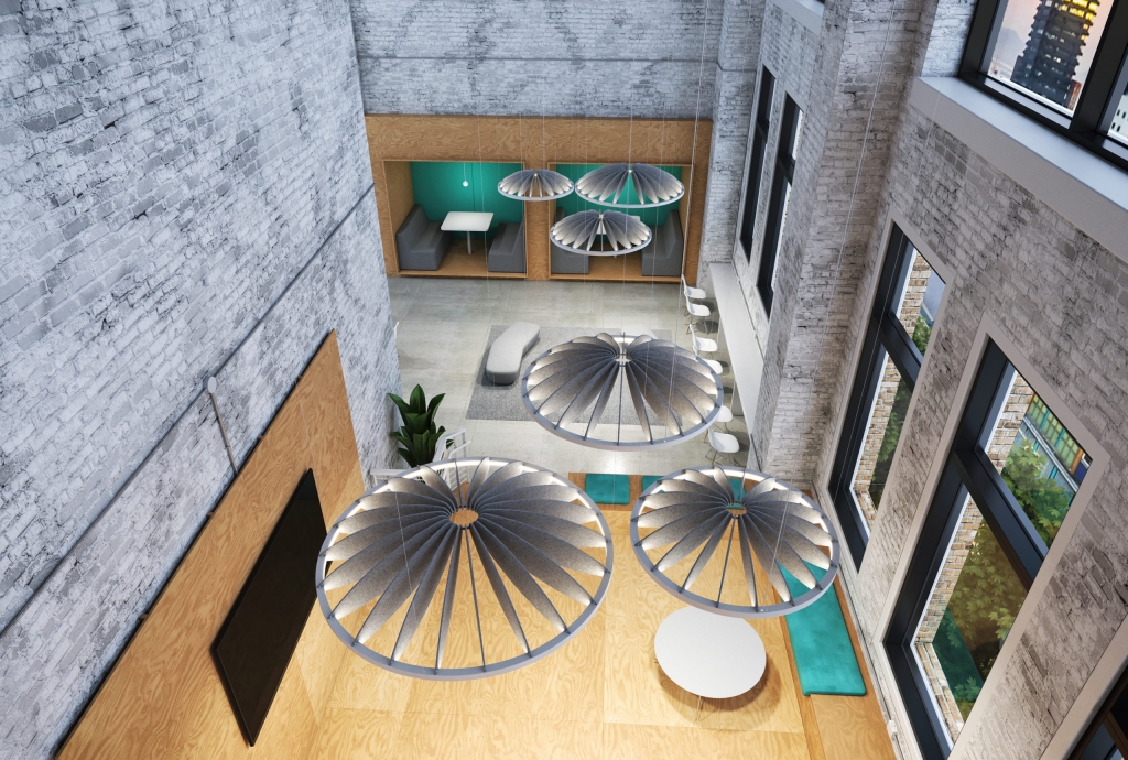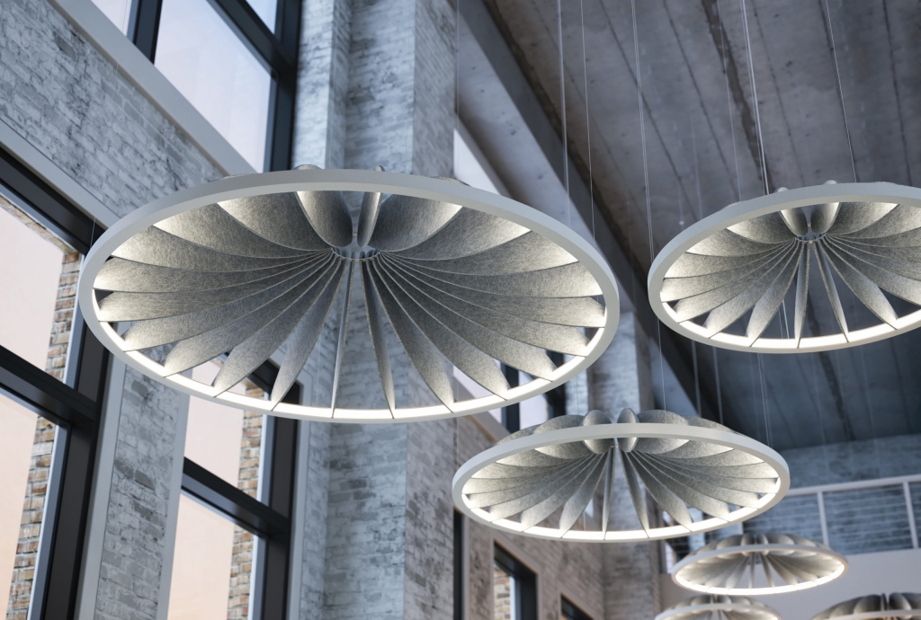 This fixture is equipped with arced petals that are sleek and curved, sparking organic inspiration for composition of the space. The sweeping curve of the petals joins the central hub, pulling the viewer in visually and creating an almost mesmerizing, calming focal point. Soft, comfortable materials and nature-inspired forms combine to soften some of the harsh industrial materials and finishes common in commercial interiors.