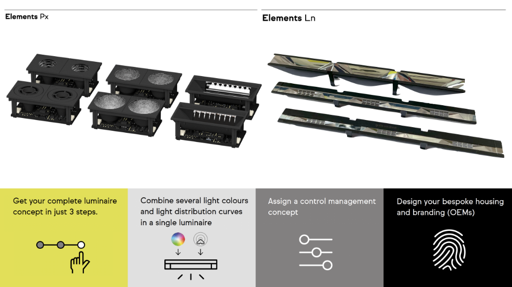 Entry DescriptionElements is the modular technology platform for maximum Requirements on light quality and flexibility in planning. a kit of Optics, light sources and electronics can be used to create high quality lighting tools configure for every imaginable application.