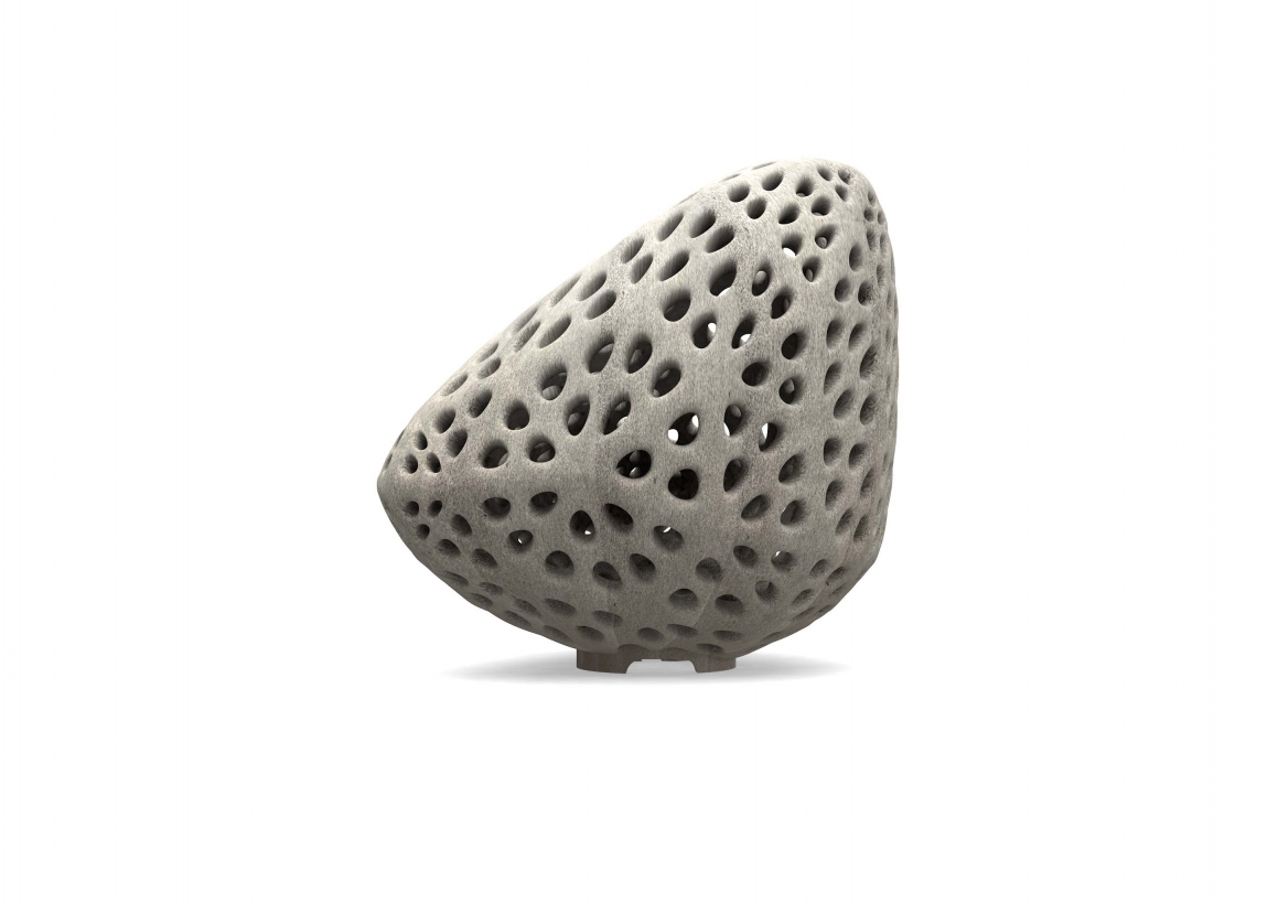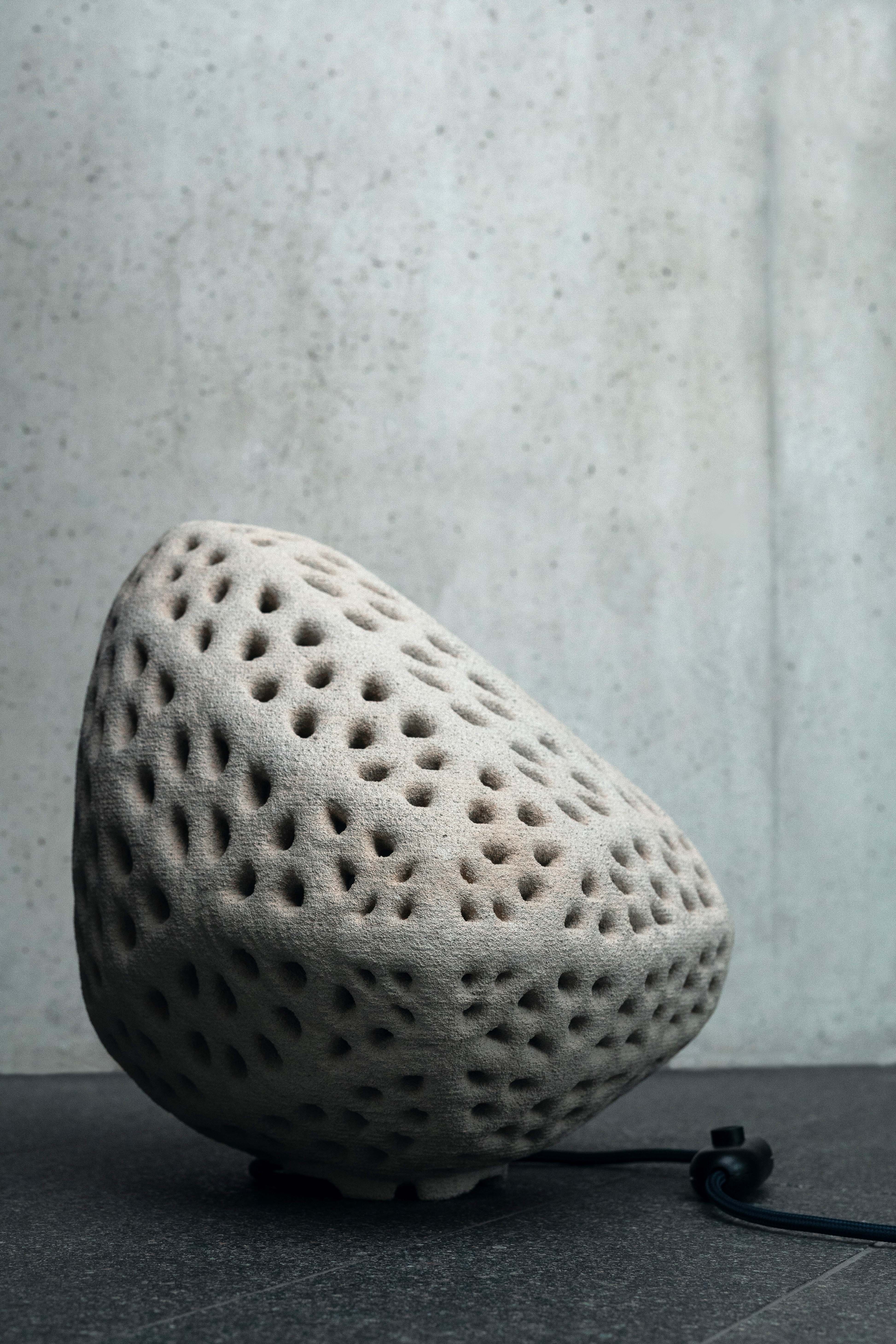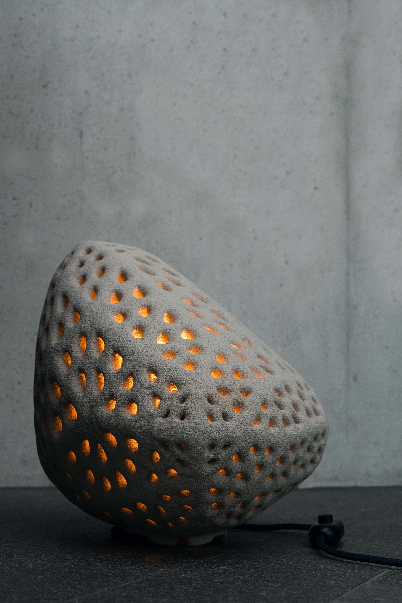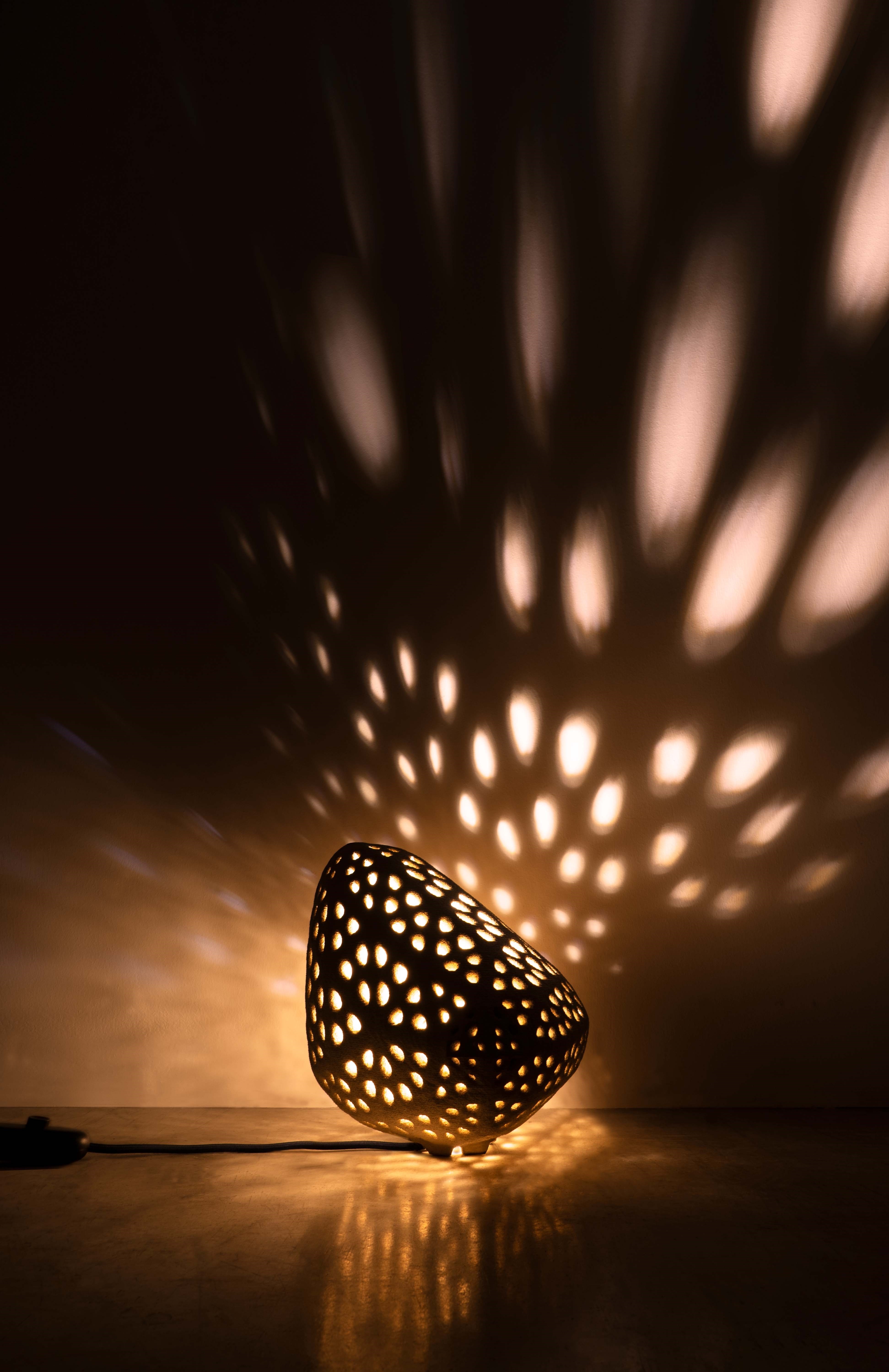Goccia di Luce is sustainably printed by the most advanced selective cement activation 3D printing process with recycled glass as base material and 250 pieces per print. The perforations and internal LED lighting create dramatic and mesmerizing light patterns, providing each lamp with a unique lighting signature.