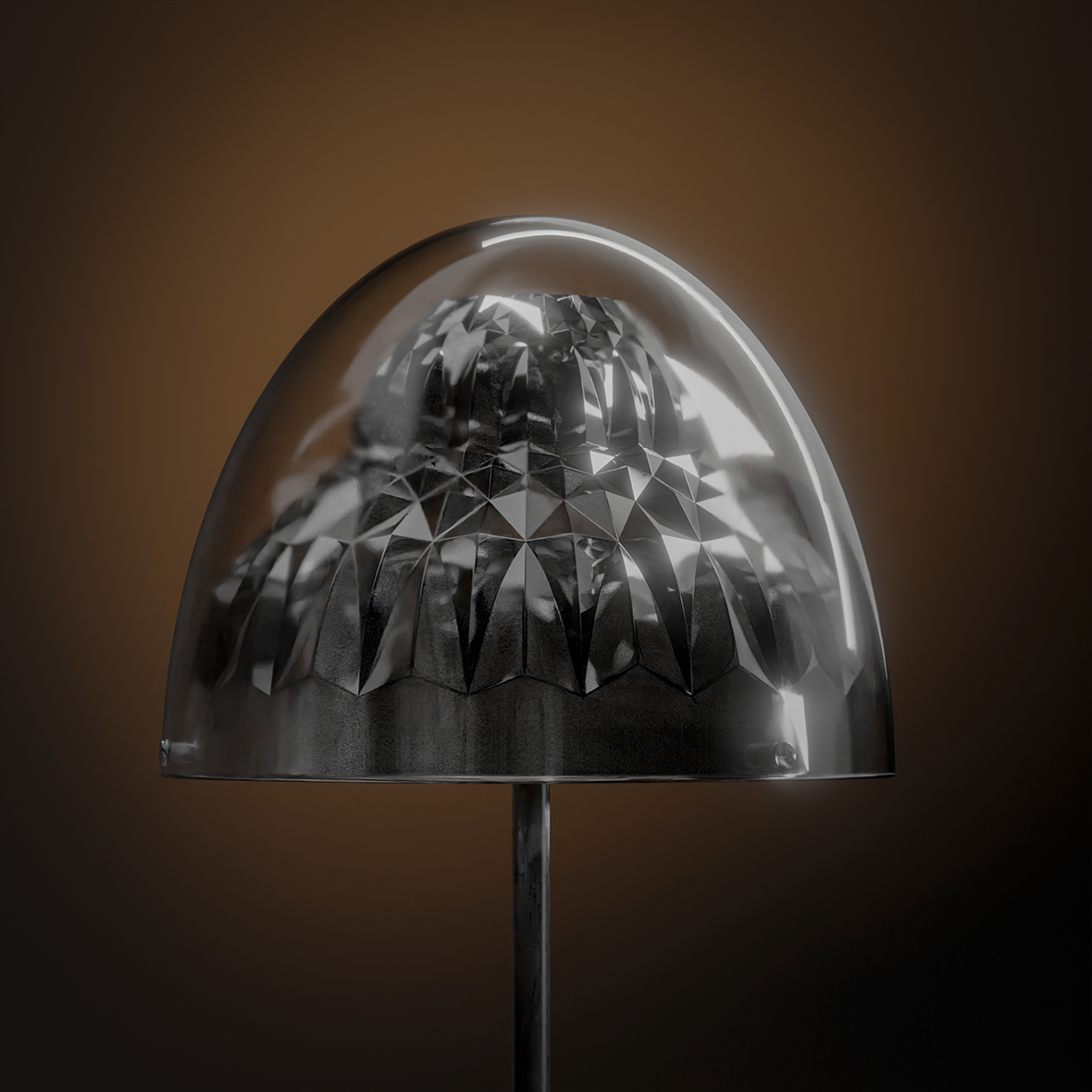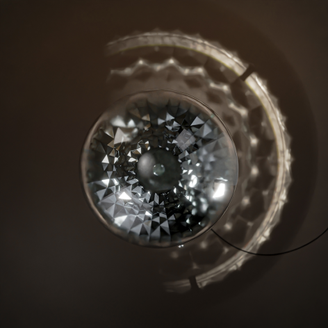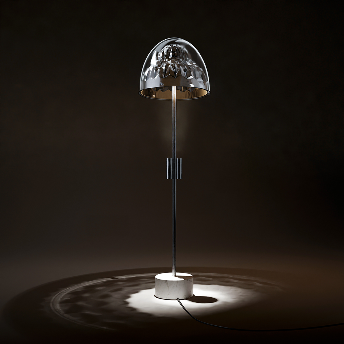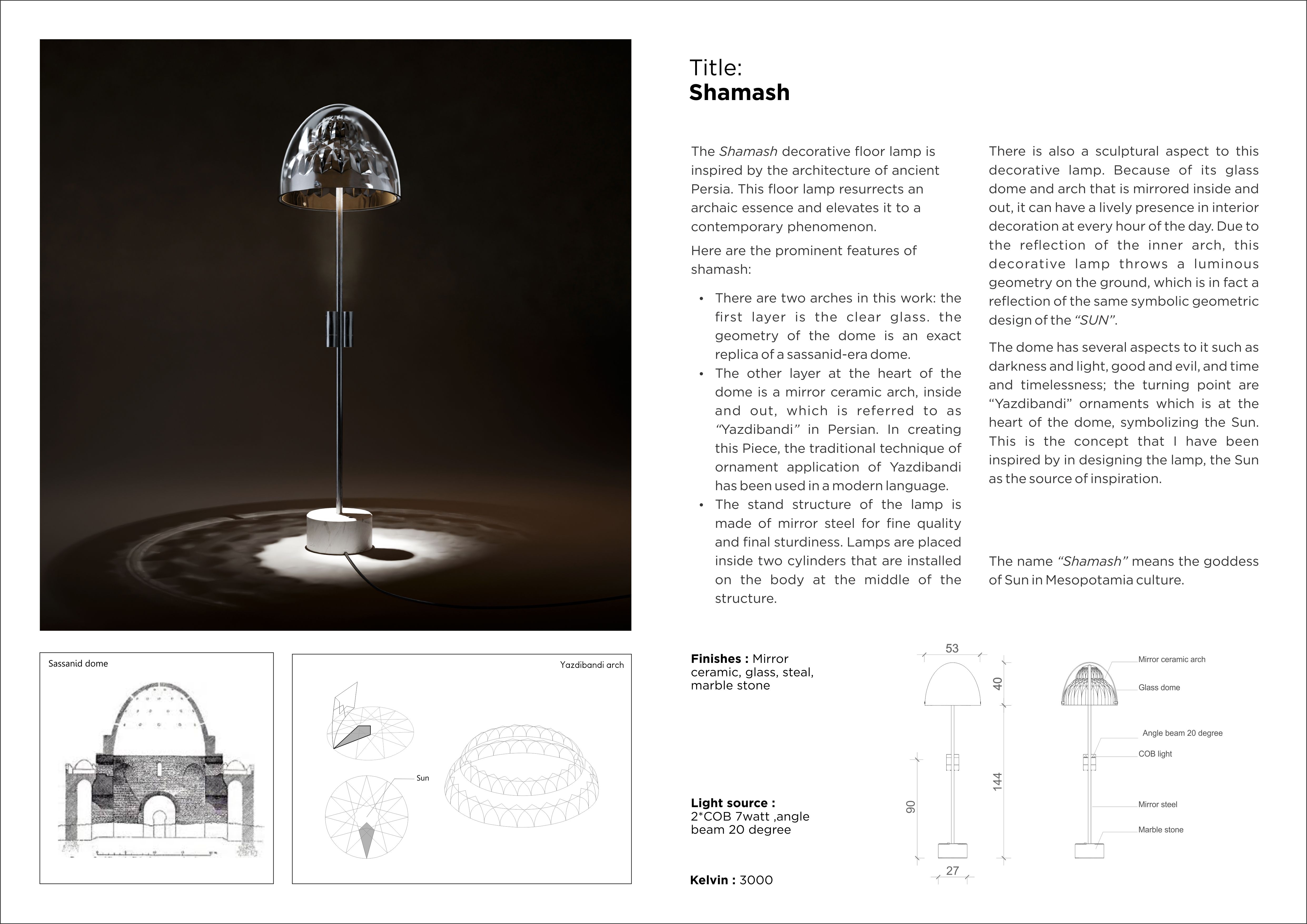 The floor lamp “Shamash” consists of three parts: a dome, a metal stand and a stone base. The head of the lamp consists of an integrated glass dome, which from the inside reaches a ceramic arched form that is connected to the glass shell with three pins. The arch is a mirror inside and out. The metal base is a tubular structure that rests on a stone cylinder from below, and is attached to the arch from above and acts as a support for the dome. In the middle of the metal base, two cylinders with a light source in them shoot light into the arch at a concentrated angle. The result of this reflection on ground is the formation of a geometric form of light that is a symbol of the Sun. Shamash is the ancient name of the Sun goddess in Mesopotamian civilization.