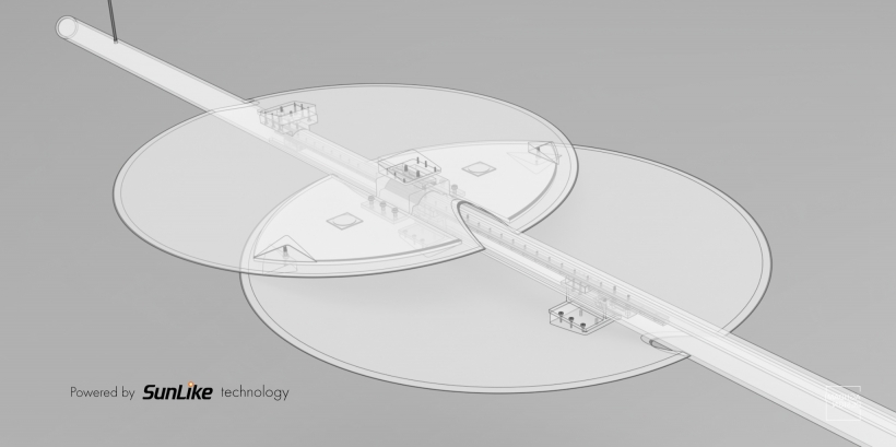 The design is inspired by Messier 104 Galaxy. Two circular aluminum light shells resemble the sombrero shape of the galaxy. They can be opened and closed by a sophisticated linear slider system, which is totally hidden inside of a wooden veneer pipe with metalcore. By adjusting the opening, you control the light intensity. The seamlessly sliding light shells act as efficient heat-sinks as well, increasing the lifespan of the high-watt LEDs significantly. Powered by the cutting-edge technology of Seoul Semiconductors’ Sunlike LED, renders the natural spectrum of our sun.
