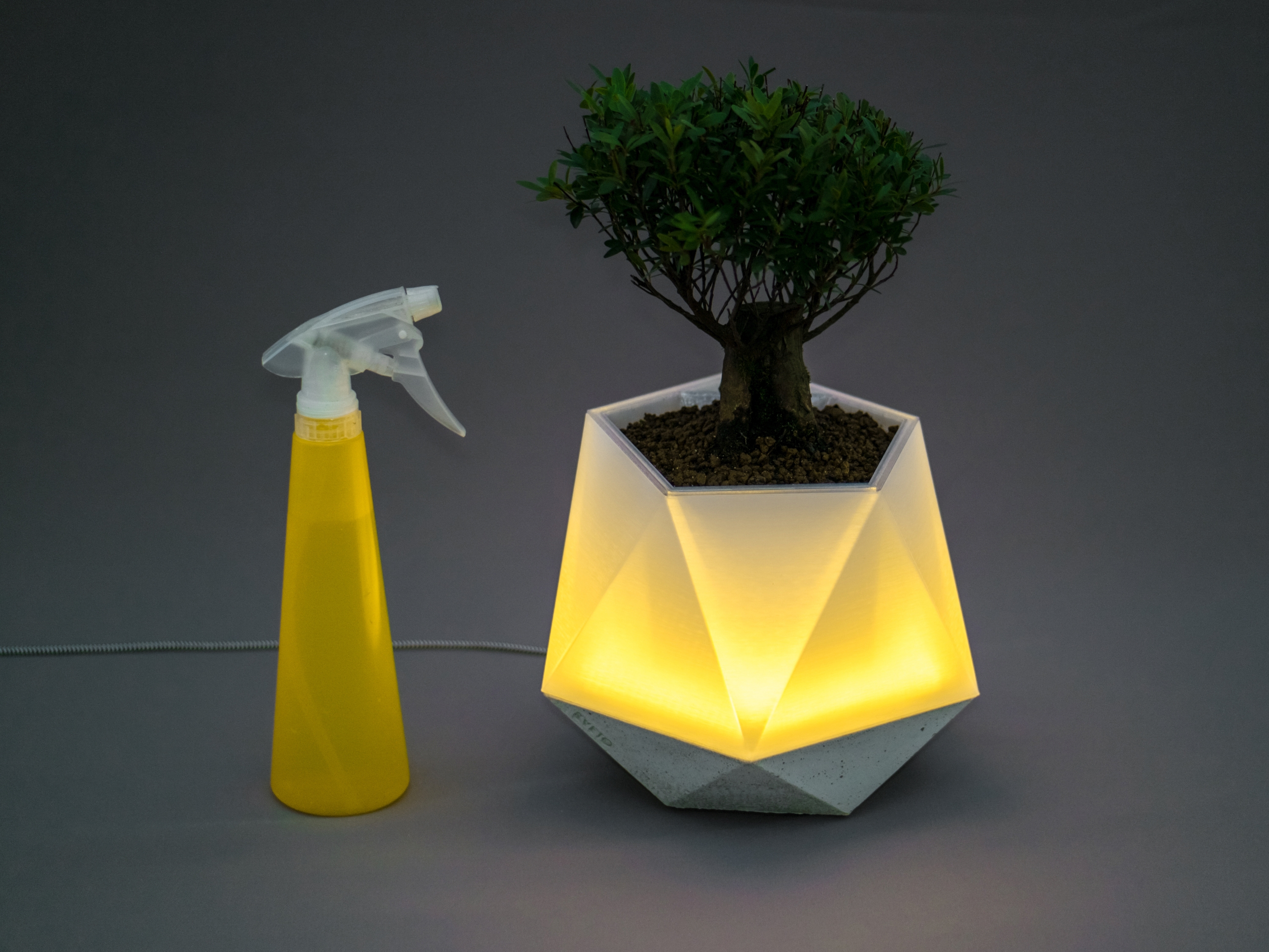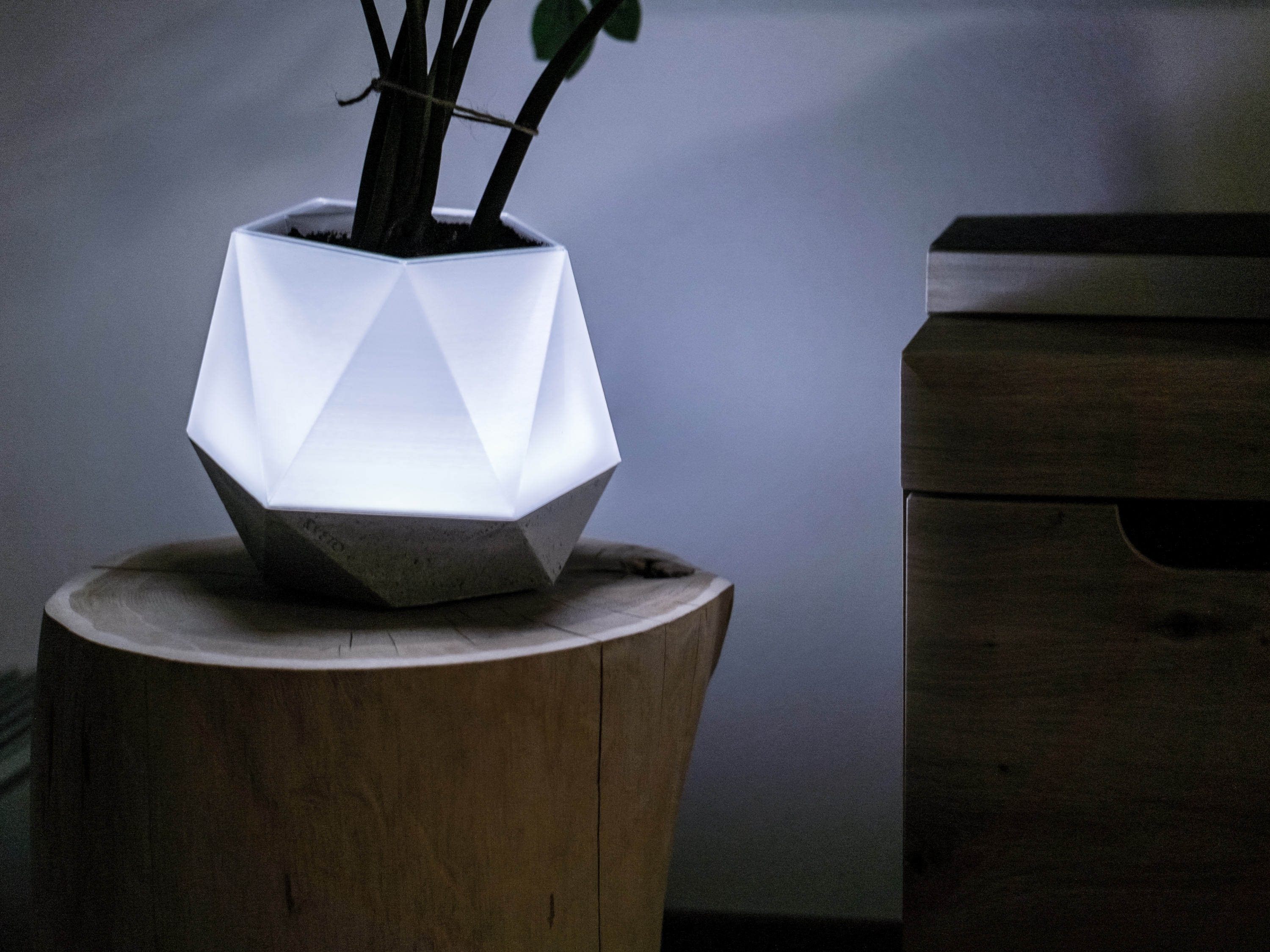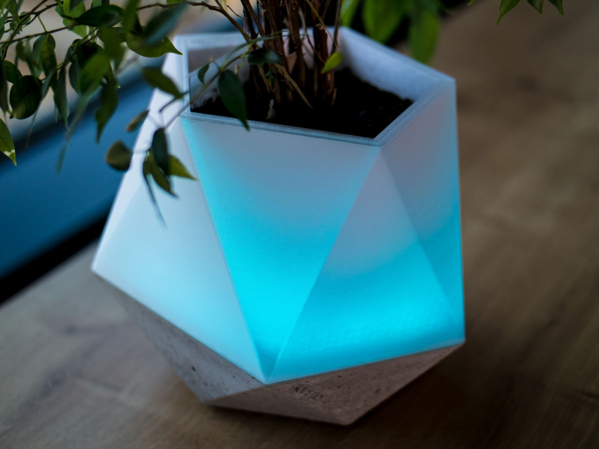 Entry DescriptionKveto was created in connection with the growing trend of smart home solutions. As is widely accepted, lighting plays a great part in living space quality - just like indoor plants do. This soulution responds to both needs and the result is a smart centrepiece mood lamp which serves as a flowerpot. The delicately textured upper part encases the plant in light, while the contrasting rough concrete provides a solid base. The lamp can be controlled with a remote or through the Zigbee 3.0 protocol, using popular home automation bridging devices and mobile apps. This allows for full spectrum of colors, timing, voice control, fading and other functions. The plant container is conically shaped so that only a small portion is submerged in the water container and the soil can slowly wick the water up. The dimensions are roughly 20 x 20 x 20 cm. The base is hand-cast from concrete in a silicon mold. Planter components are 3D printed using recycled and recyclable PETG filaments, which offer great durability in contact with moisture while being food-safe.