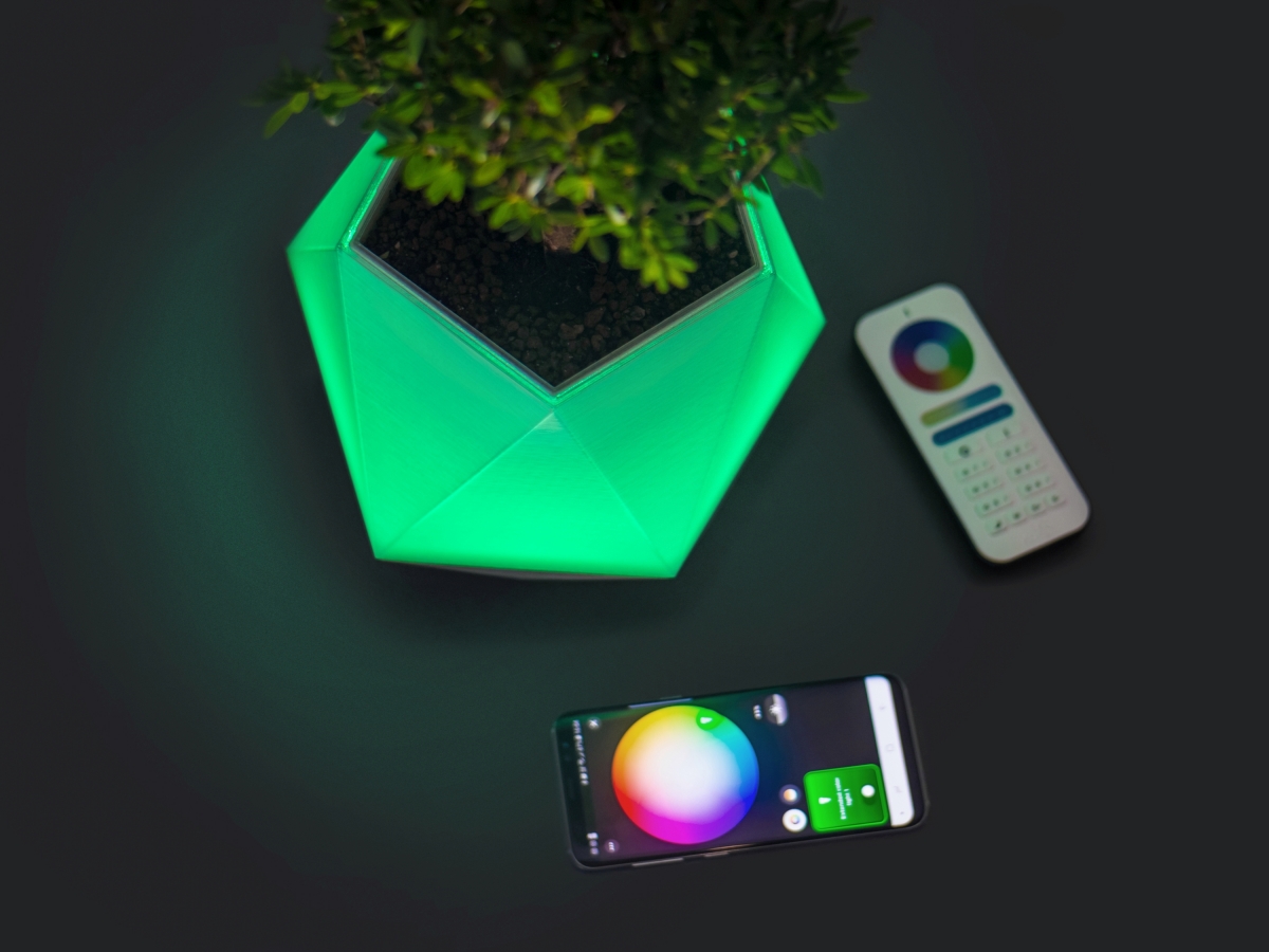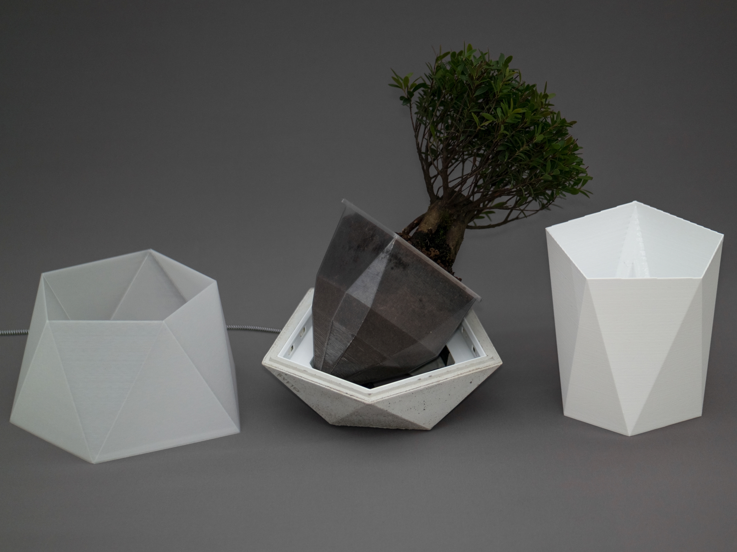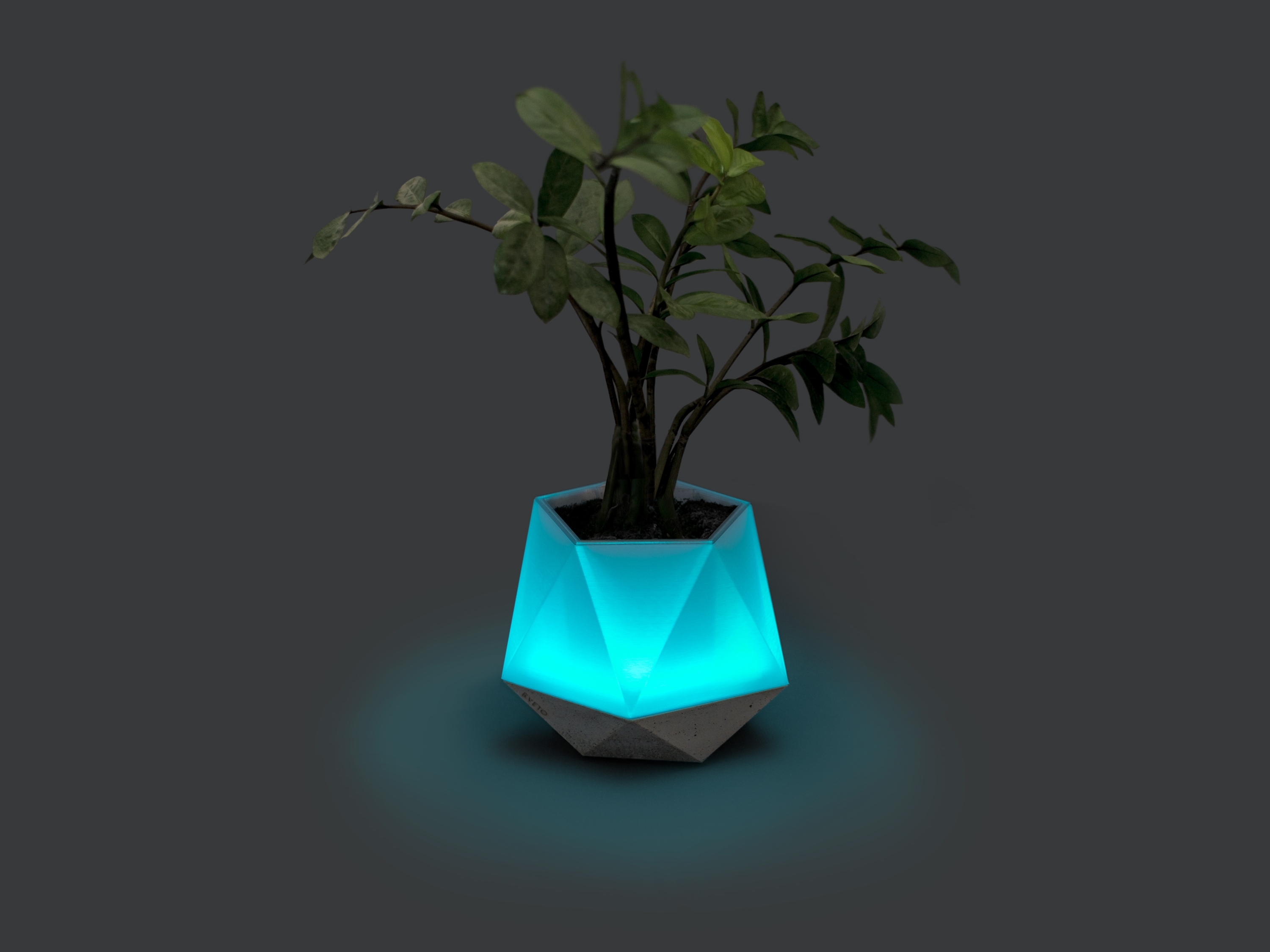 Entry DescriptionKveto was created in connection with the growing trend of smart home solutions. As is widely accepted, lighting plays a great part in living space quality - just like indoor plants do. This soulution responds to both needs and the result is a smart centrepiece mood lamp which serves as a flowerpot. The delicately textured upper part encases the plant in light, while the contrasting rough concrete provides a solid base. The lamp can be controlled with a remote or through the Zigbee 3.0 protocol, using popular home automation bridging devices and mobile apps. This allows for full spectrum of colors, timing, voice control, fading and other functions. The plant container is conically shaped so that only a small portion is submerged in the water container and the soil can slowly wick the water up. The dimensions are roughly 20 x 20 x 20 cm. The base is hand-cast from concrete in a silicon mold. Planter components are 3D printed using recycled and recyclable PETG filaments, which offer great durability in contact with moisture while being food-safe.