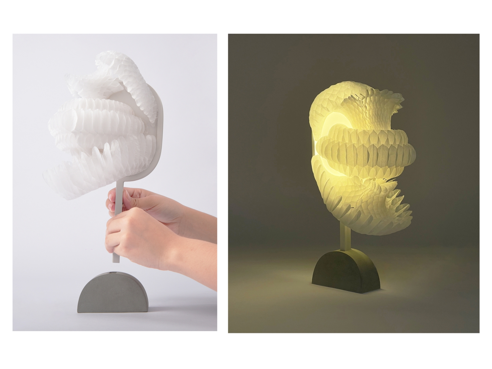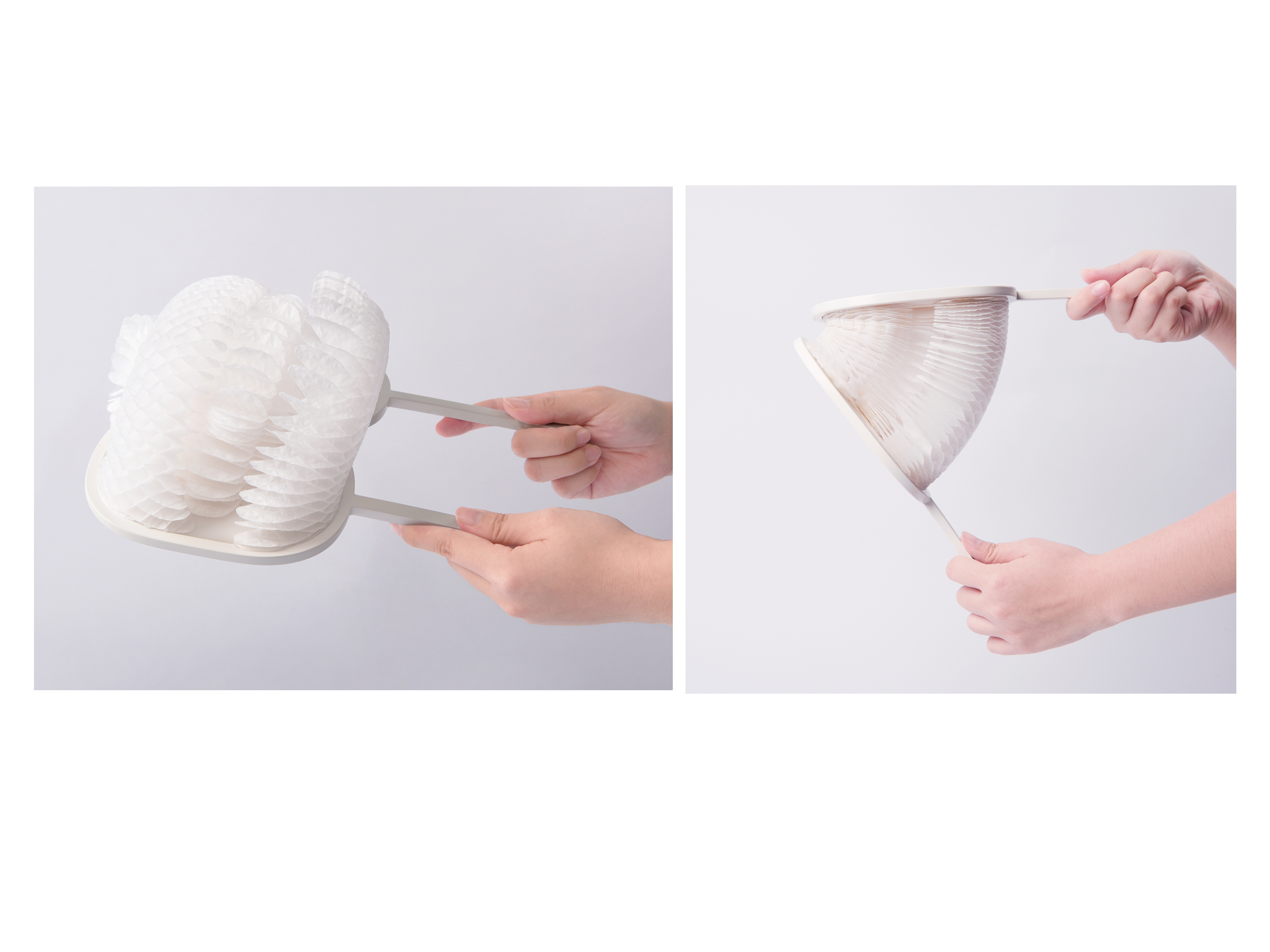 Fanhua lamp is a atmospheric lantern inspired by the traditional Chinese paper Fanhua toy. Fanhua lamp draws on the characteristics of traditional Chinese paper Fanhua, can be turned in different directions to get different forms of Fanhua shape, according to personal preferences, to fold their own desired lamp shape. The Fanhua lamp features very traditional Chinese cultural colors combined with Western minimalist modeling style, showing a sensual and wonderful and characteristic lighting atmosphere and vision value, while serving the indoor environment of the ambient lighting, the beautiful form of the lamp after folding also becomes an elegant decoration in the indoor environment.