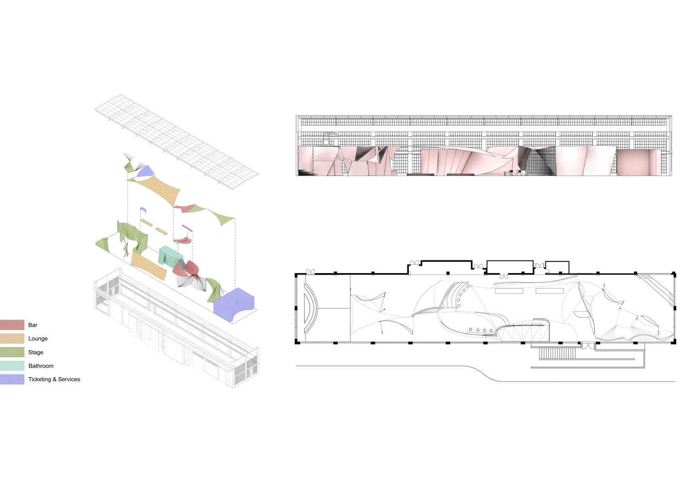 The performance areas will be activated by colorful adjustable stage lights, creating a visually engaging interplay of light and shadows. These lights provide direct illumination and are supplemented with additional spotlights that penetrate mesh fabrics allowing the light to pass through and create dramatic shadows.
