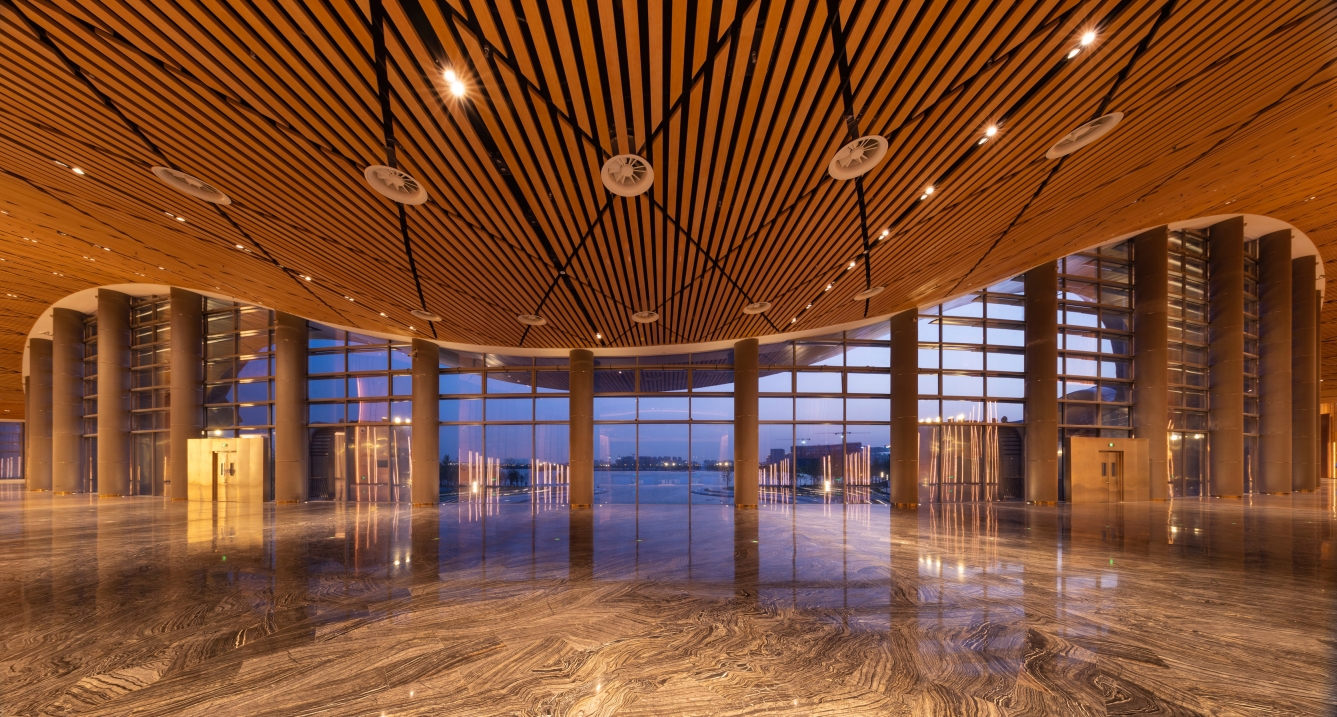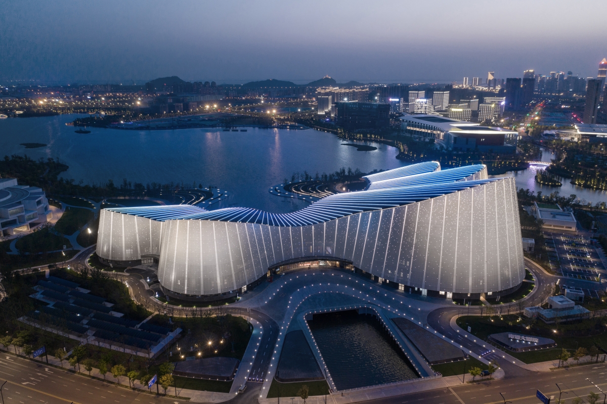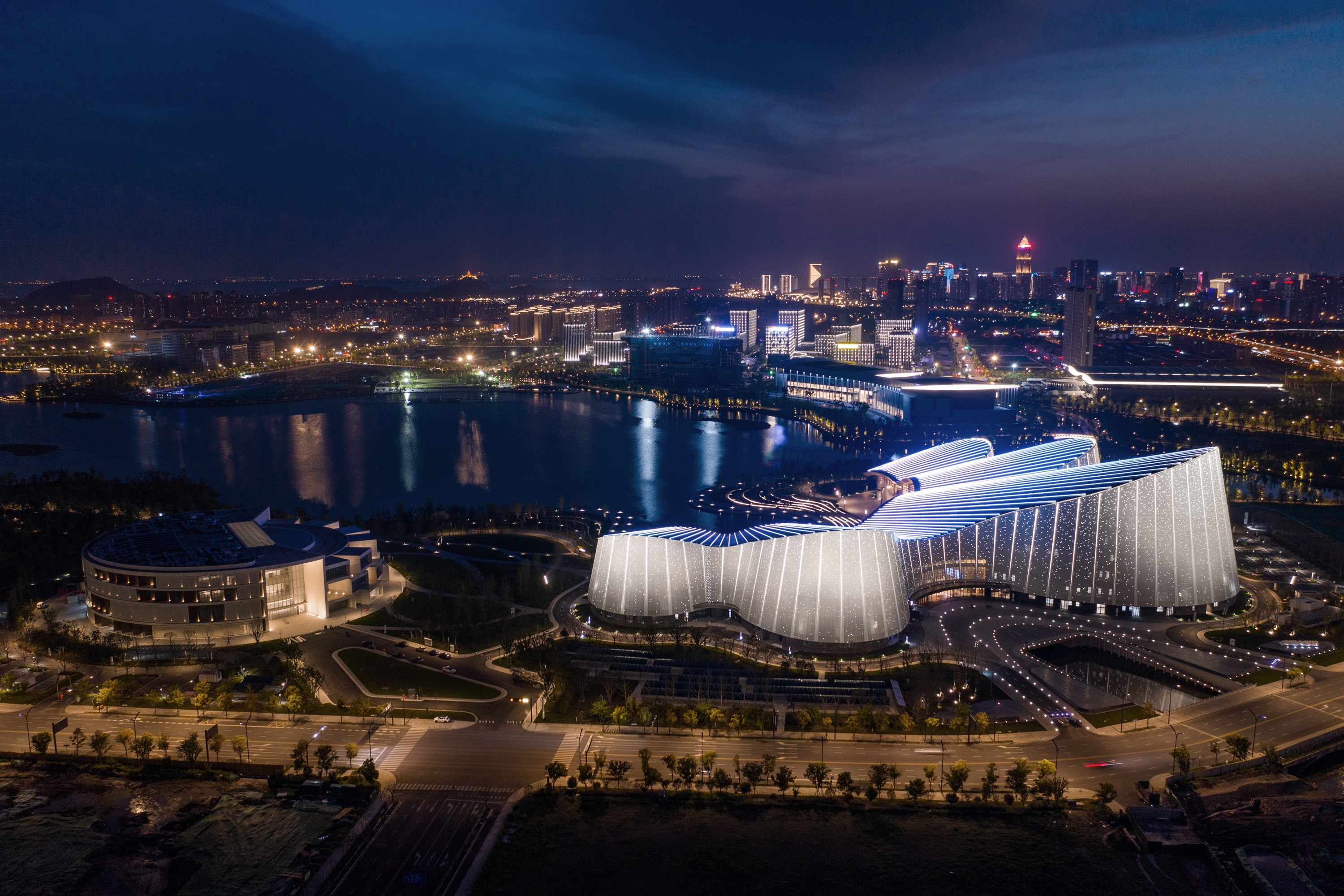 Entry DescriptionThe design concept of the Grand Theater is "Qin Mountain and Pearl Water". The Grand Theater adopts an undulating roof along the lake side, and the shape is stretched and smooth, like two concert pianos, releasing melodious music. On the city side, there is a softly curved, white stage tower, like a light auspicious cloud, stopping on the shore of Zilang Lake, guiding pedestrians to the lake and showing them the beautiful and moving lakeshore landscape. The facade of roof the Grand Theater are irregular curved surfaces, the lighting fixture is integrated with the curtain wall, so from the bird view the façade looks clean. Looking down from the air, the five halls are like five petals blooming on the shore of the Lake.The lighting planning strategy starts from the macro thinking of the overall innovation zone, takes planning characteristics and architectural genes as the main body, and uses lighting to bring out the unique features of the night. Especially for the Grand Theater, Art Gallery and the surrounding commercial spaces, from the aspect of integration and interaction, the lighting becomes a bond for the architects and landscape, activating the night of the city.