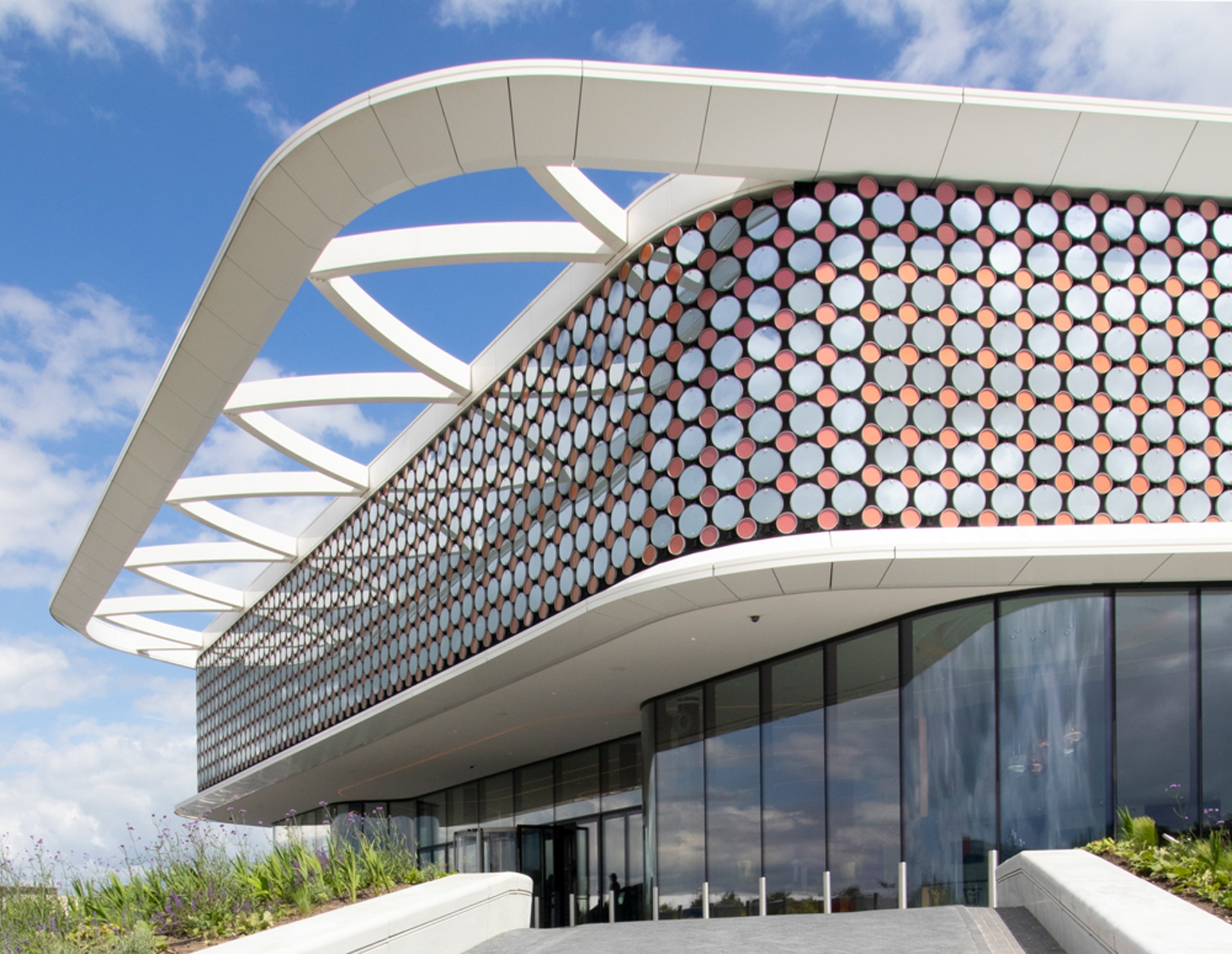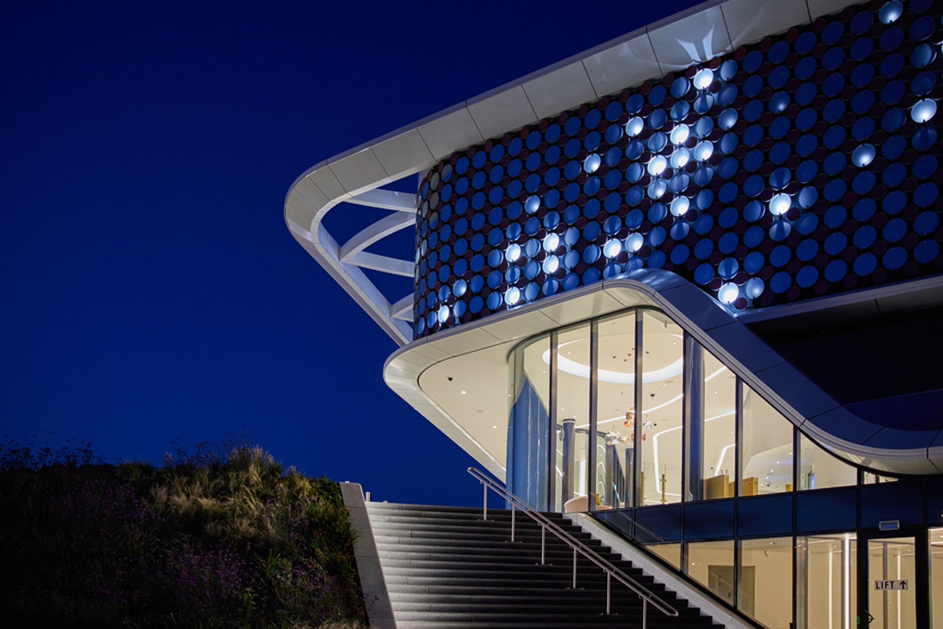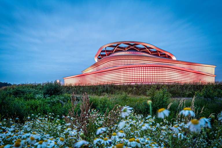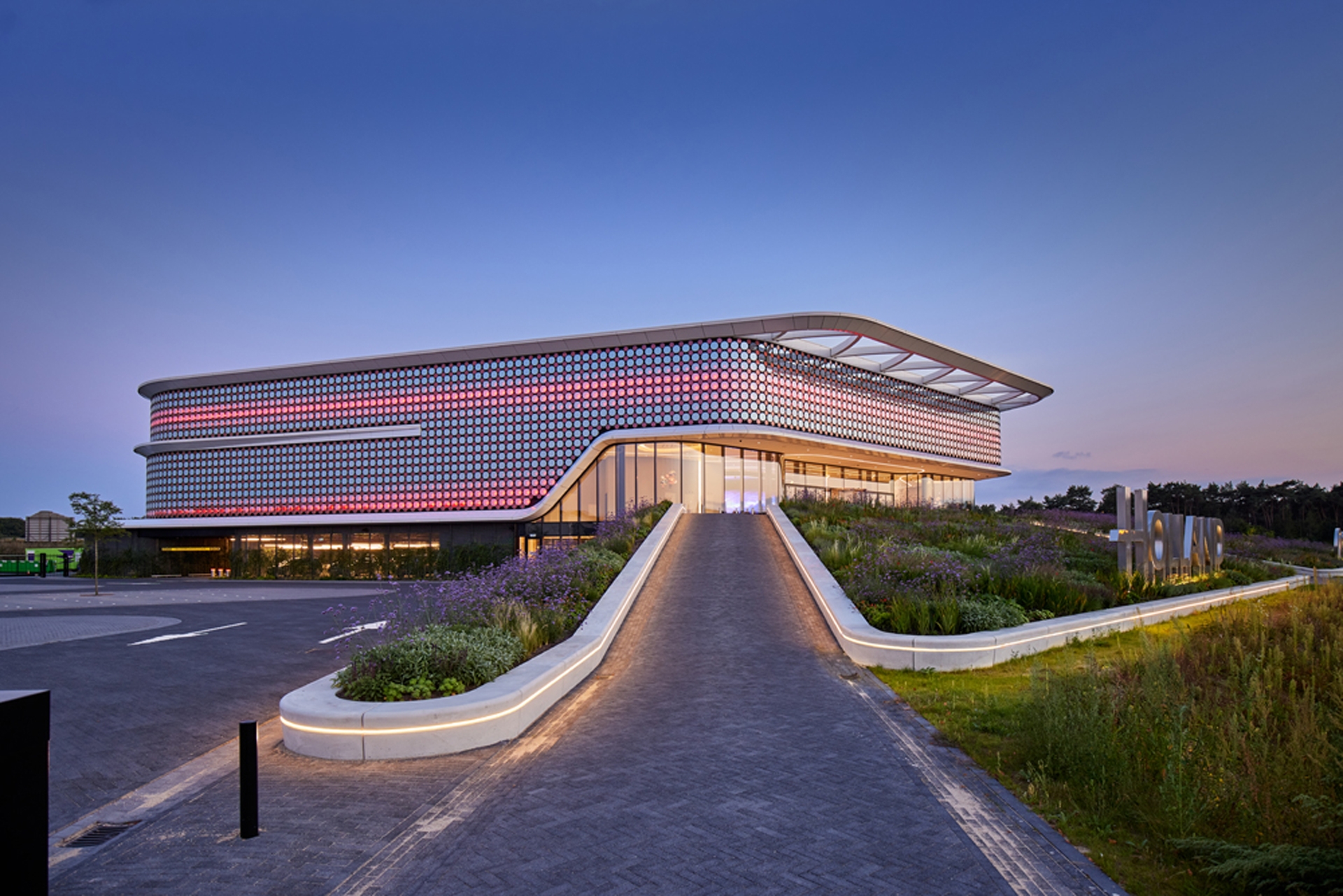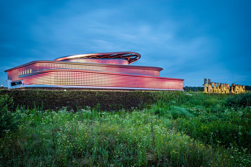 The new Holland Casino is immediately recognizable, thanks to its bold, organic design and spectacularly interactive façade. Located next to a major road junction, the building offers an unforgettable experience for passers-by as well as casino visitors. The façade is made up of a grid of glass disks, alternating with a grid of smaller metal elements. These have a duotone coating, which means that the building changes color as the visitor moves around it. From the road, the casino becomes a chameleon, projecting a vibrant image during the day thanks to its richly colored surface. The large glass discs are equipped with LEDs. By night they illuminate the façade in a spectacular fashion, highlighting the flower-shaped structure of the casino architecture. The LED façade is fully dynamic and programmable, so can be adjusted to express different themes. Maximizing the user experience both during the day and at night was the most important point of departure for the design.