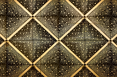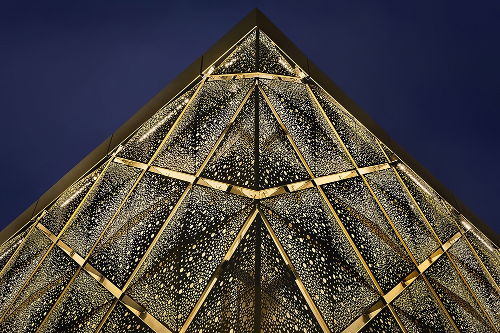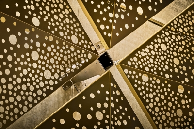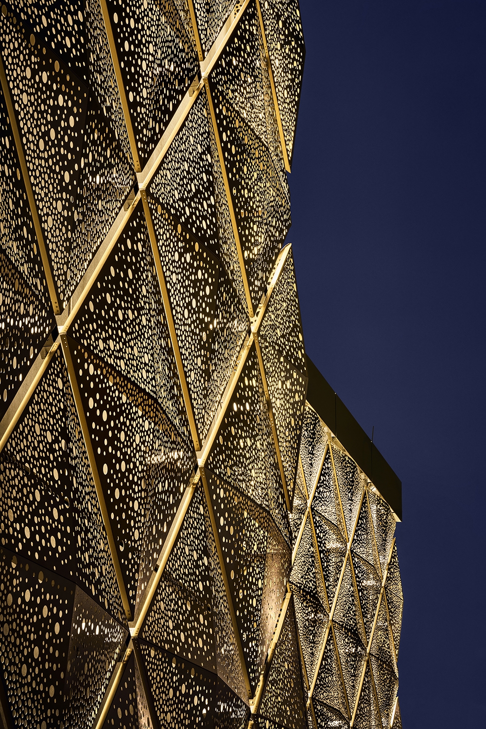 The structure is built in a polished frame of light- coloured precast concrete. To this is attached a screen of perforated gold-coloured aluminium cassettes in the shape of a shallow pyramid, which gives a visual depth to the façade. The perforation in the plates is irregular per mounting cassette.