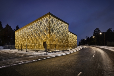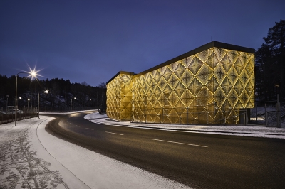 The building glows warmly in the evenings through the interaction between the building's volumes. Light fixtures attached at the eaves, washing the space between the outer shell and the concrete of the building structure. Light penetrates through the perforations and the interstices between panels. The glossy light concrete in turn enhances the light reflected on the back of the gold-coloured plates. Overall, the building contributes to a sense of increased security and a warmth in the area at night, along with a glowing, magical dimension.