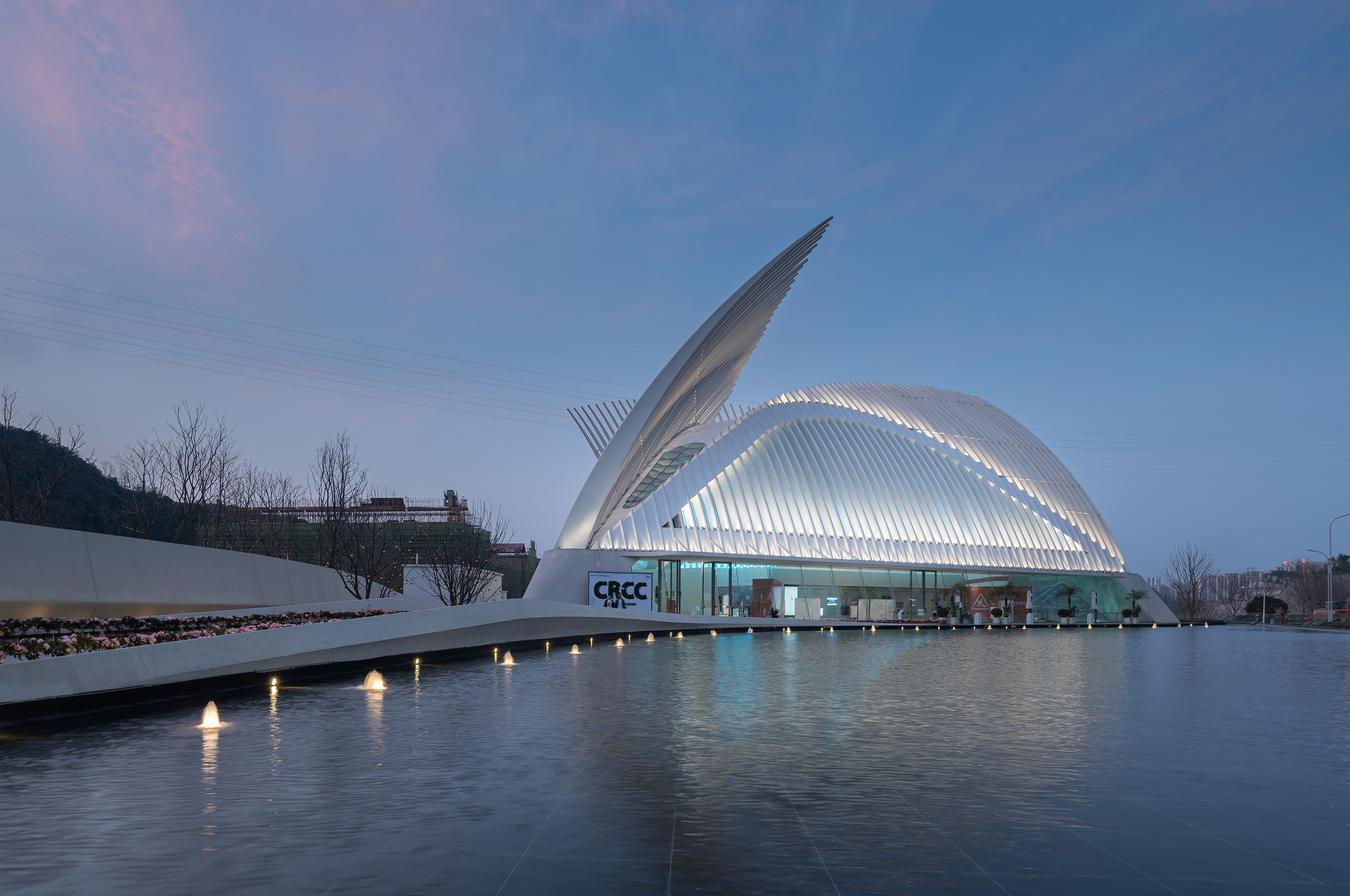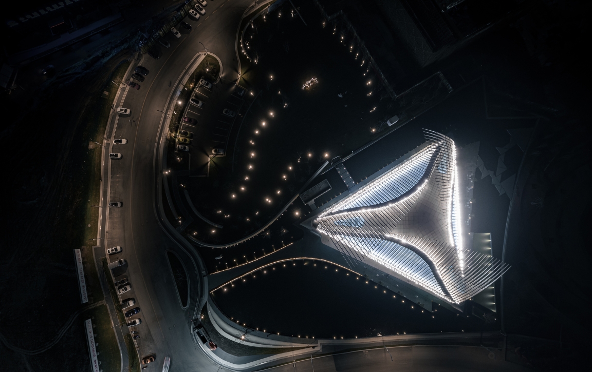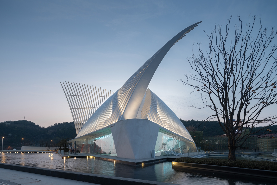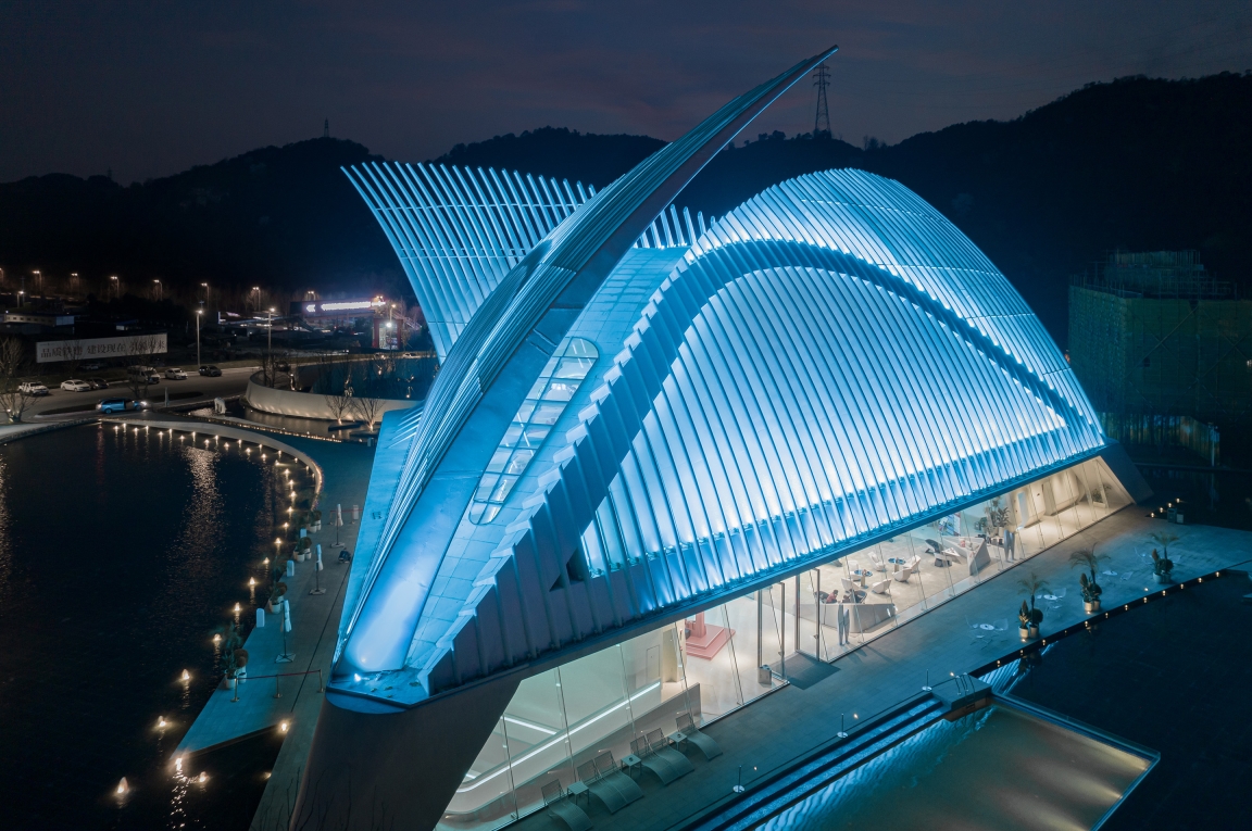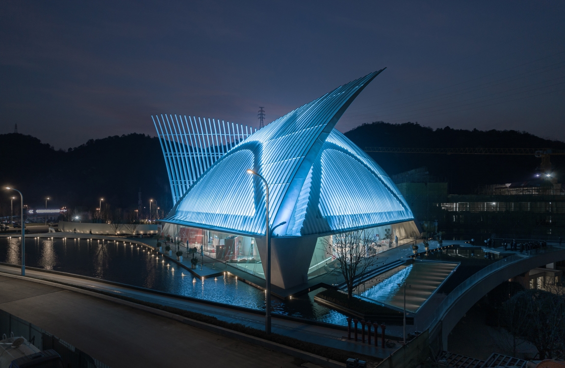 Entry DescriptionThe building is like an aircraft in shape, with "feather wings" extending into the air and a space cavity like a crystal for people to move around. We emphasize the elegance of the "feather wings" with the small floodlights hidden on the curtain wall. With the input of the dynamic program, the light is like clouds and water flowing everywhere, while the "feather wings" waving in the air.