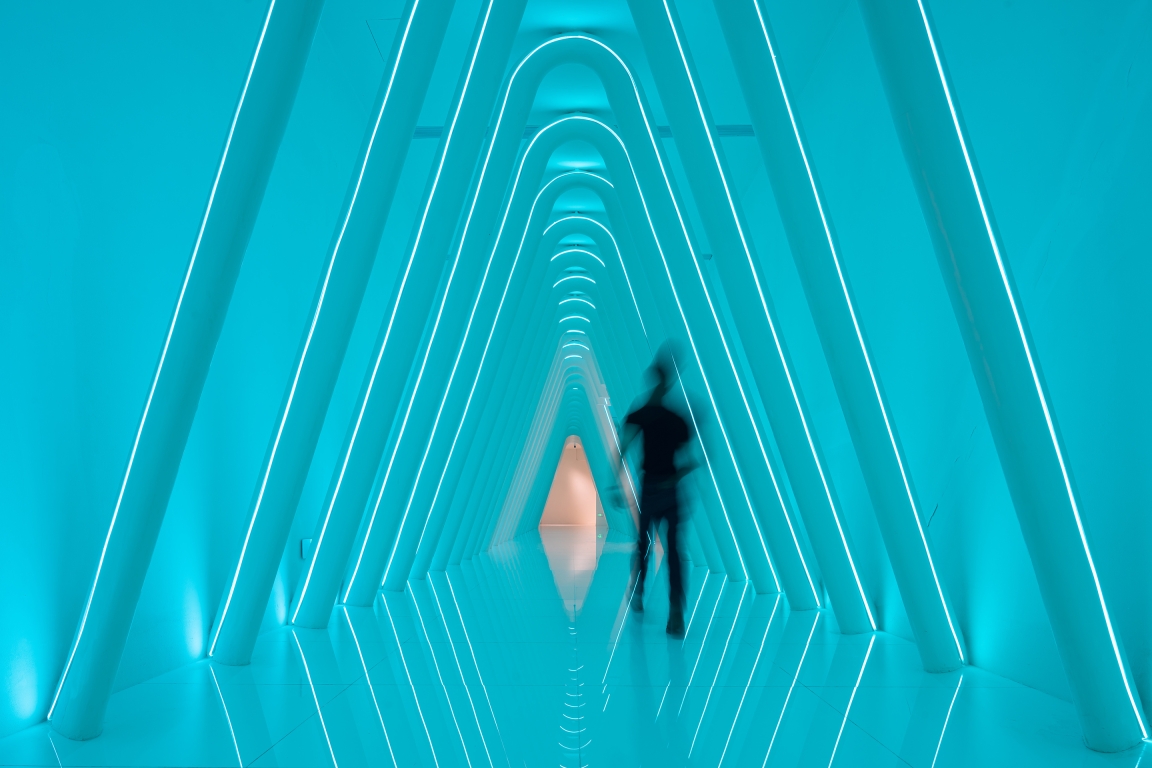 The circular corridor is like a time-space tunnel, deep and full of mystery. It is composed of layers of vertical structures. Stepping inside, you will immerse in an infinitely profound atmosphere. This immersive lighting experience is exactly what we want to create in this space.