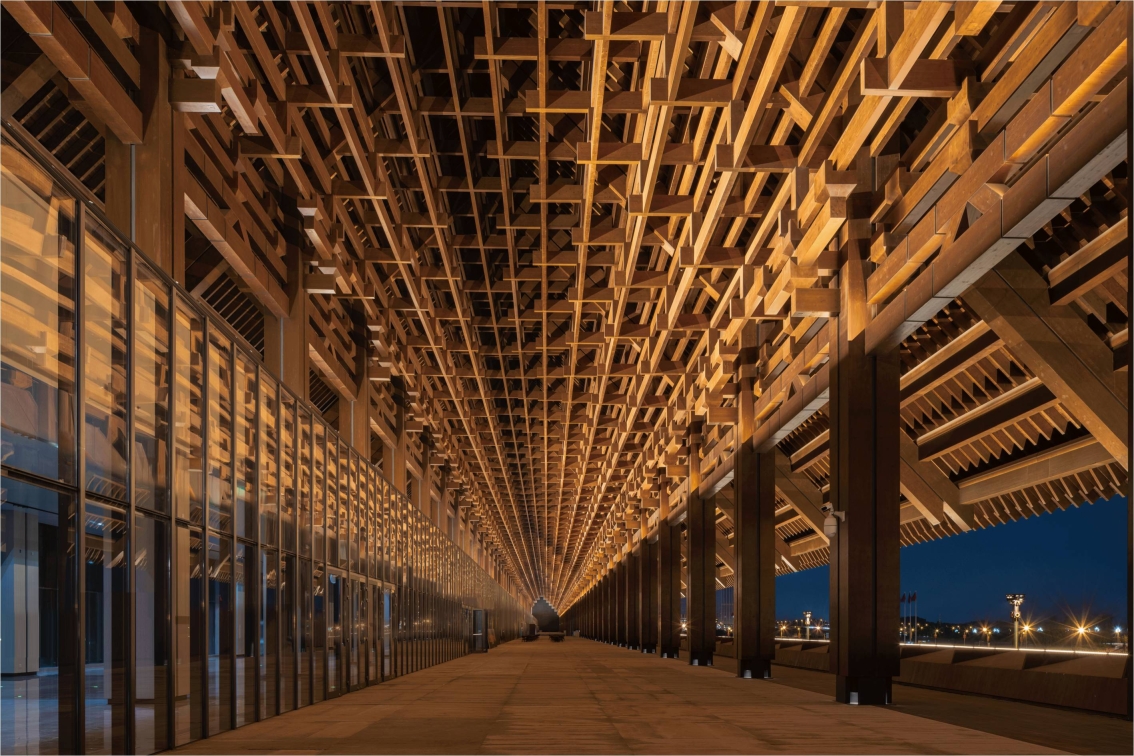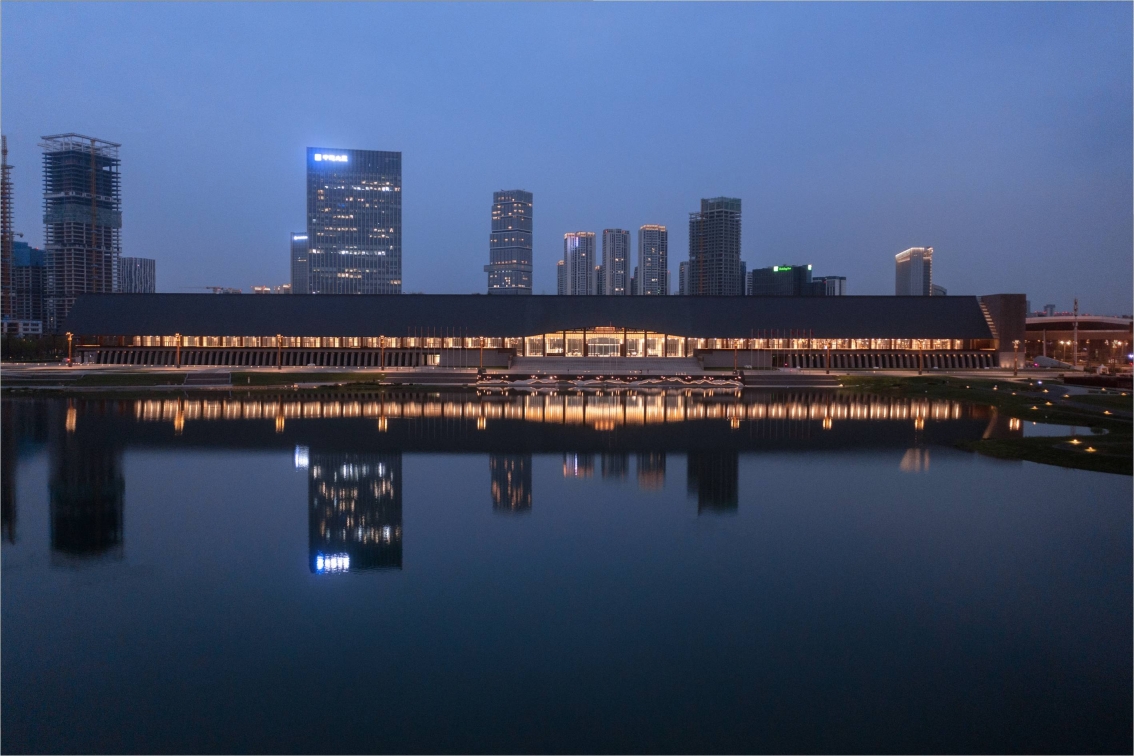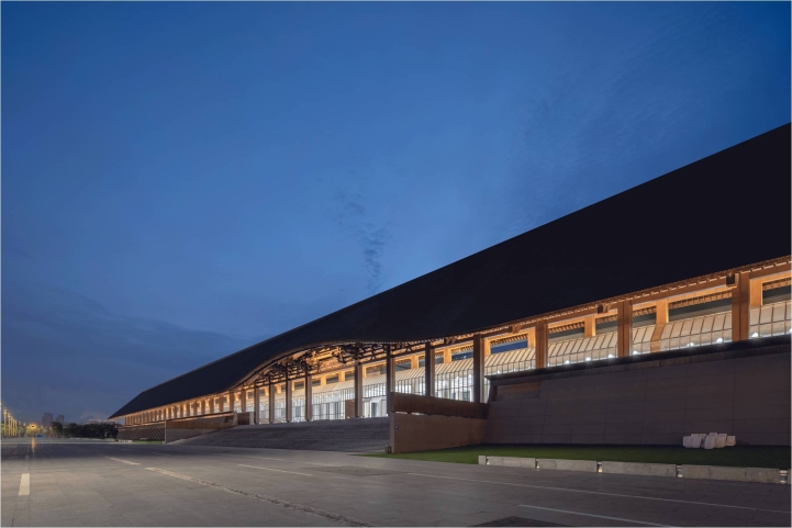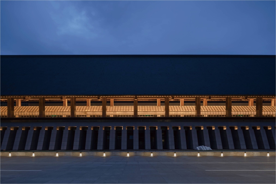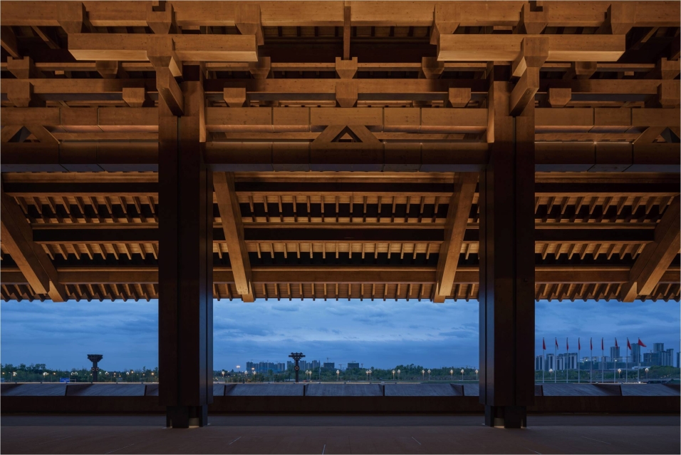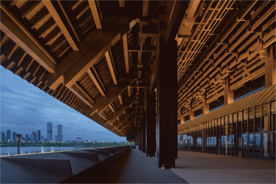 The 424m eave corridor on the edge of the lake has become a large space under the eaves with public and multi-meaning, which has the open and free space form of the traditional folk houses in Chengdu.Lighting creates a light eaves corridor, transparent space level.The base of the vestibule, based on the traditional Chinese base style, is composed and heavy. The lighting highlights the continuity of the base and the local embellishment, which is consistent with the overall design idea.The roof frame system of eaves gallery is derived from the beam structure of traditional Chinese folk houses, and further variation and abstraction are made.The super-long volume conveys a modern architectural scale.The lighting is set at the beam of the internal eaves corridor, which displays the wood structure level delicately. The cross reflection of light and shadow sets off the warm space