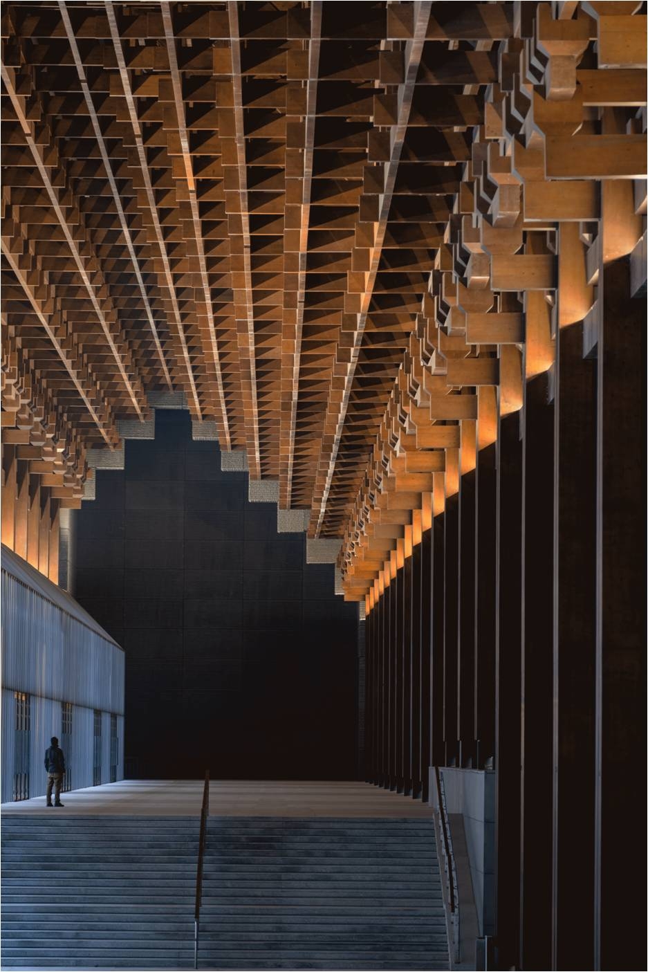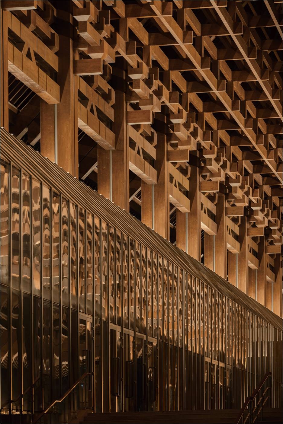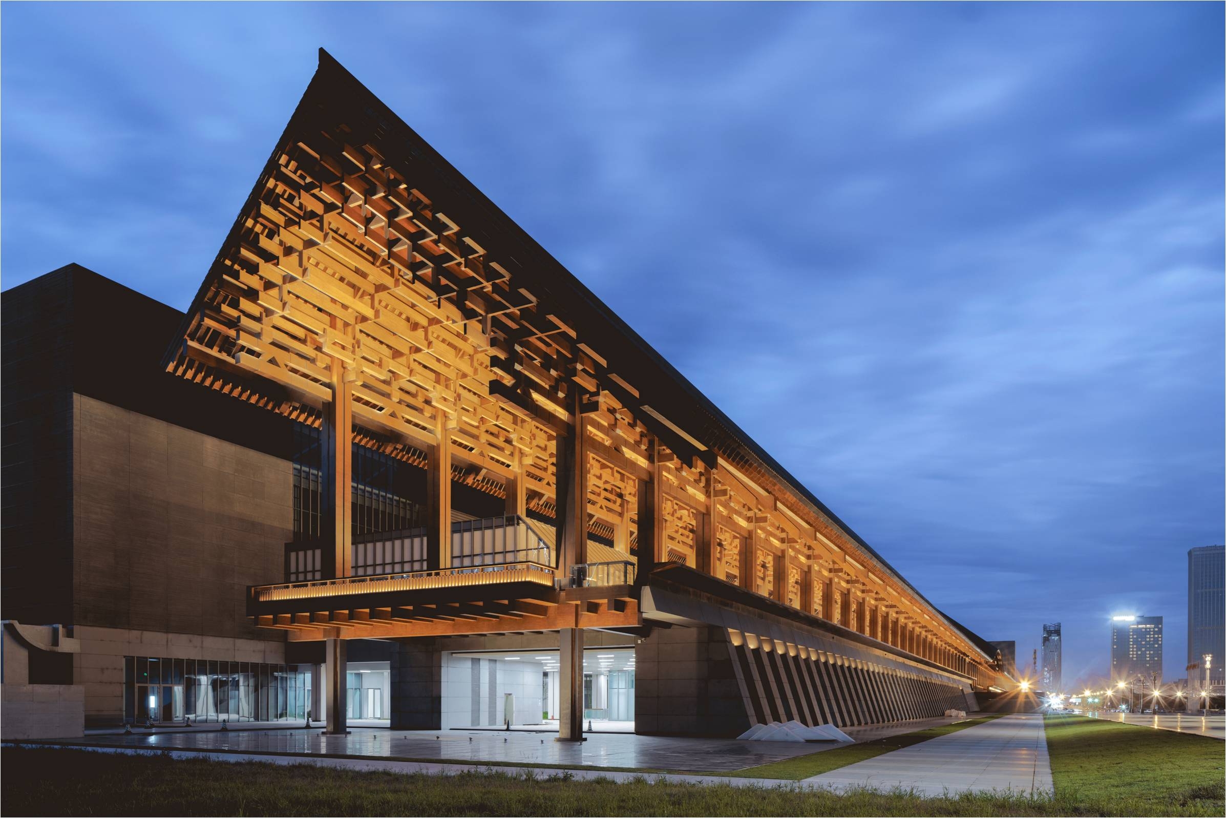 The 424m eave corridor on the edge of the lake has become a large space under the eaves with public and multi-meaning, which has the open and free space form of the traditional folk houses in Chengdu.Lighting creates a light eaves corridor, transparent space level.The base of the vestibule, based on the traditional Chinese base style, is composed and heavy. The lighting highlights the continuity of the base and the local embellishment, which is consistent with the overall design idea.The roof frame system of eaves gallery is derived from the beam structure of traditional Chinese folk houses, and further variation and abstraction are made.The super-long volume conveys a modern architectural scale.The lighting is set at the beam of the internal eaves corridor, which displays the wood structure level delicately. The cross reflection of light and shadow sets off the warm space