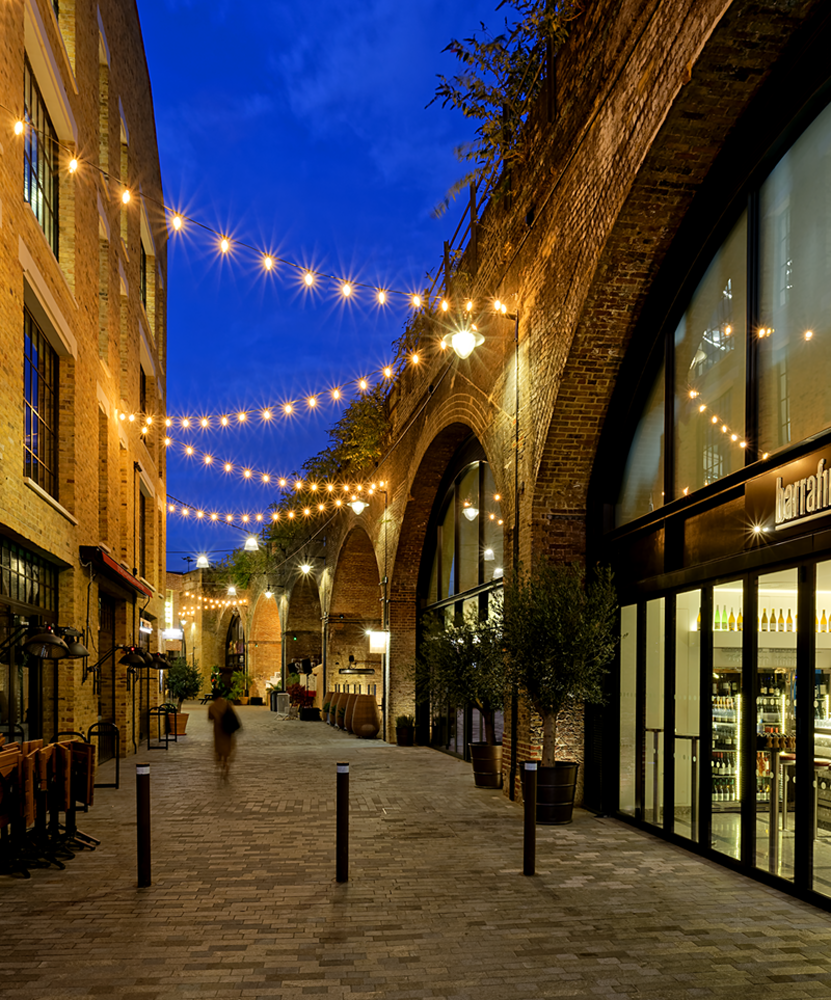 Entry DescriptionBorough Yards is one of London’s newest mixed-use developments. Located in the London Borough of Southwark, it has been conceived as an “artisan retail hub” based around a series of restored and reconceived Victorian railway arches. The scope included lighting for all public realm areas, exterior building accent lighting and all interior lighting to the repurposed arcades. The lighting design has been developed to celebrate the London Victorian architectural heritage, whilst providing a vibrant and welcoming lighting atmosphere at night. Working in the context of the historic neighbourhood was one of the most important aspects of the design. The traditional building-mounted lantern type has been used - with a modern twist - to illuminate the exterior lanes, whilst contemporary catenary lanterns have been proposed over the main public open space. The sequence of arched gateways has been highlighted, externally and internally, with ground recessed uplights to create a dramatic rhythm, enhancing the texture and materiality of the architecture. The lighting to the interior arcades has been developed to be concealed and minimally integrated within the architecture. With this aim, we designed a series of spandrel integrated spotlights that, by uplighting, reveal the beauty of the existing brickwork, and provide circulation and accent lighting to the retail arcades.