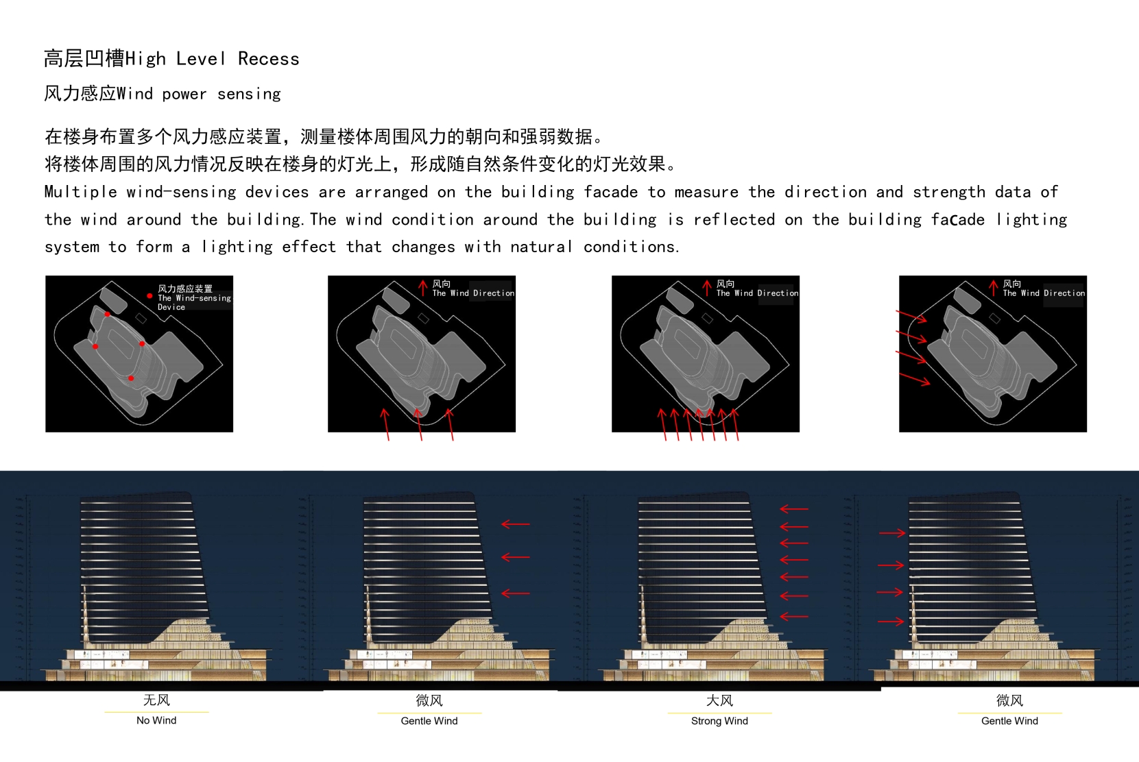 The horizontal lines of the building become the best carrier of light to interpret a visual wind track through light. The horizontally extended light makes it easier to feel the wind blowing the building To avoid repetition and sensory tedium, and to make this horizontal flow of light closer to the natural wind form, wind sensors are added to help realize the connection between wind and light.