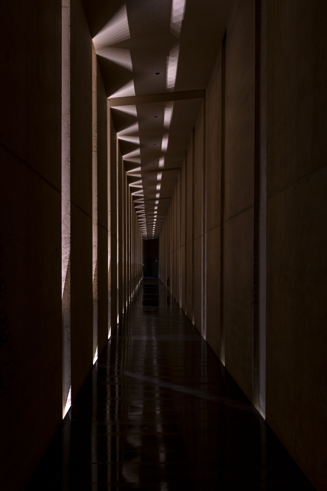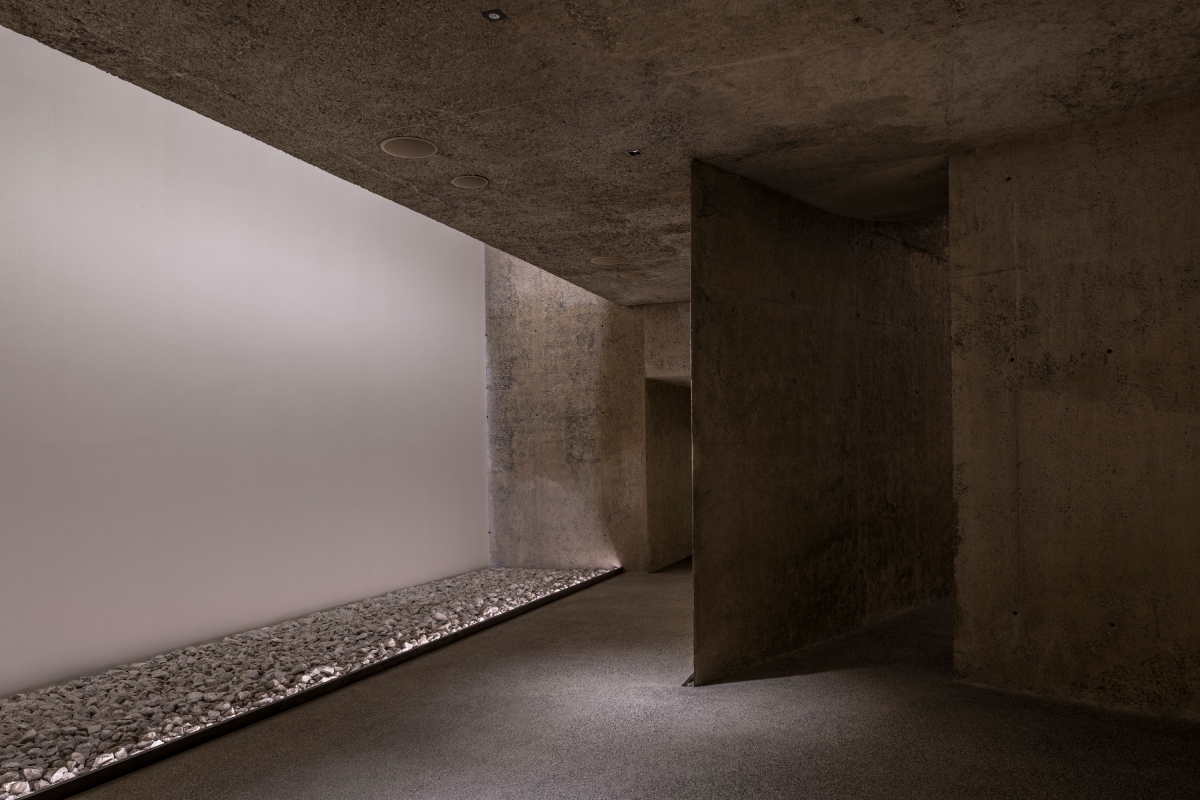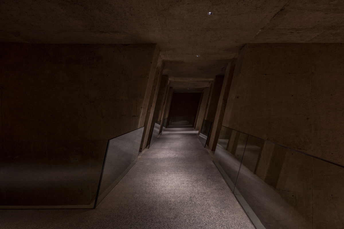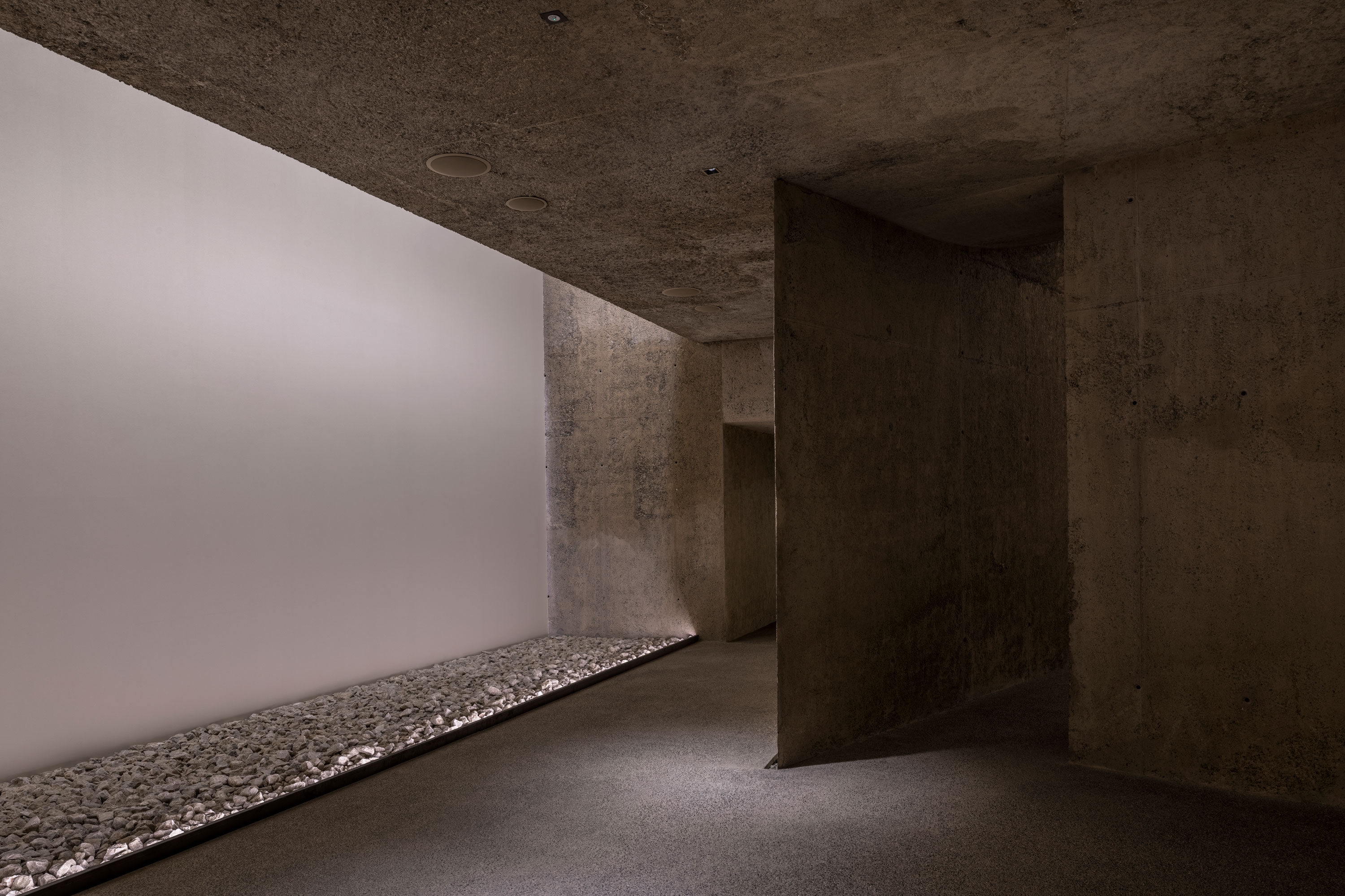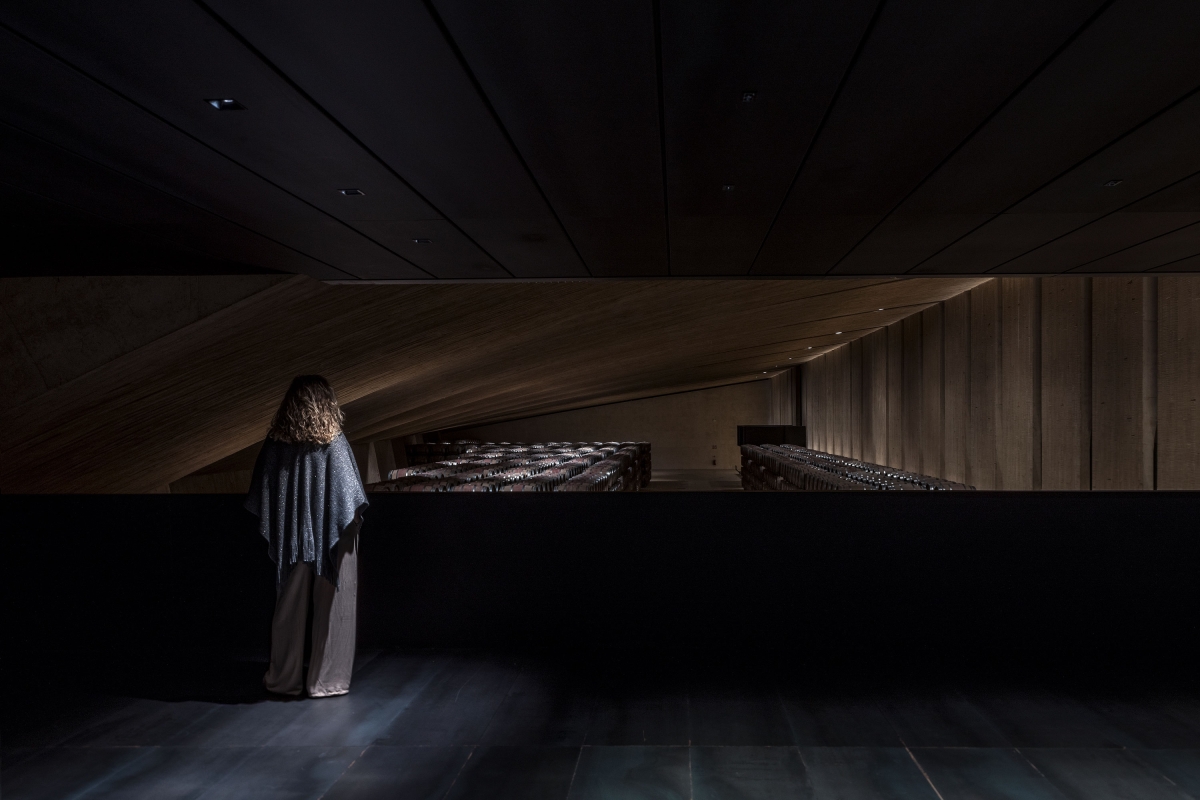 The wine aging barrels room is an intimate space, with light fixtures built into the slits with a trail of indirect light coming from the wall stretching across the ceiling. The journey ends in The Temple, a subtle treatment of natural light preserves the mystical essence of the space