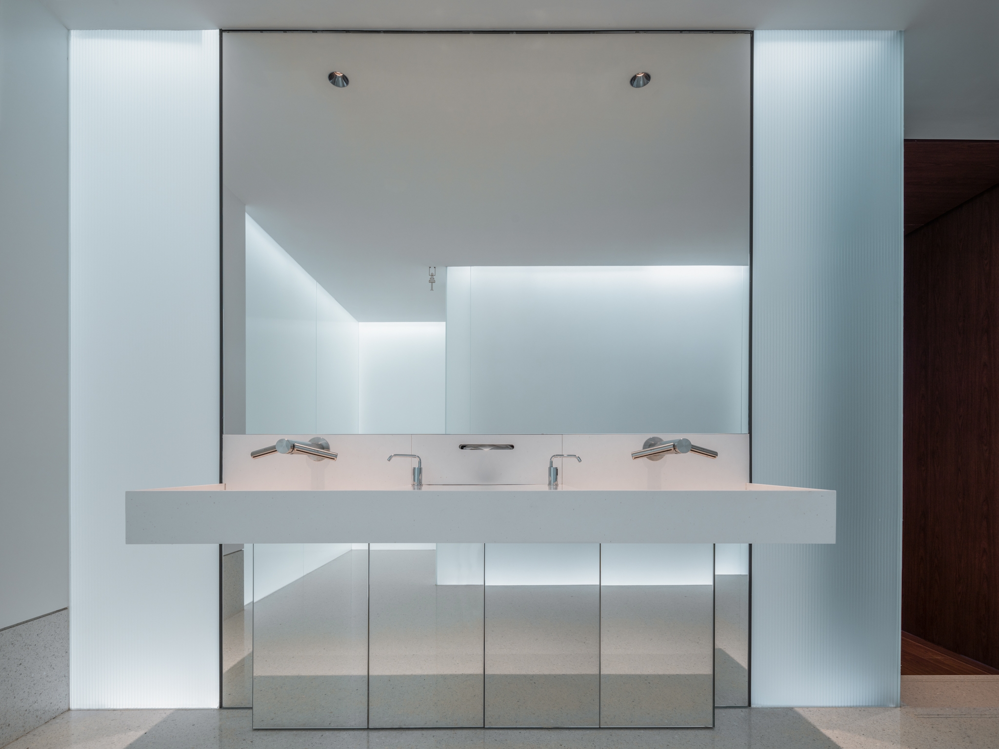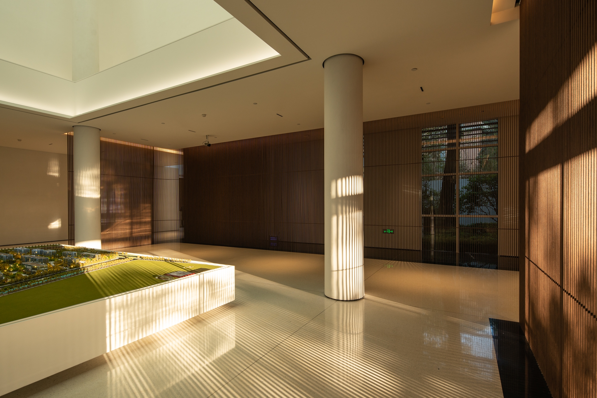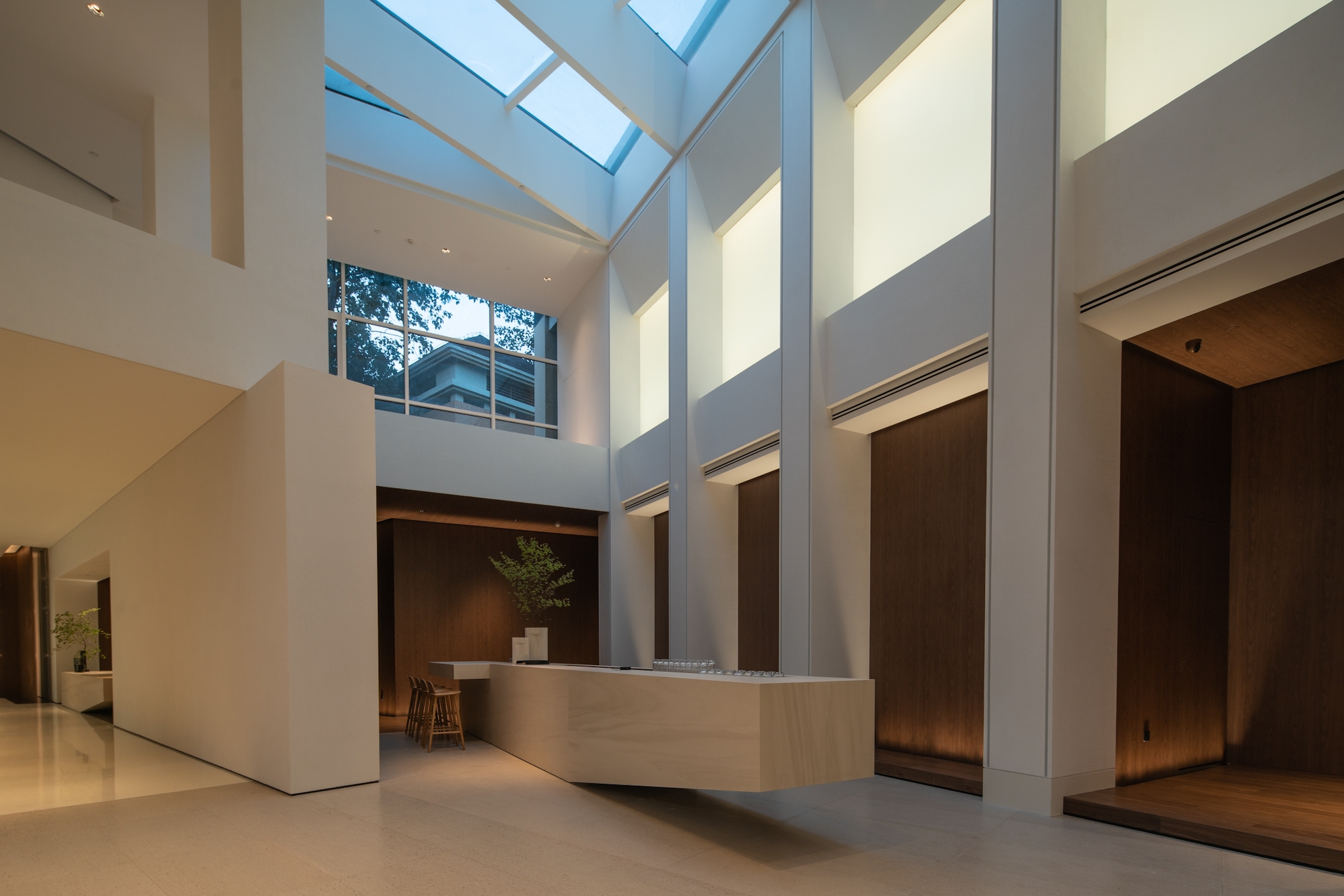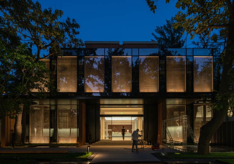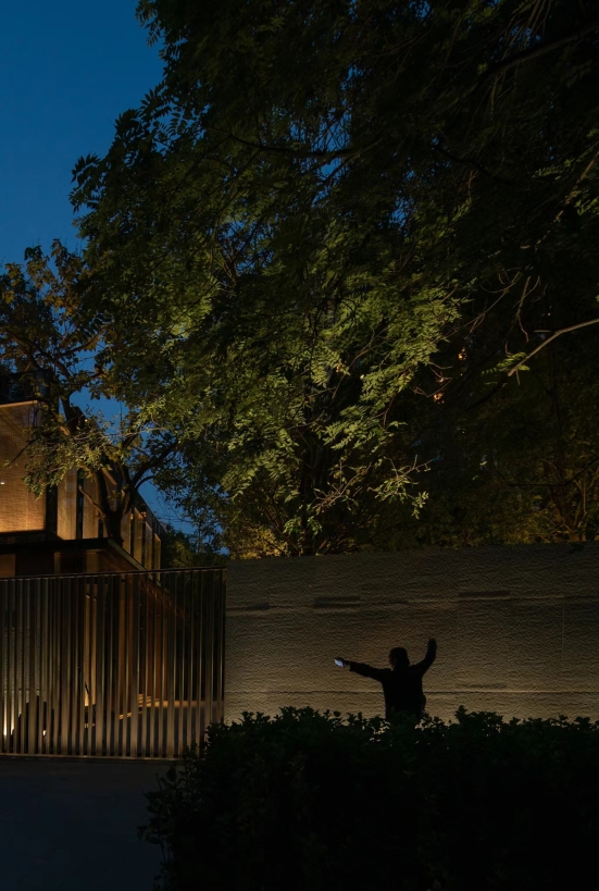 The glass curtain wall will naturally reflects the surrounding trees. By lighting up the large trees, the façade lighting automatically completed. With reflections, the whole building became part of the nature. After dusk, as the night deepens, the warm light from the interior slowly overflows and merges with the sunset glow of the branches. With light, the building is no longer a cold metal, but the spiritual core.