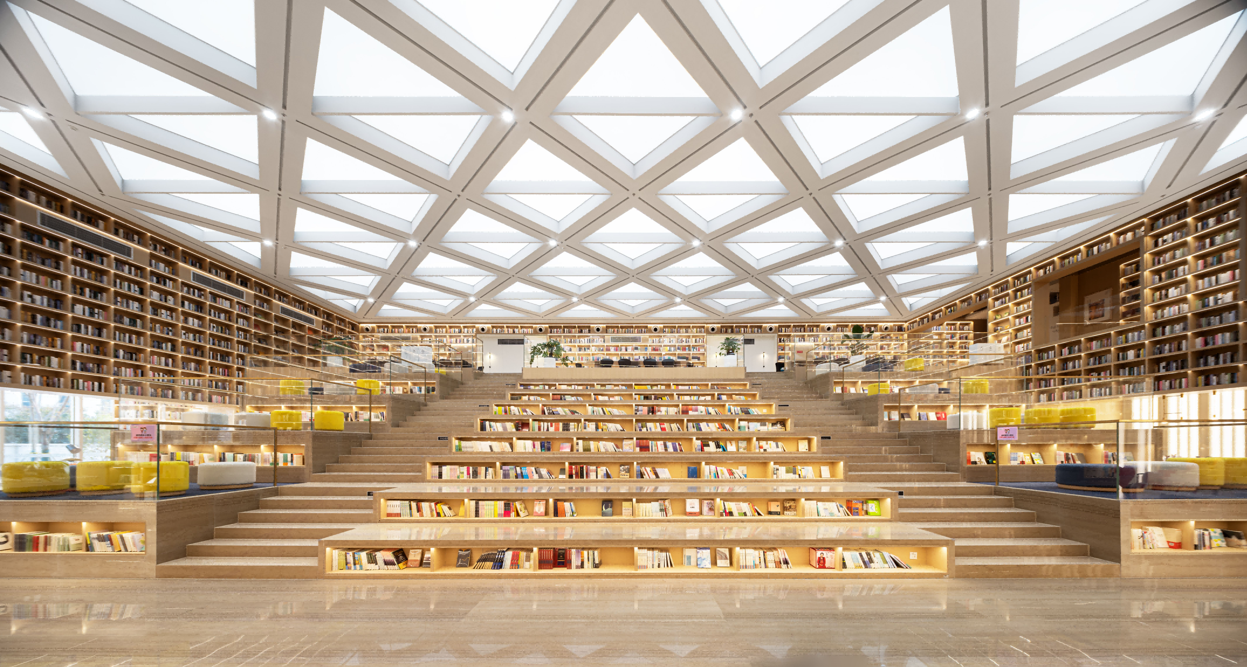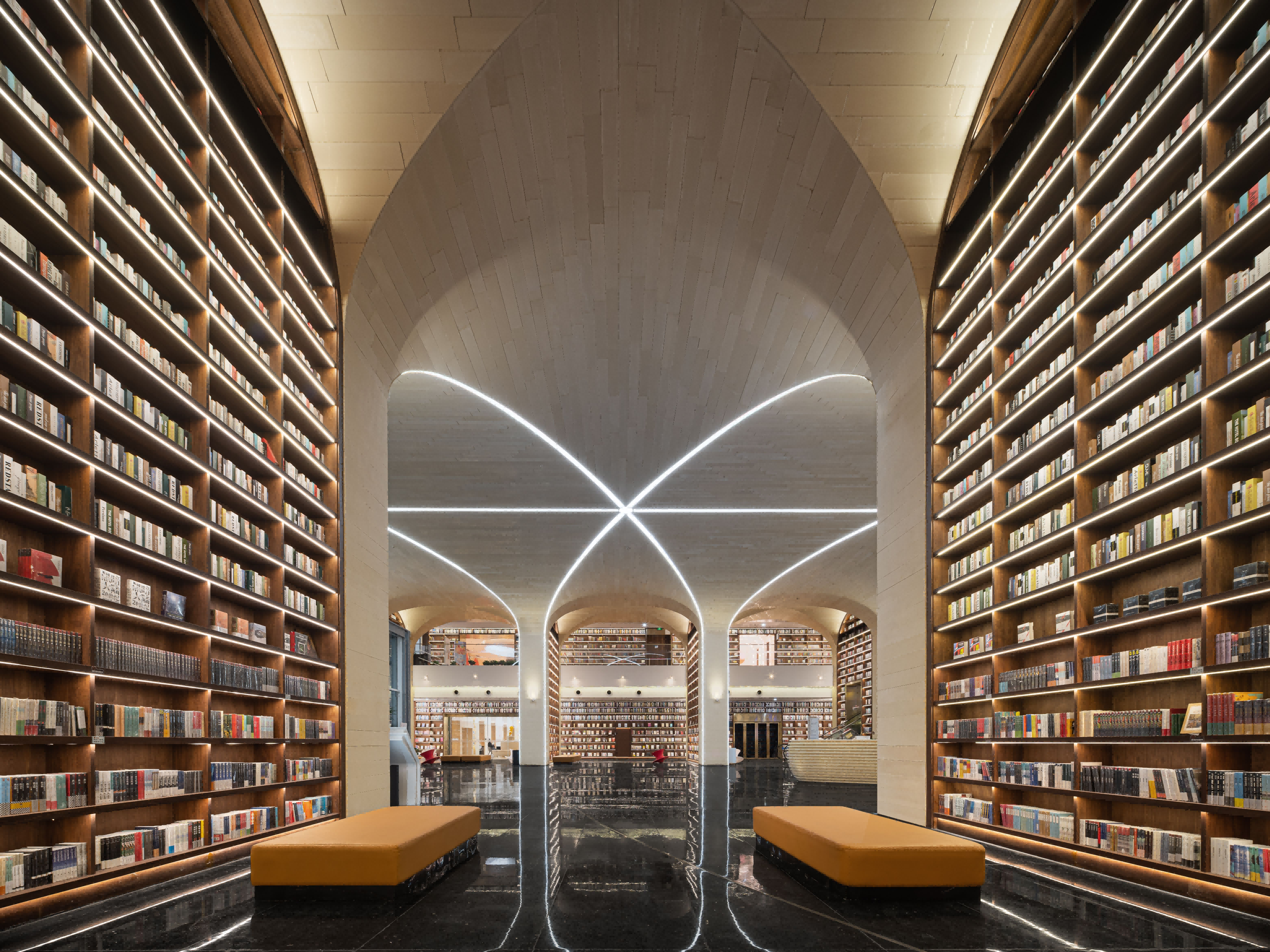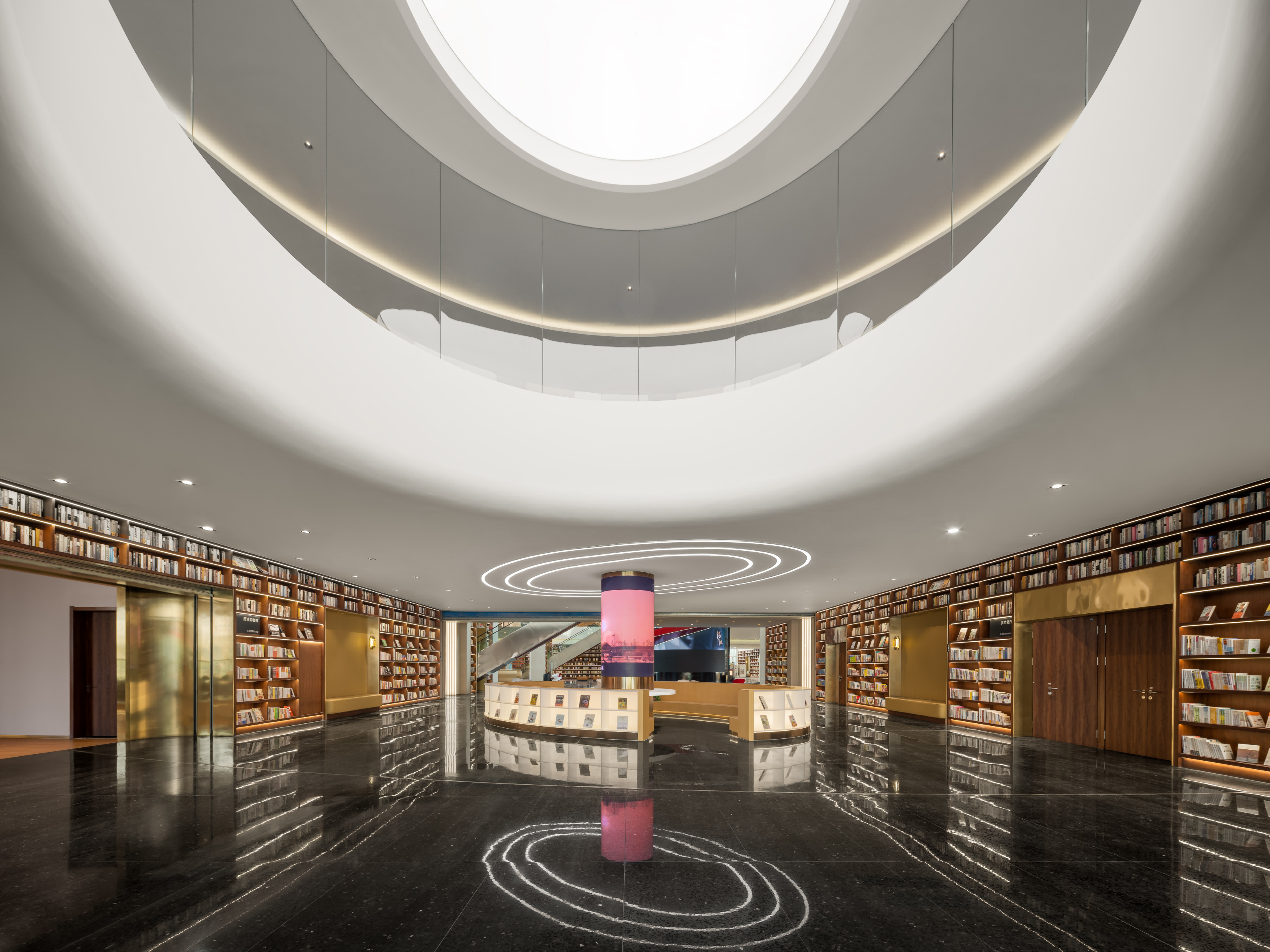 To make the lighting in the interior space of the library simple and environmental friendly, and strong in making shadows, we, based on the spatial characteristics of them, try to use the expression method which defines space by means of lighting. Take the hall as an example, whether the arc-shaped drawn films in the hall, or the acrylic materials in the connecting part, or the upright aluminum profiles with external corners are designed for the absence of hole-type lamps on the ceiling of the hall. On the bookshelves on both sides are even arranged with lamp bars at different locations to present the bookshelves and assist tourists in reading; moreover, the modelled glazing on the ceiling provides the space with unique tension and a strong force of expression.