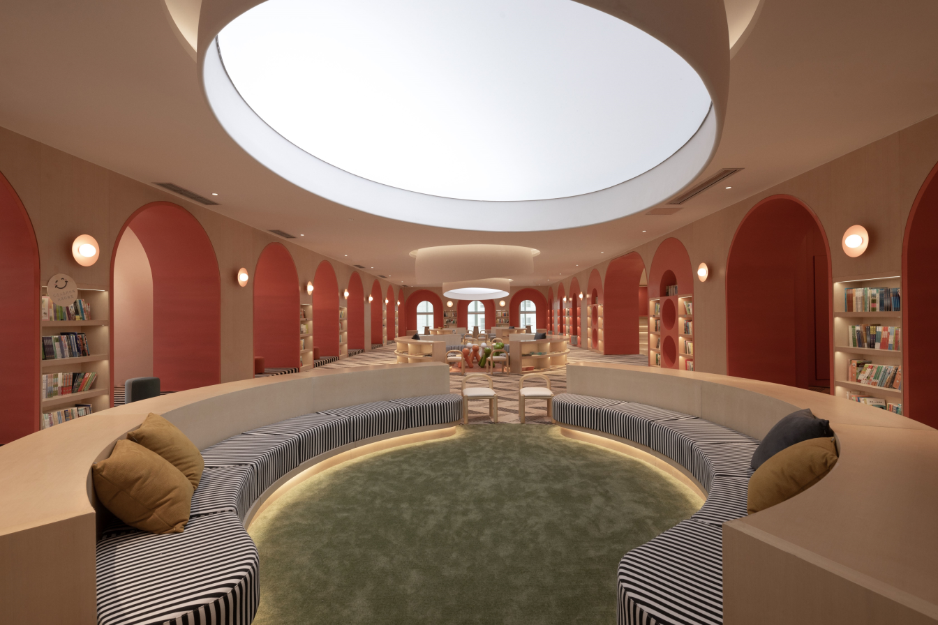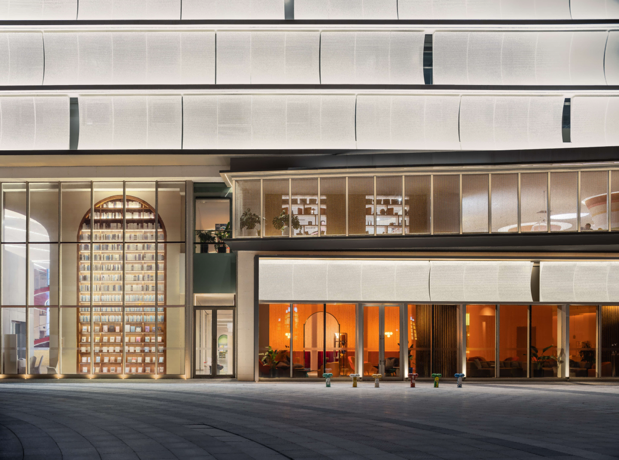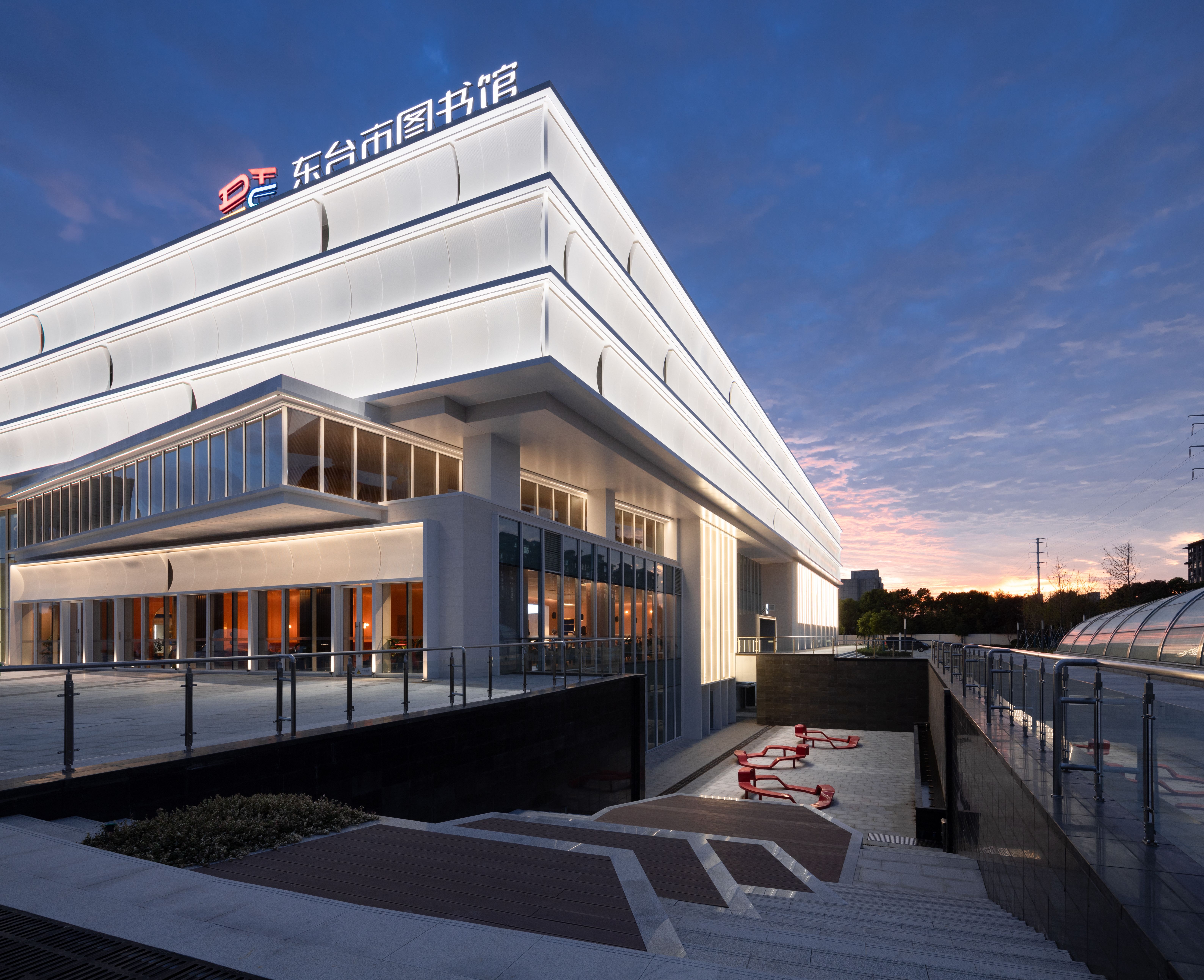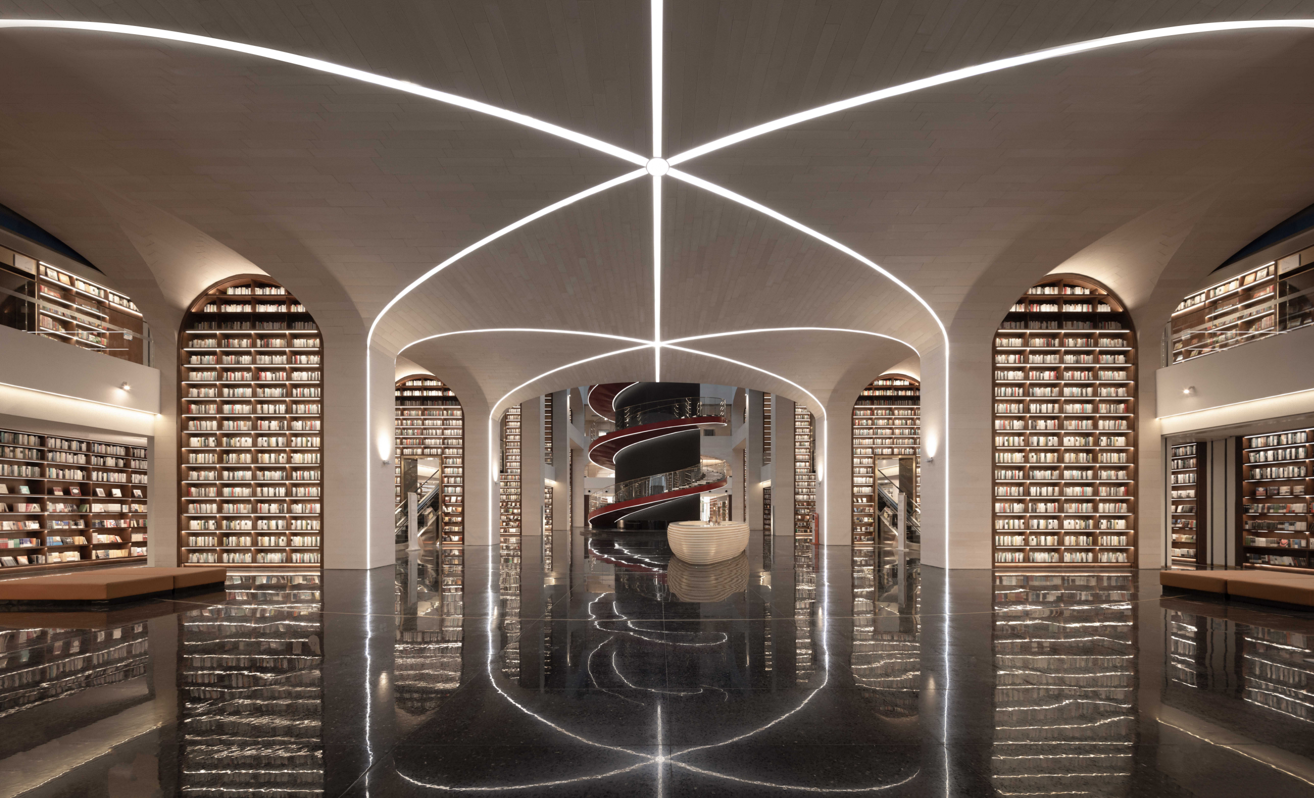 To make the lighting in the interior space of the library simple and environmental friendly, and strong in making shadows, we, based on the spatial characteristics of them, try to use the expression method which defines space by means of lighting. Take the hall as an example, whether the arc-shaped drawn films in the hall, or the acrylic materials in the connecting part, or the upright aluminum profiles with external corners are designed for the absence of hole-type lamps on the ceiling of the hall. On the bookshelves on both sides are even arranged with lamp bars at different locations to present the bookshelves and assist tourists in reading; moreover, the modelled glazing on the ceiling provides the space with unique tension and a strong force of expression.