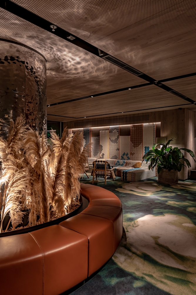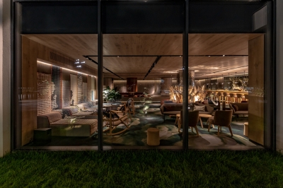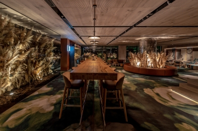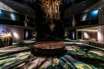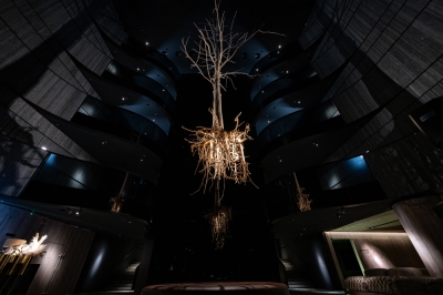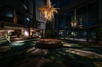 For this purpose, we had to specially design and manufacture individual lamps of several types, which are hidden in inconspicuous, non-random places on the walls and ceiling and even hidden in the long roots of trees, lenses, and secondary light-forming accessories to draw contrasting shadows on the walls and the floor with light, complementing the natural lobby atmosphere. In addition, we made the tree reflected in the dark glass, so this stunning sculpture seems to multiply itself into several copies thanks to the play of light, shadows, and reflections.