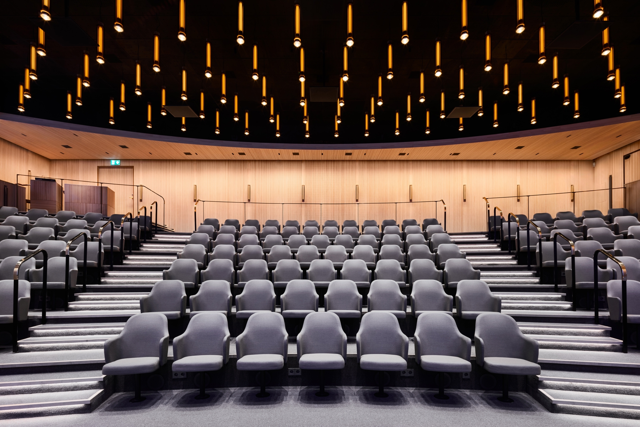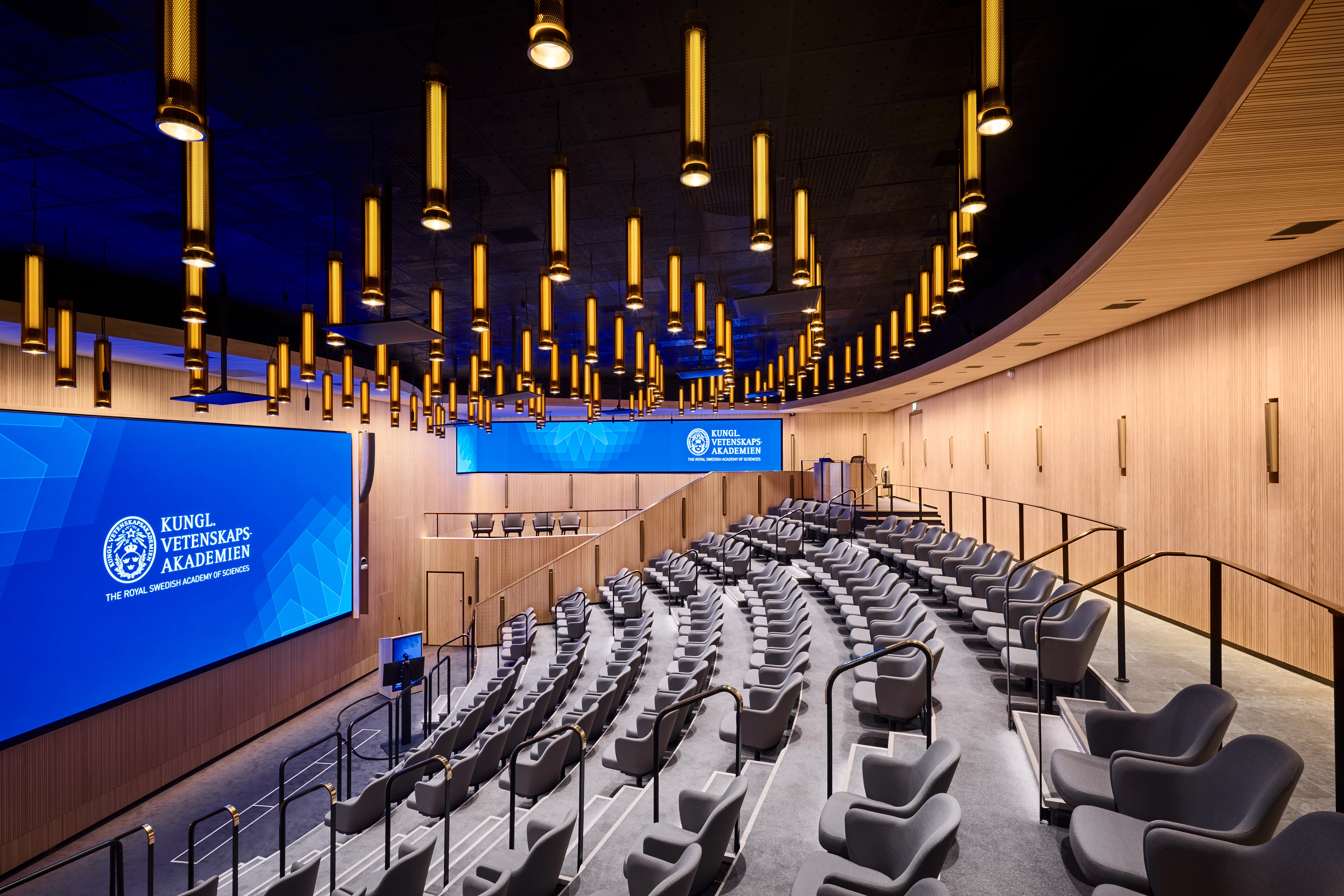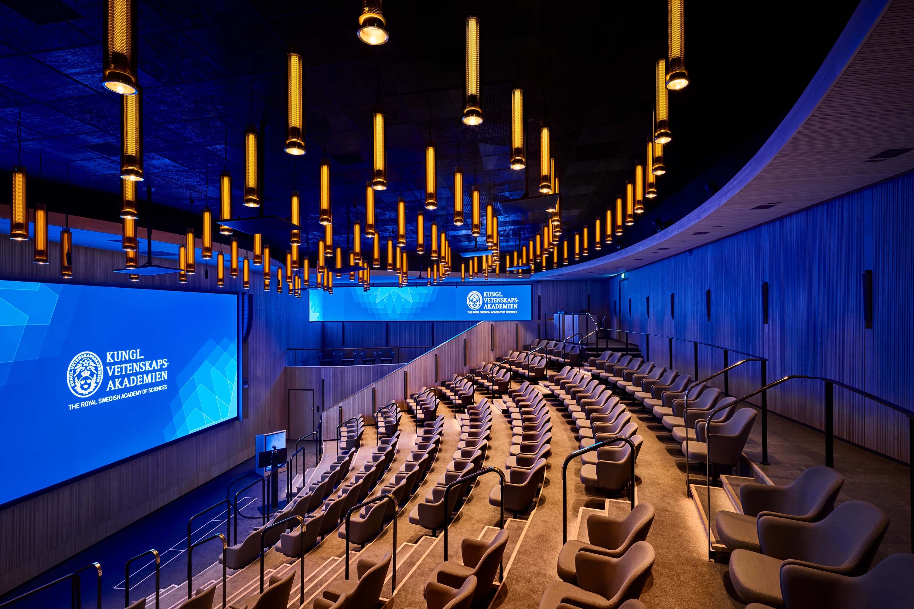 Entry DescriptionThe Swedish Royal Academy of Sciences, known for The Nobel Prizes in Physics and Chemistry, is located in a recently renovated heritage building. Illumination has been designed to achieve a high degree of visual comfort whilst enhancing spatial qualities. The Beijer Auditorium and lounge feature wooden wall panels with recessed lighting that create a peaceful and elegant setting. Lacking natural daylight, the Beijer Auditorium is defined by its new lighting scheme, programmed for different situations and needs. To shift attention from technical installations, the ceiling was designed as a new layer with bespoke pendant luminaires with brass mesh giving a soft glow to the auditorium. Besides the pendant luminaires, the auditorium is illuminated by vertical lighting along the outer walls and concealed, linear downlight fixtures in the ceiling as well as stairway illumination. A smaller and more intimate space can be created by extinguishing the wall washers. Illumination works dynamically adapting to the varying functions. The result is a thoughtful composition of general, ambient and accent lighting, creating atmosphere and well-being that can be sensed by all.