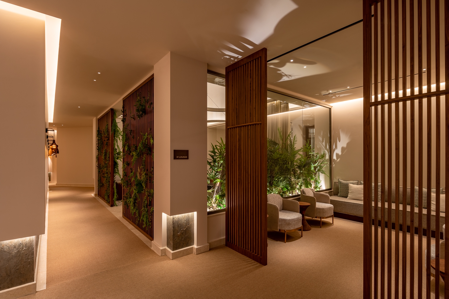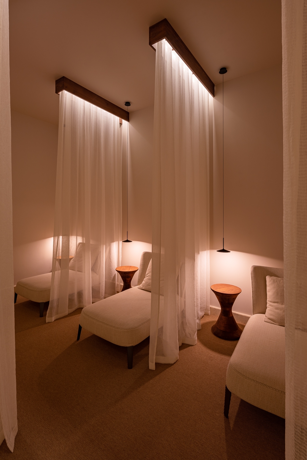 Decorative lighting elements are kept to a minimum to give space to a calmer space approach. With a striking exception being the glass sconces that signify the treatment rooms.