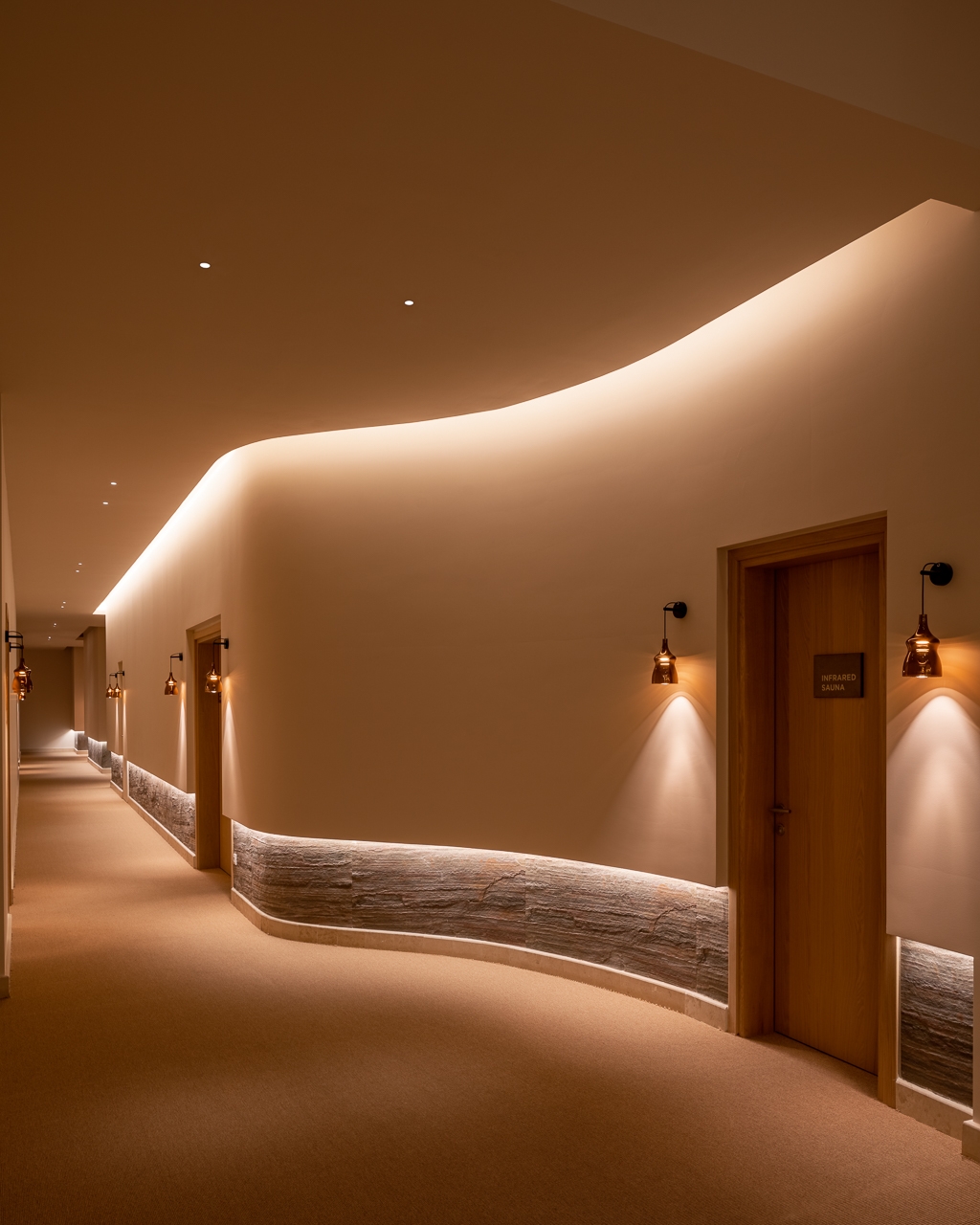 The lighting scheme of the project focuses on the experience of the user, the architectural space and the path the user follows from the moment he/she enters the spa till reaching the treatment room.